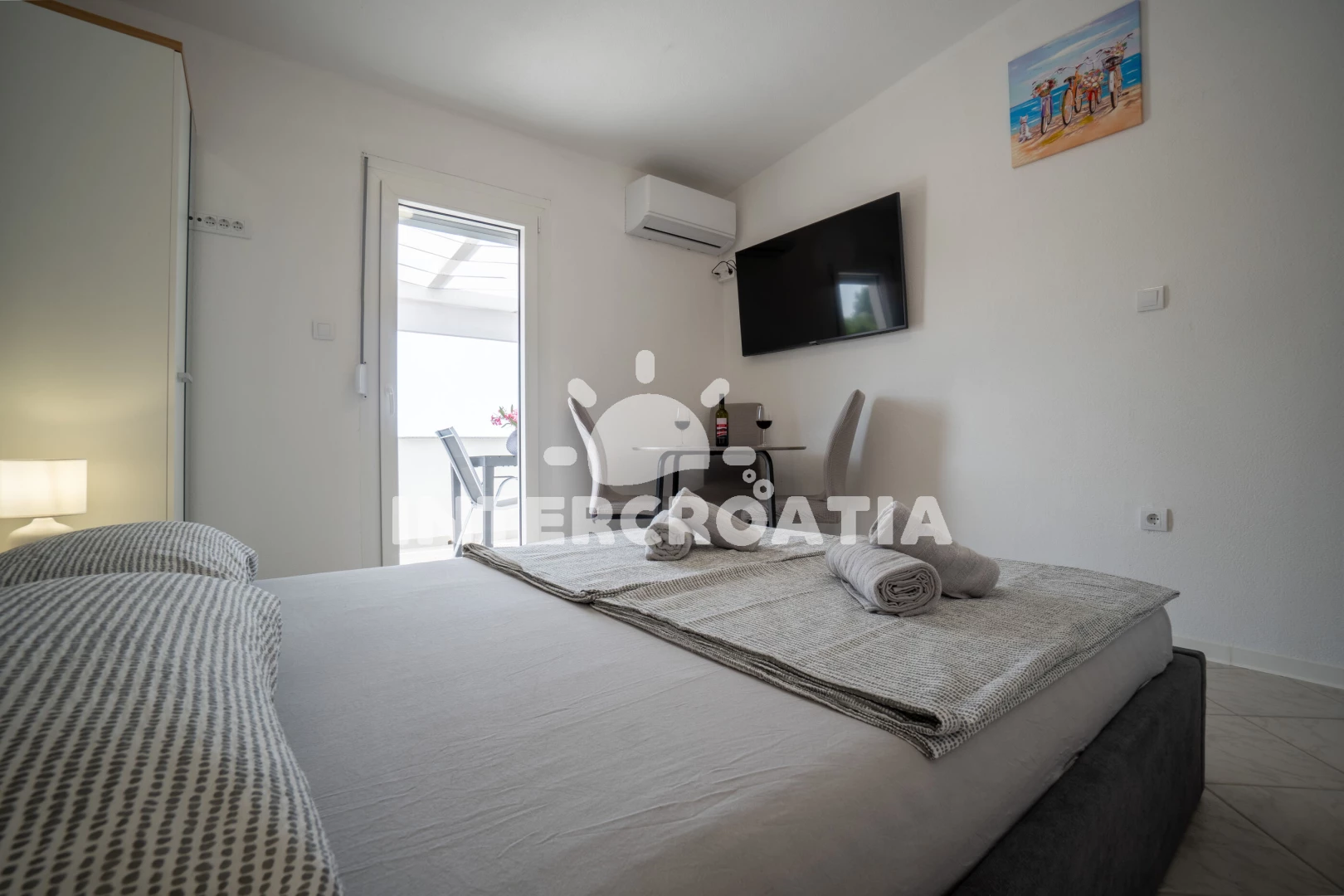 Apartmán se nachází 200 m od moře a pláže. Pláž je oblázková a betonové desky. U objektu je k dispozici společná zahrada s posezením a grilem. Parkování je před domem.