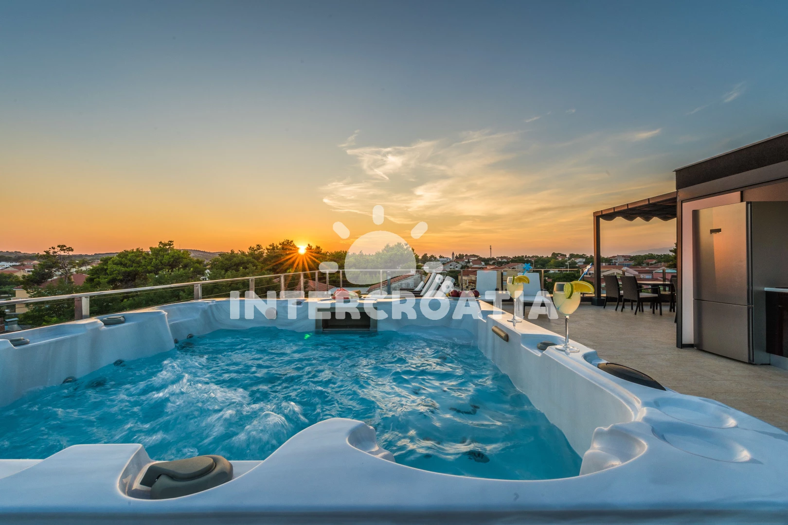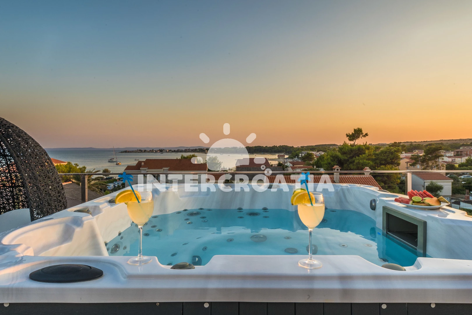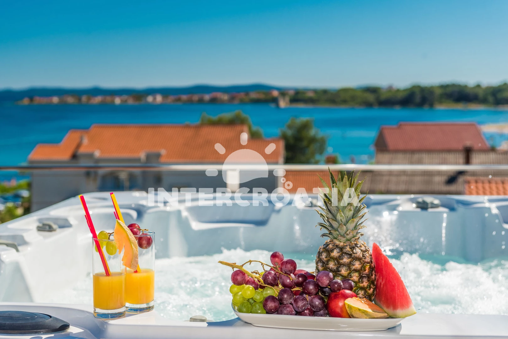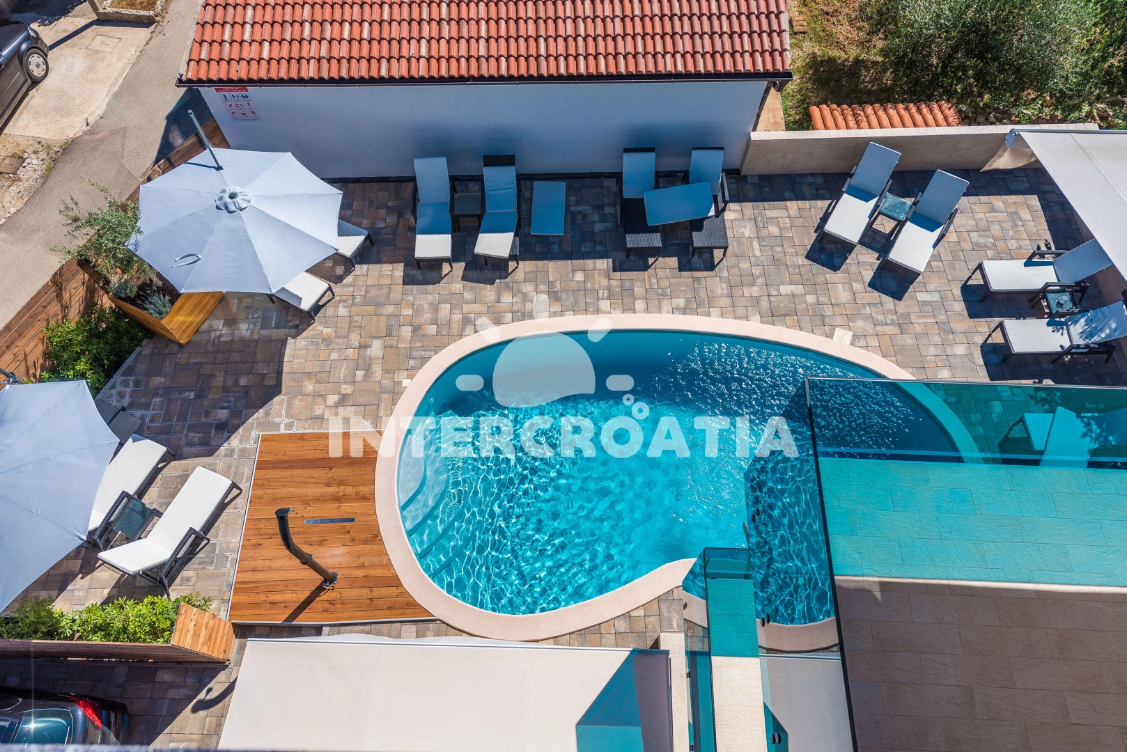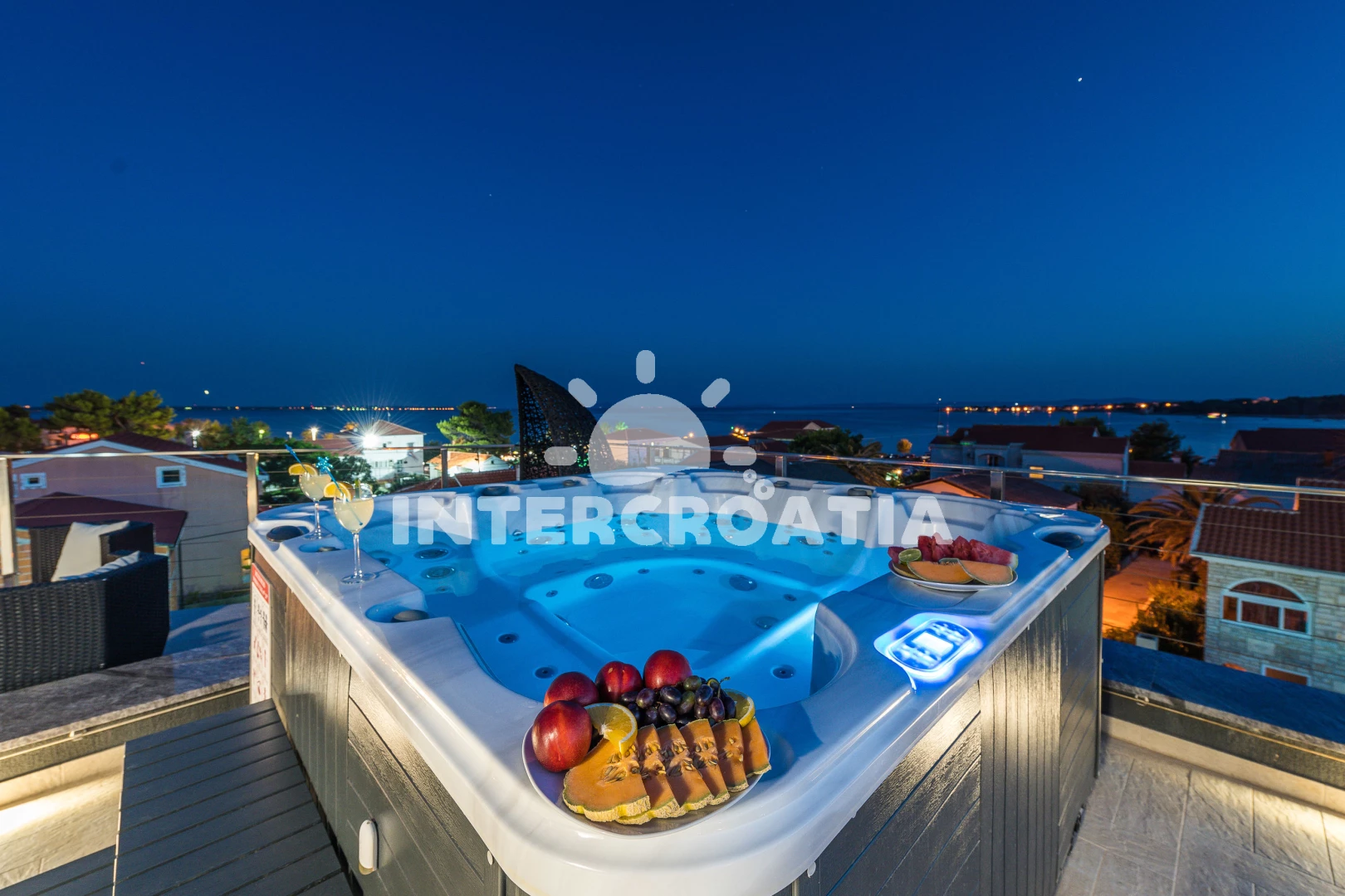 Apartmán se nachází 30 m od moře a pláže. Pláž je písčitá a oblázková. Apartmán disponuje bazénem s lehátky pro ubytované hosty. K dispozici vířivka. U objektu je k dispozici společná zahrada s posezením a grilem. Parkování je před domem.
