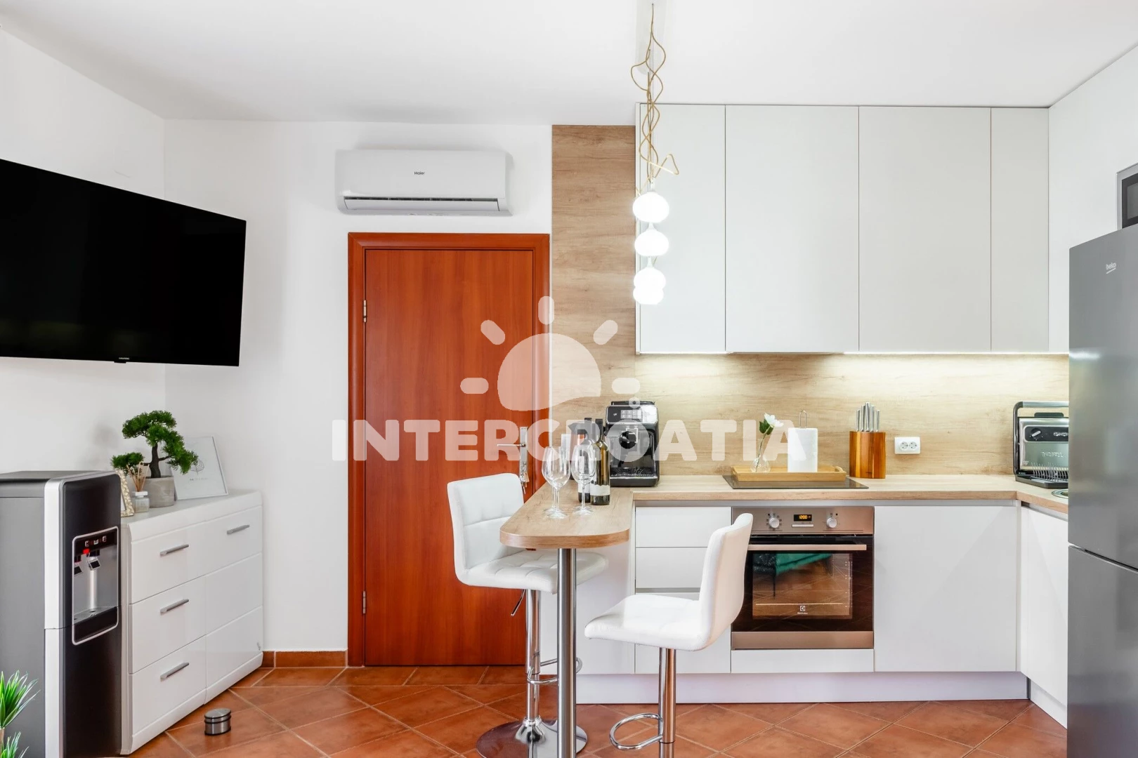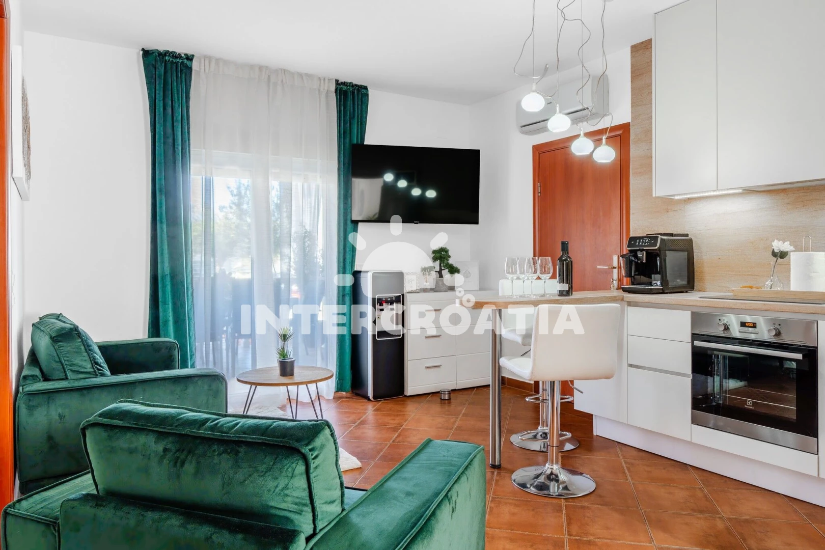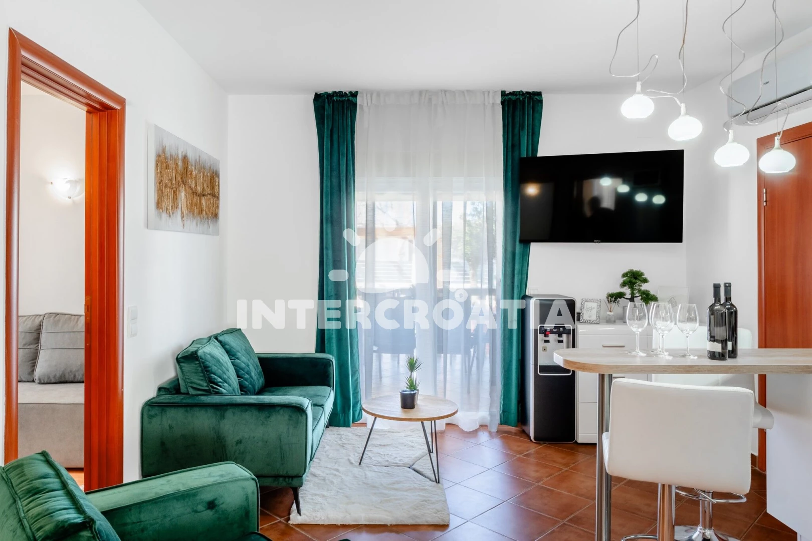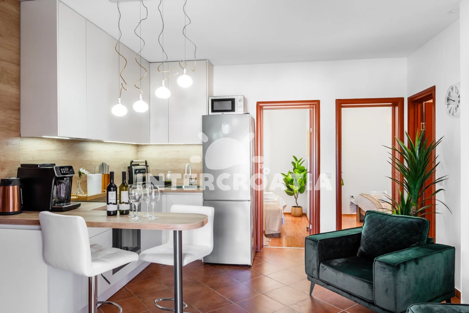 Apartmán (2) s terasou. Nachází se v objektu. Apartmán má 2 ložnice a je vhodný pro až 2 osoby. Kuchyňská linka je vybavena varnou deskou, troubou, toustovačem, kávovarem, myčkou na nádobí, mikrovlnnou troubou, rychlovarnou konvicí, nádobím, lednicí, mrazákem. V obývací místnosti je rozložitelná pohovka (extra lůžko pro osoby). K dispozici televize. První ložnice s dvoulůžky. Druhá ložnice s dvoulůžkem.