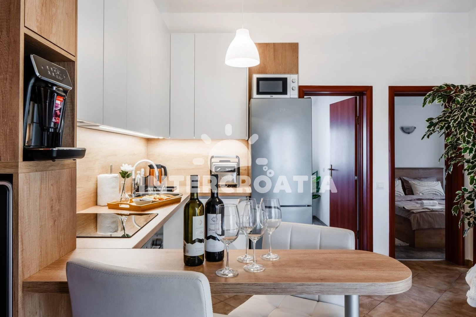 Apartmán (2) s terasou. Nachází se v objektu. Apartmán má 2 ložnice a je vhodný pro až 2 osoby. Kuchyňská linka je vybavena varnou deskou, troubou, toustovačem, kávovarem, myčkou na nádobí, mikrovlnnou troubou, rychlovarnou konvicí, nádobím, lednicí, mrazákem. V obývací místnosti je rozložitelná pohovka (extra lůžko pro osoby). K dispozici televize. První ložnice s dvoulůžky. Druhá ložnice s dvoulůžkem.