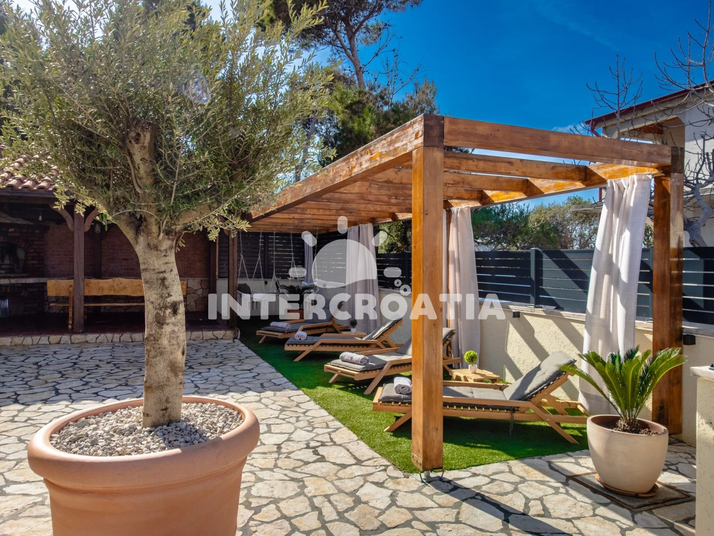 Apartmán se nachází 350 m od moře a pláže. Pláž je oblázková a betonové desky. U objektu je k dispozici společná zahrada s posezením a grilem. Parkování je před domem.