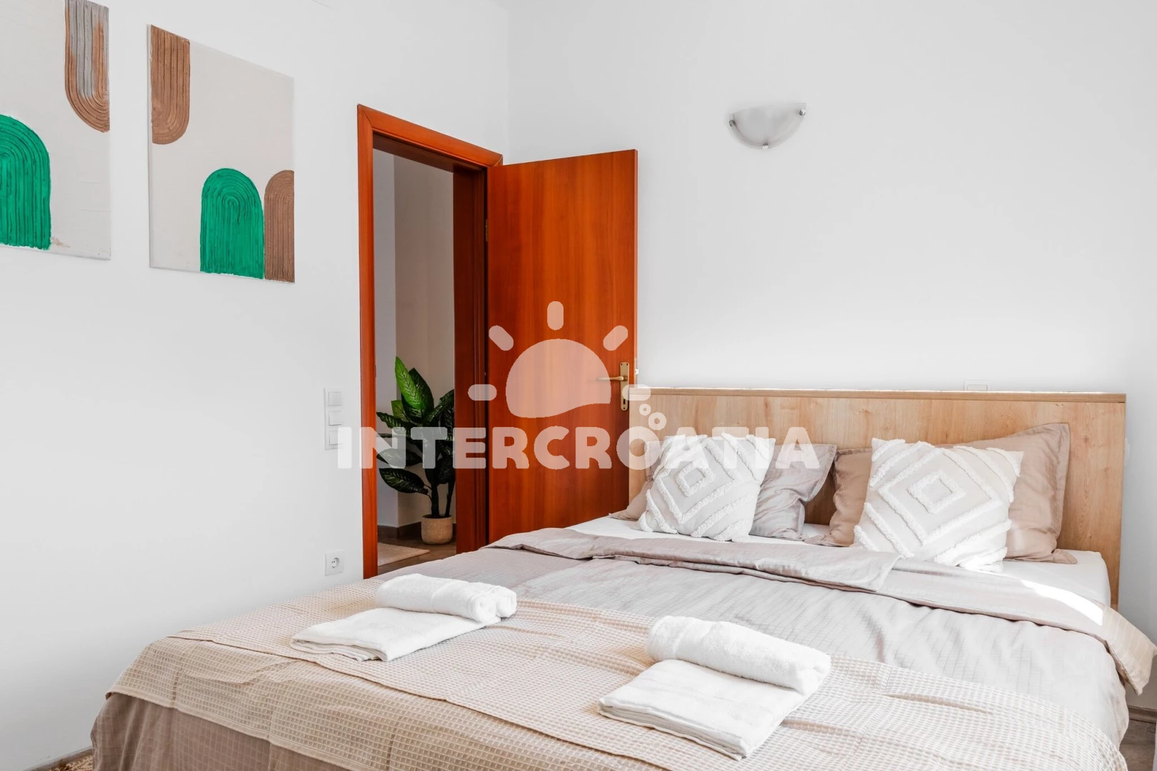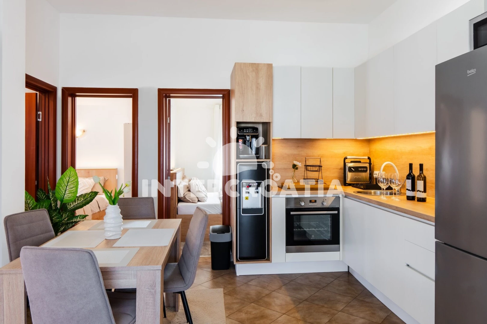 Apartmán (2) s terasou. Nachází se v objektu. Apartmán má 2 ložnice a je vhodný pro až 2 osoby. Kuchyňská linka je vybavena varnou deskou, troubou, toustovačem, kávovarem, myčkou na nádobí, mikrovlnnou troubou, rychlovarnou konvicí, nádobím, lednicí, mrazákem. V obývací místnosti je rozložitelná pohovka (extra lůžko pro osoby). K dispozici televize. První ložnice s dvoulůžky. Druhá ložnice s dvoulůžkem.