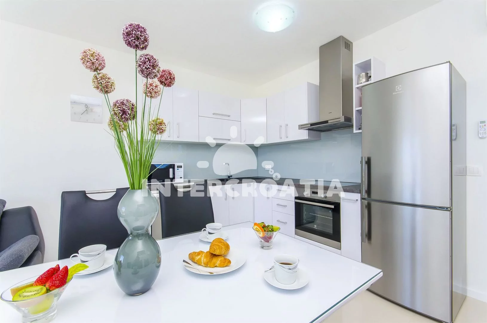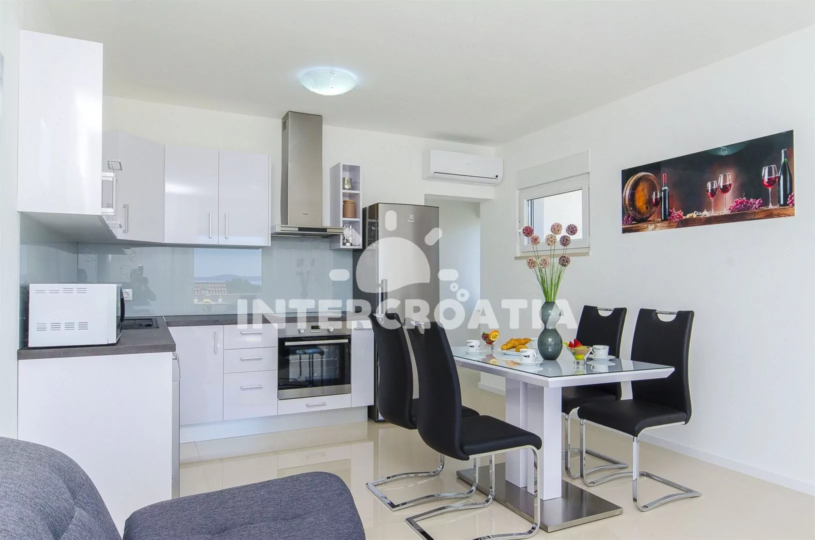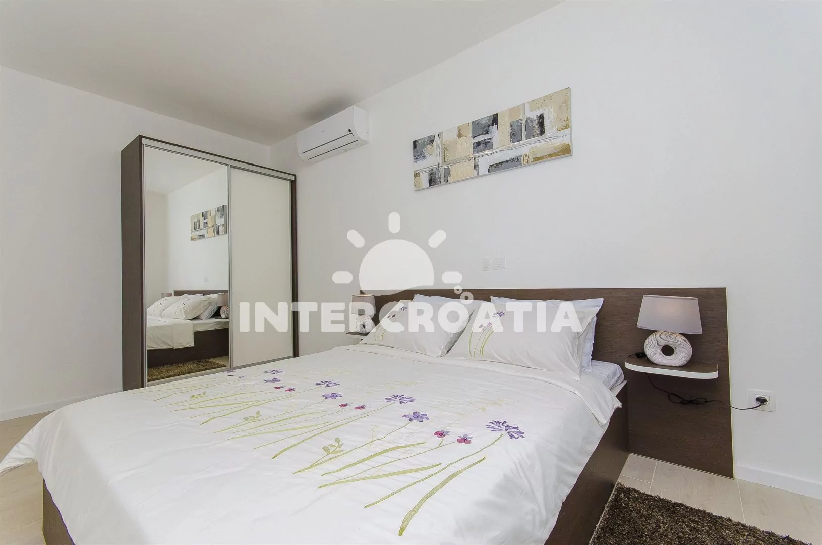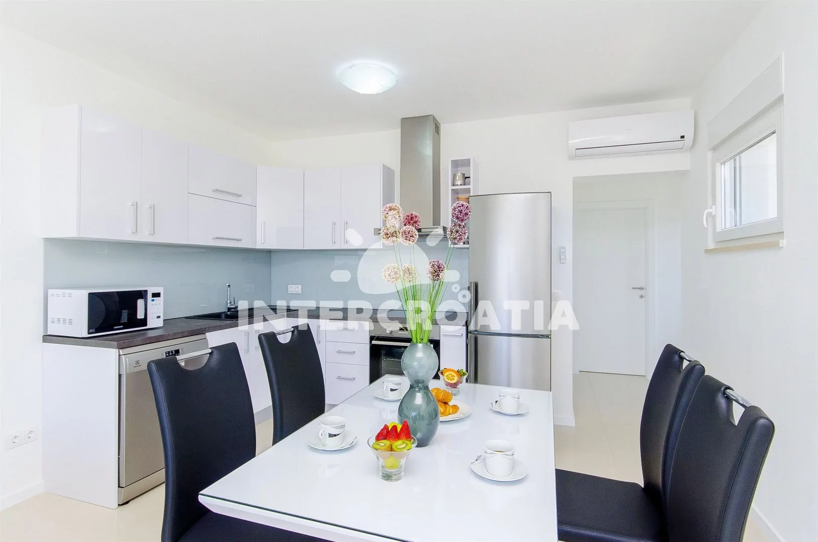 Komfortní moderní třípokojový apartmán (75 m2) s terasou s posezením, nacházející se v 1. patře domu. Obývací pokoj spojený s kuchyní. Kuchyňská linka se sklokeramickou varnou deskou, troubou, mikrovlnnou troubou, lednicí s mrazákem, kávovarem, rychlovarnou konvicí, toustovačem, nádobím a myčkou na nádobí. Obývací pokoj s jídelním stolem pro 4 osoby, pohovkou (rozložitelná na extra lůžko pro 2 osoby), rádiem a LCD televizí se satelitem. Dvě ložnice, každá s dvoulůžkem. Koupelna se sprchovým koutem, umyvadlem a wc. Hosté mají k dispozici terasu s posezením, v zahradě společný zapuštěný bazén s lehátky a pergolu s grilem. Parkování u objektu.