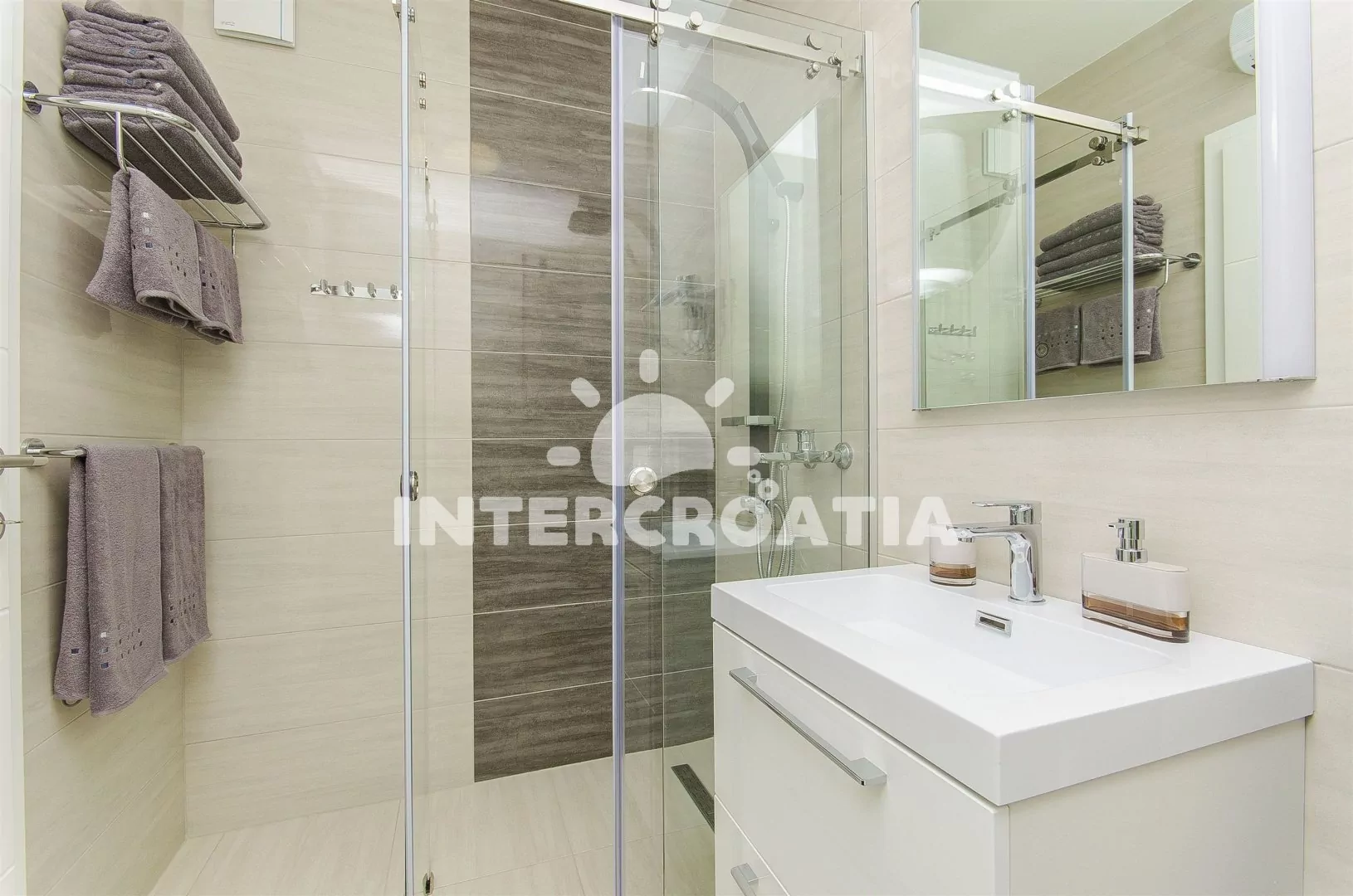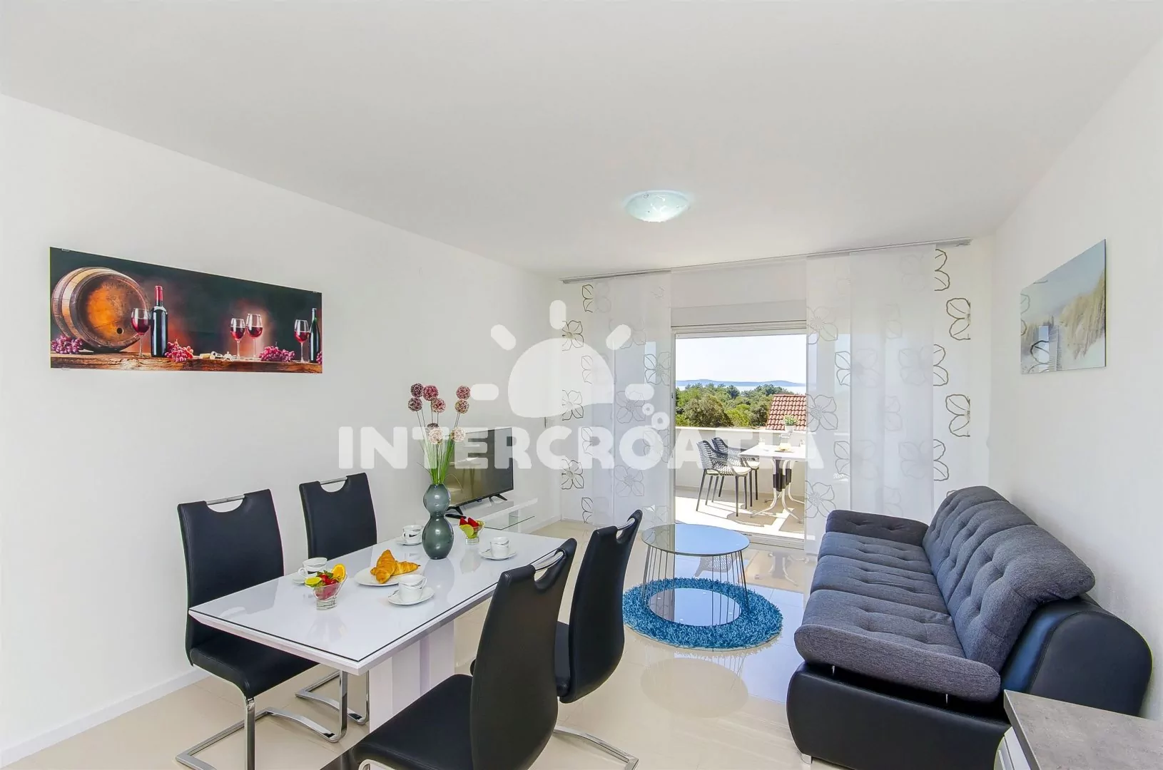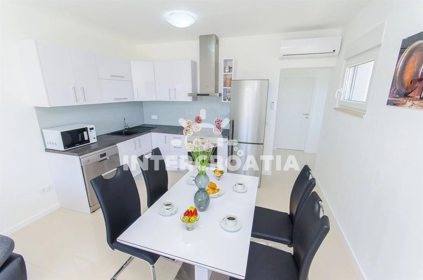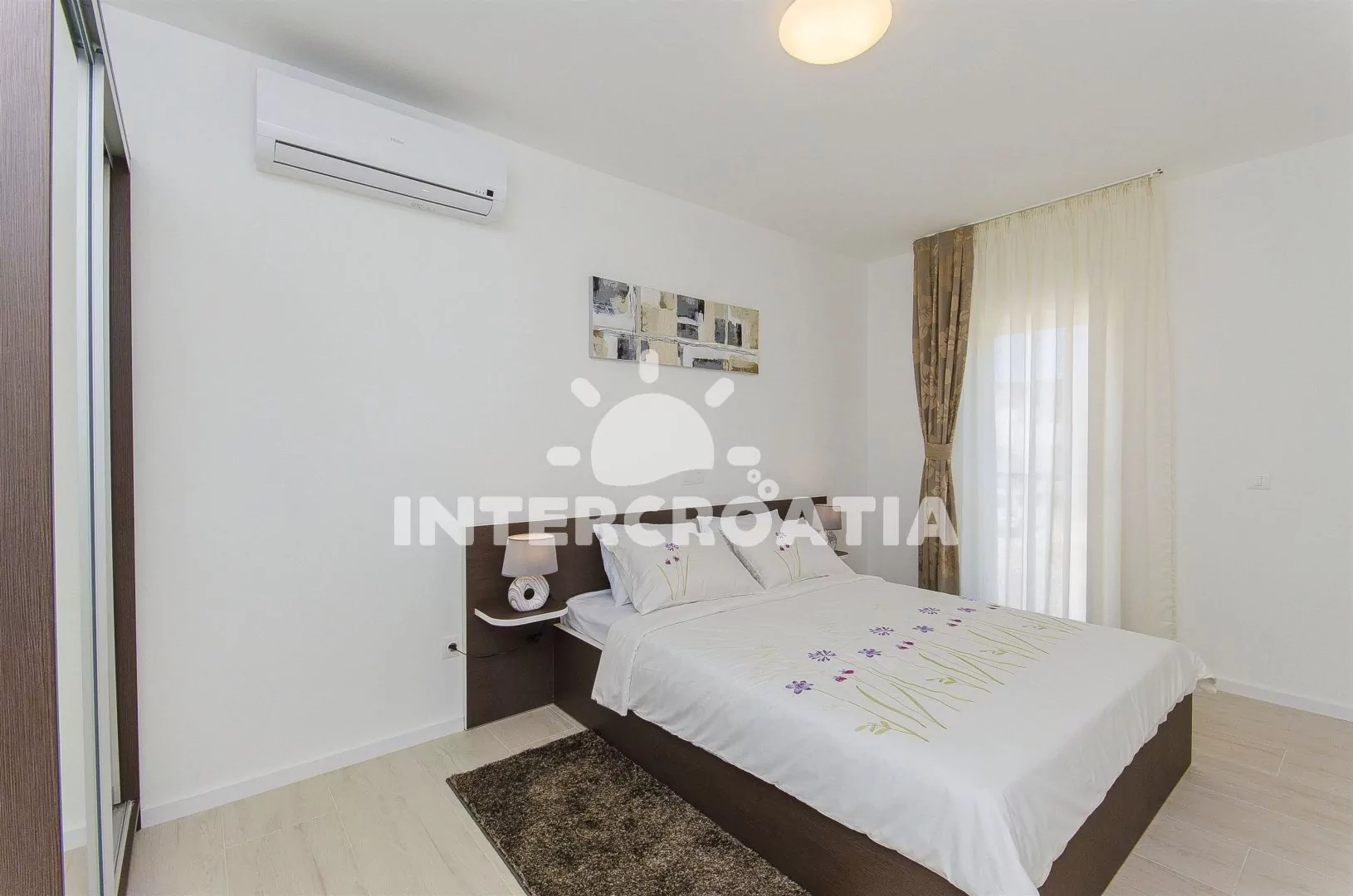 Komfortní moderní třípokojový apartmán (75 m2) s terasou s posezením, nacházející se v 1. patře domu. Obývací pokoj spojený s kuchyní. Kuchyňská linka se sklokeramickou varnou deskou, troubou, mikrovlnnou troubou, lednicí s mrazákem, kávovarem, rychlovarnou konvicí, toustovačem, nádobím a myčkou na nádobí. Obývací pokoj s jídelním stolem pro 4 osoby, pohovkou (rozložitelná na extra lůžko pro 2 osoby), rádiem a LCD televizí se satelitem. Dvě ložnice, každá s dvoulůžkem. Koupelna se sprchovým koutem, umyvadlem a wc. Hosté mají k dispozici terasu s posezením, v zahradě společný zapuštěný bazén s lehátky a pergolu s grilem. Parkování u objektu.