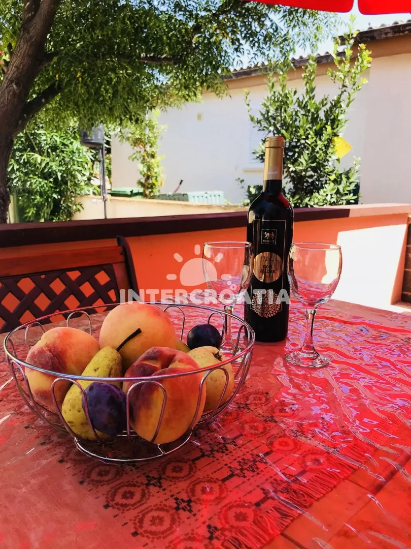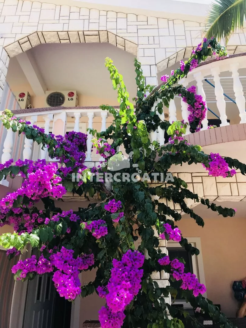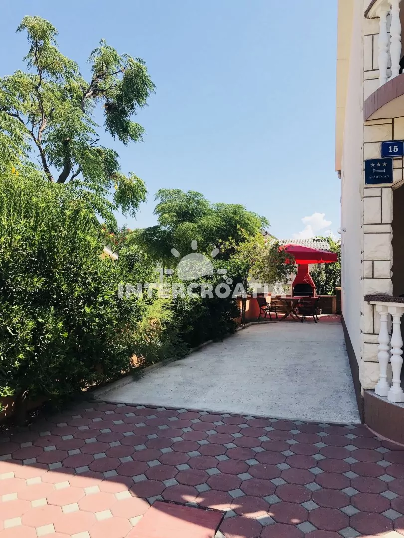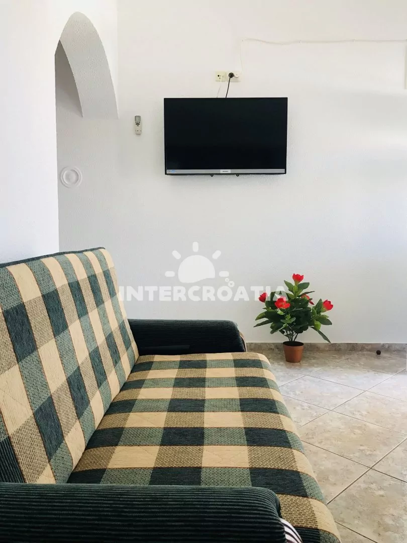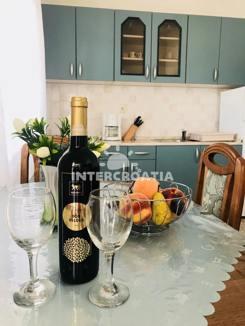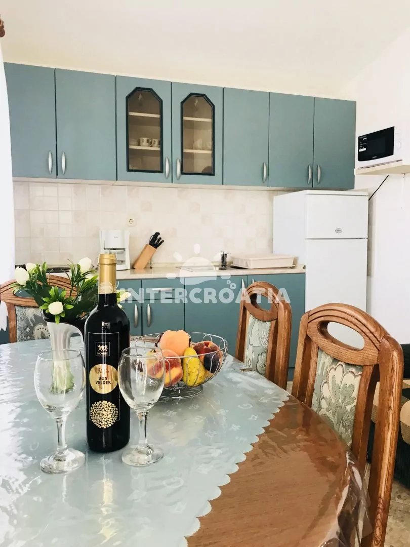 Apartmán (60 m2) v prvním patře domu s terasou a výhledem do klidné ulice je vhodný pro 4 až 5 osob. Obývací pokoj je spojený s kuchyní. Kuchyňská linka je vybavena sporákem, kávovarem, mikrovlnnou troubou, nádobím a lednicí s mrazákem. Obývací pokoj s jídelním stolem, pohovkou (rozložitelná na extra lůžko pro 1 osobu), televizí se satelitním programem, klimatizací a vstupem na terasu. První ložnice s jedním dvoulůžkem. Druhá ložnice s dvěma jednolůžky. Koupelna se sprchovým koutem, umyvadlem, fénem a wc. Hostům je k dispozici parkování u objektu zdarma.