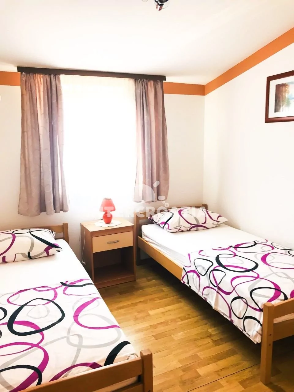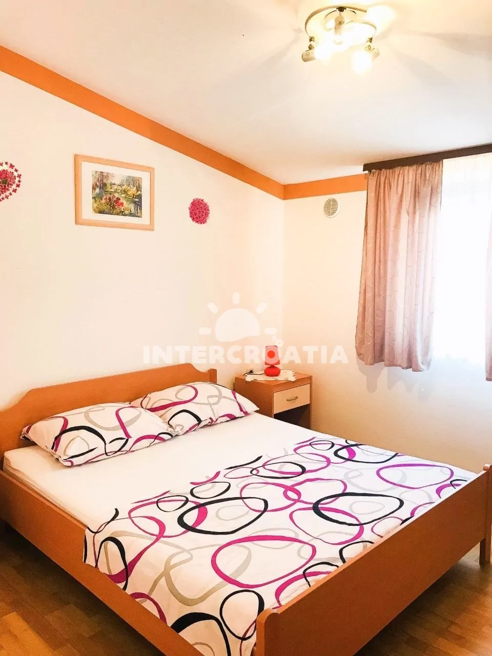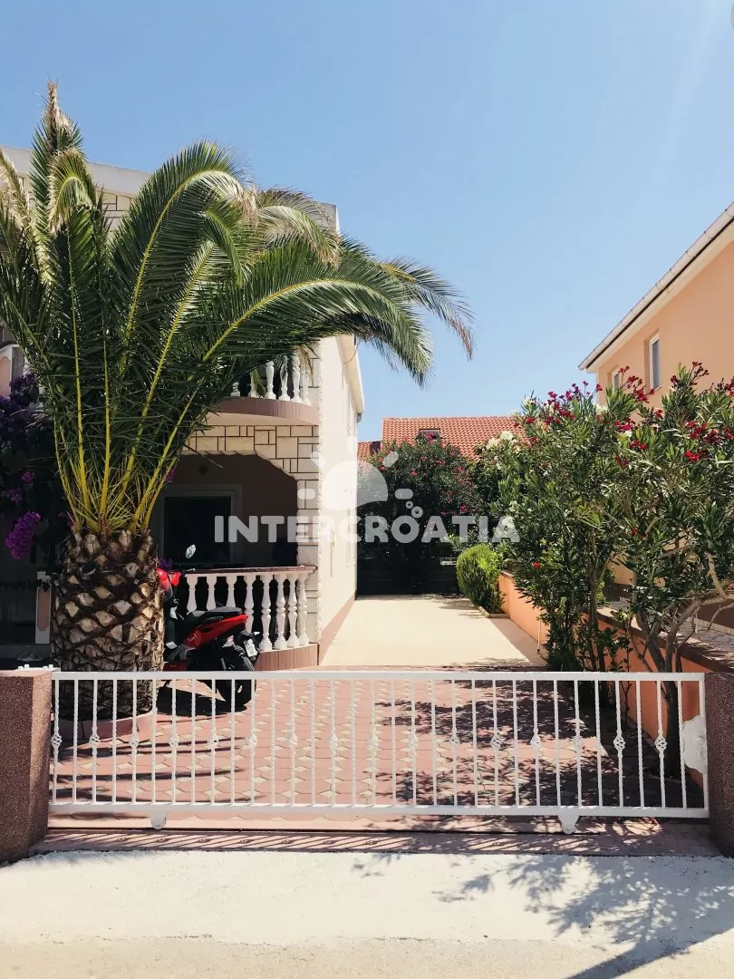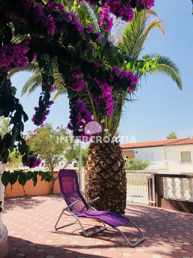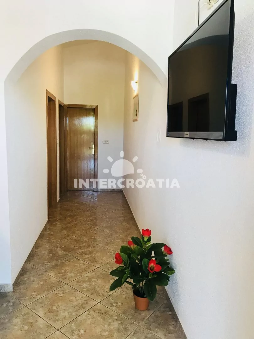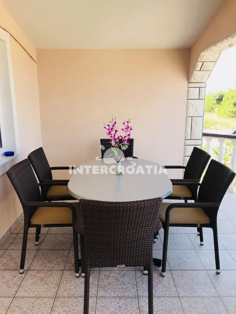 Apartmán (60 m2) v prvním patře domu s terasou a výhledem do klidné ulice je vhodný pro 4 až 5 osob. Obývací pokoj je spojený s kuchyní. Kuchyňská linka je vybavena sporákem, kávovarem, mikrovlnnou troubou, nádobím a lednicí s mrazákem. Obývací pokoj s jídelním stolem, pohovkou (rozložitelná na extra lůžko pro 1 osobu), televizí se satelitním programem, klimatizací a vstupem na terasu. První ložnice s jedním dvoulůžkem. Druhá ložnice s dvěma jednolůžky. Koupelna se sprchovým koutem, umyvadlem, fénem a wc. Hostům je k dispozici parkování u objektu zdarma.