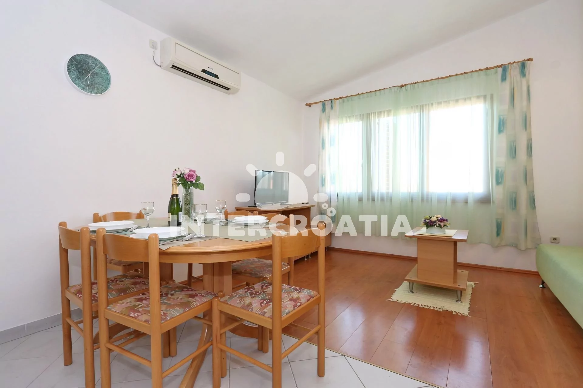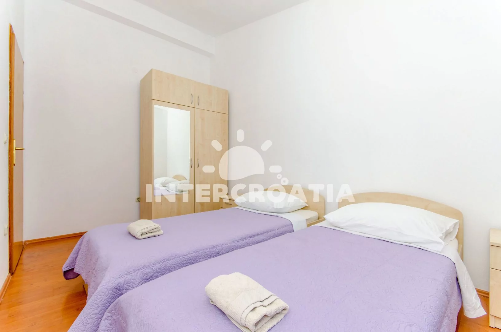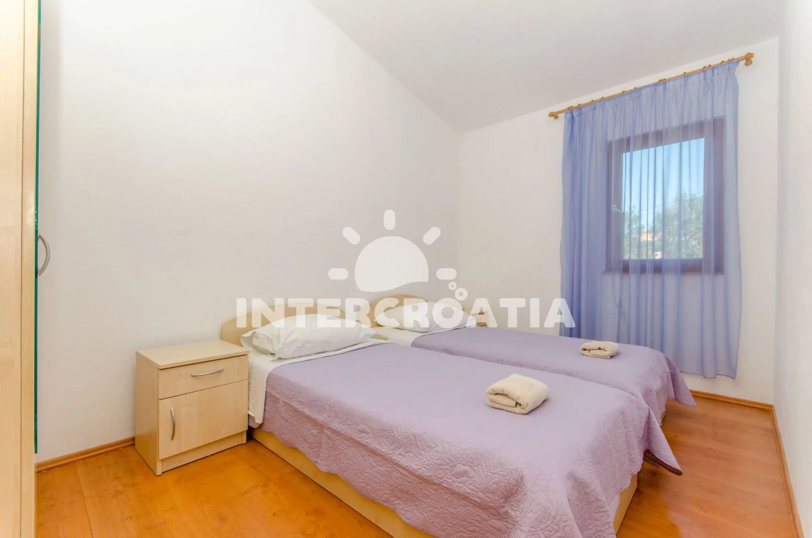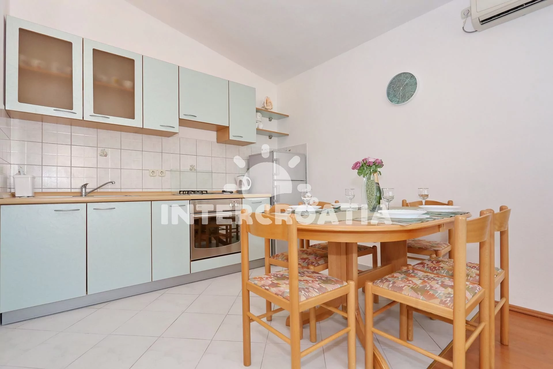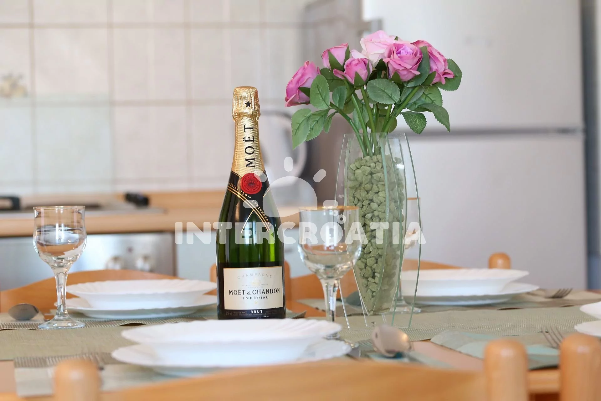 Apartmán (65 m2) s balkonem, částečným výhledem na moře se nachází v 1. patře vily a je vhodný pro 4 až 5 osob. Obývací pokoj je spojený s kuchyní. Kuchyňská linka je vybavena varnou deskou, vestavěnou troubou, rychlovarnou konvicí, mikrovlnnou troubou, nádobím a lednicí s mrazákem. Obývací pokoj s jídelním stolem pro 6 osob, pohovkou (rozložitelná na extra lůžko pro 1 osobu), televizí se satelitním programem a klimatizací. První ložnice s dvoulůžkem a vstupem na balkon. Druhá ložnice s dvěma jednolůžky. Koupelna se sprchovým koutem, umyvadlem, fénem, bidetem a wc. Dále samostatné wc s umyvadlem. Hostům je k dispozici parkování u objektu zdarma.