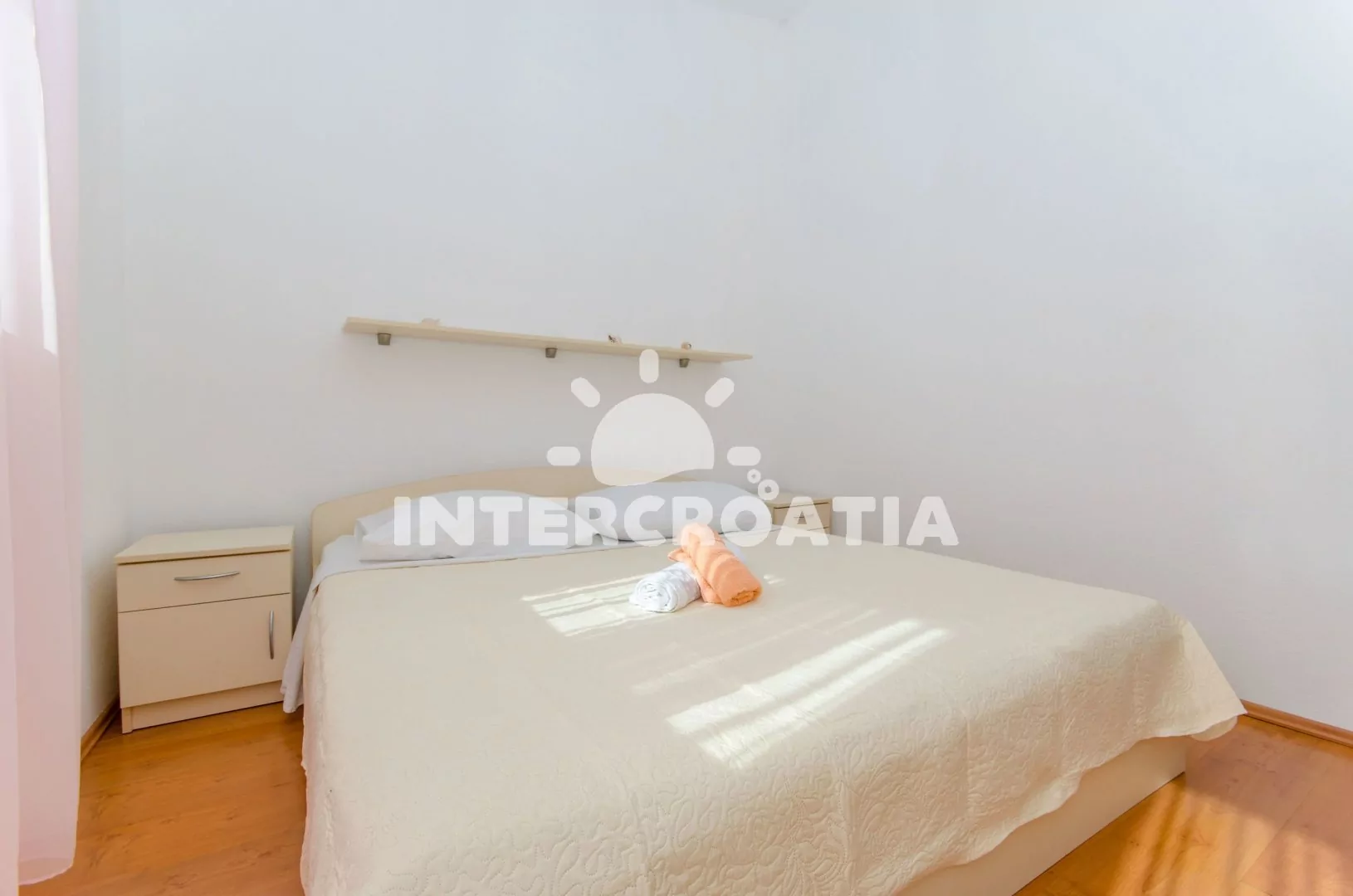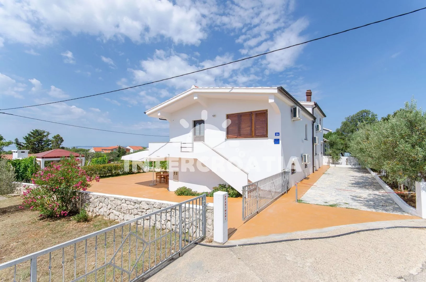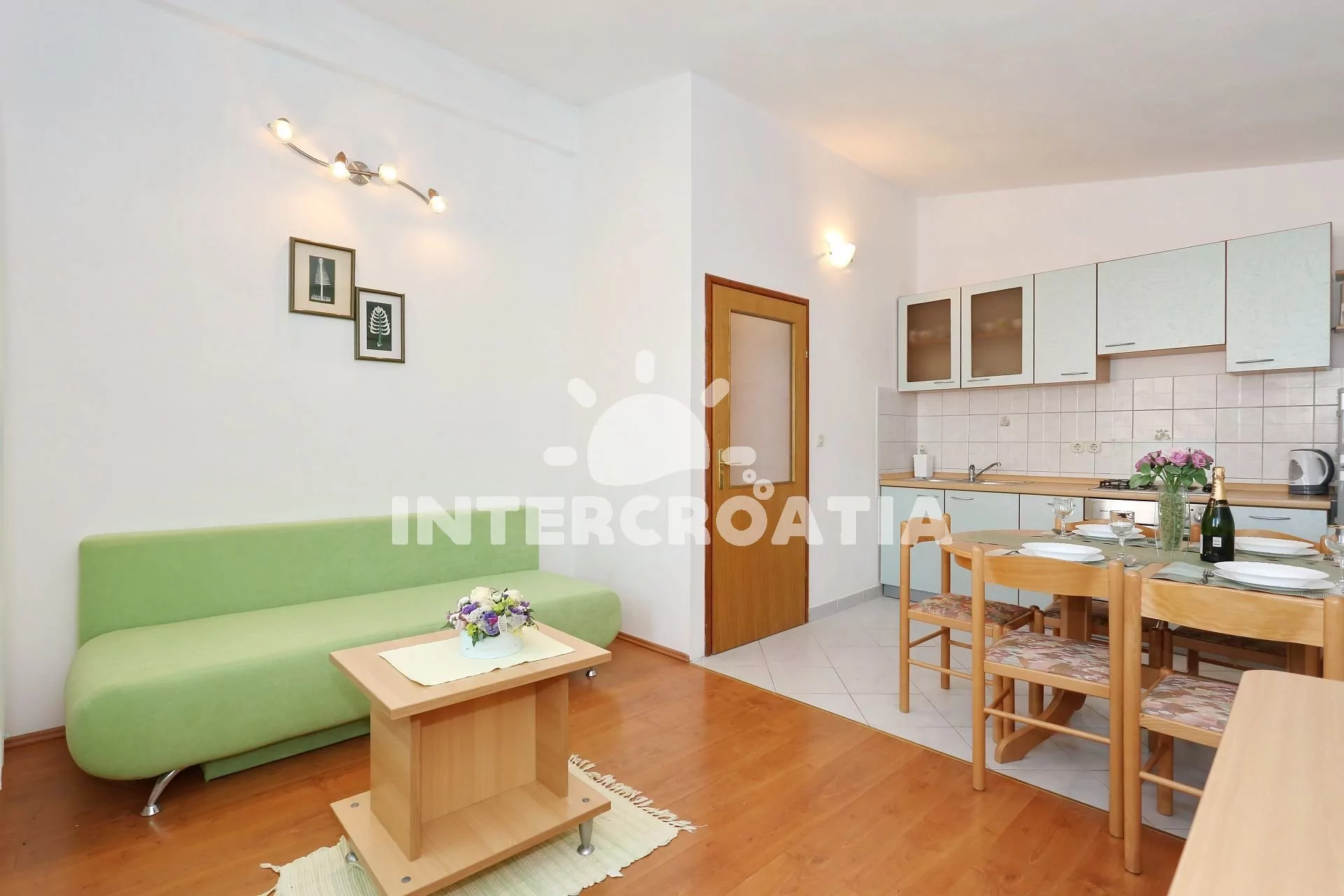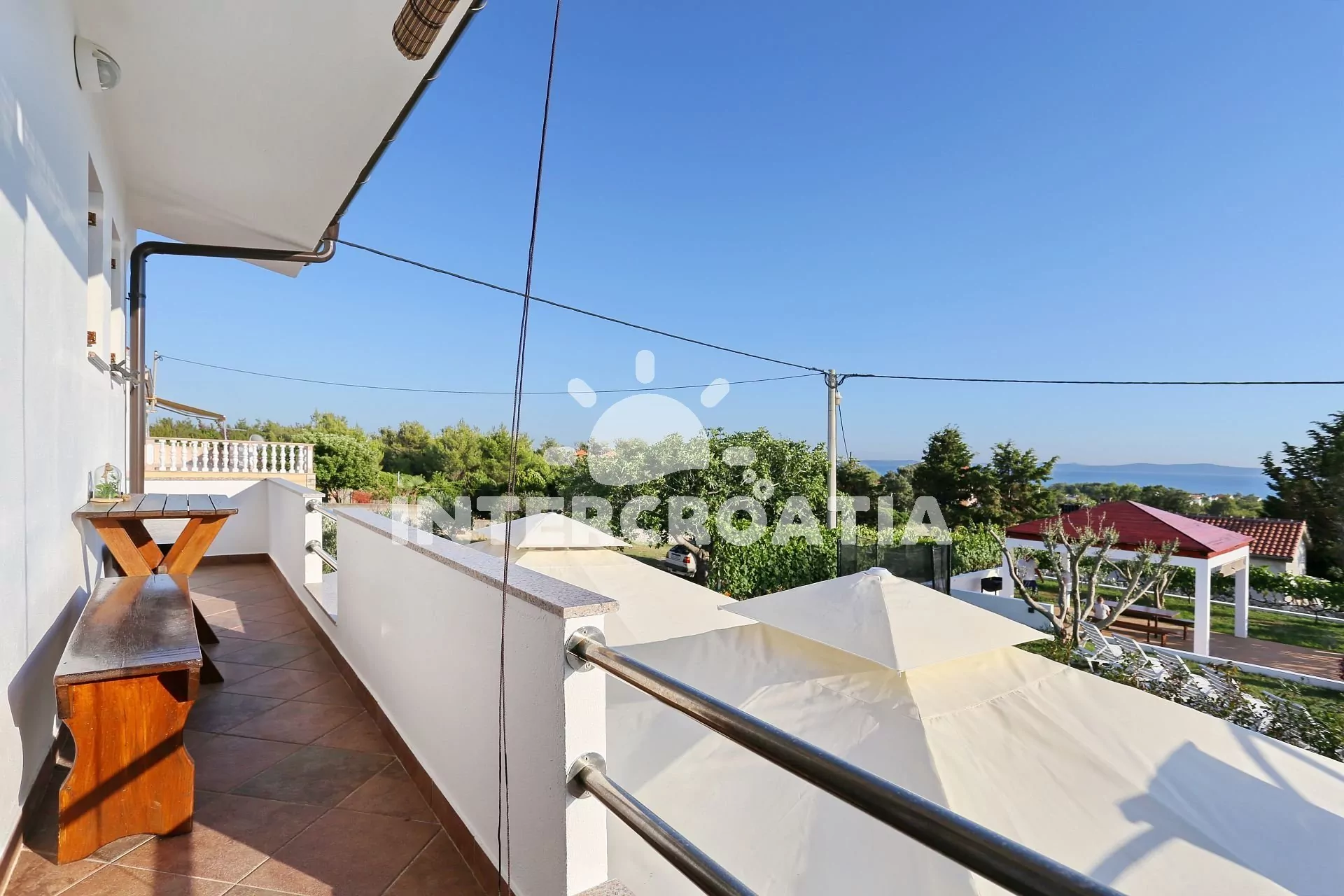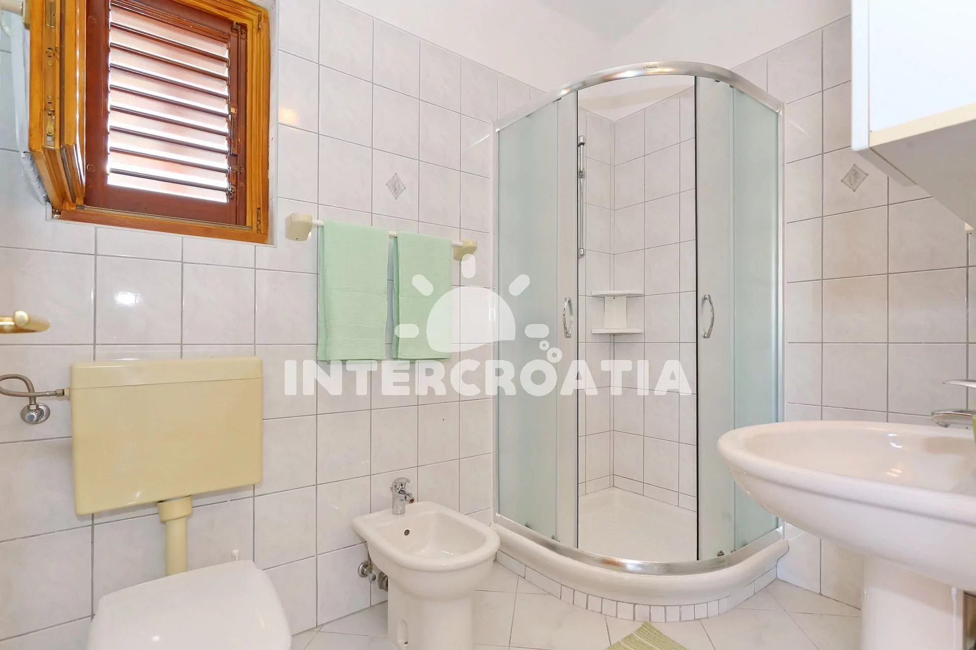 Apartmán (65 m2) s balkonem, částečným výhledem na moře se nachází v 1. patře vily a je vhodný pro 4 až 5 osob. Obývací pokoj je spojený s kuchyní. Kuchyňská linka je vybavena varnou deskou, vestavěnou troubou, rychlovarnou konvicí, mikrovlnnou troubou, nádobím a lednicí s mrazákem. Obývací pokoj s jídelním stolem pro 6 osob, pohovkou (rozložitelná na extra lůžko pro 1 osobu), televizí se satelitním programem a klimatizací. První ložnice s dvoulůžkem a vstupem na balkon. Druhá ložnice s dvěma jednolůžky. Koupelna se sprchovým koutem, umyvadlem, fénem, bidetem a wc. Dále samostatné wc s umyvadlem. Hostům je k dispozici parkování u objektu zdarma.