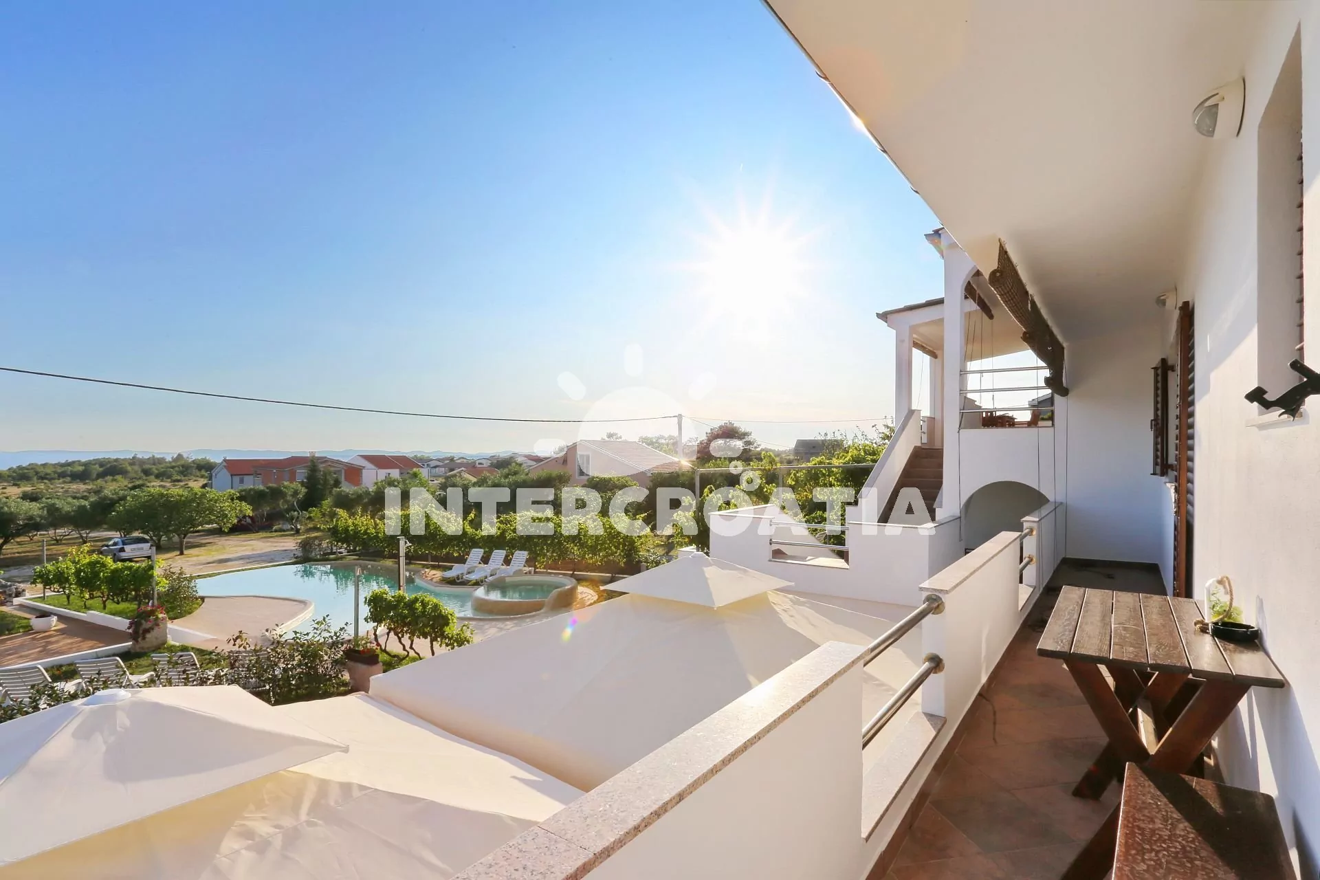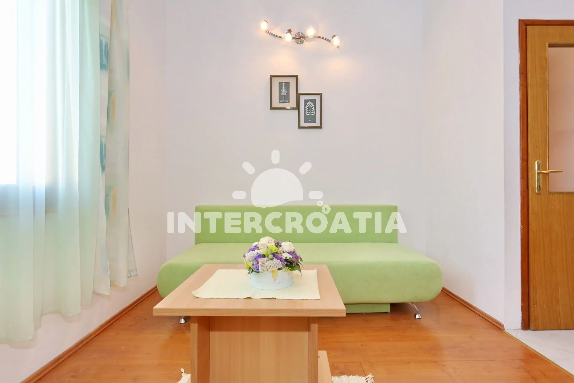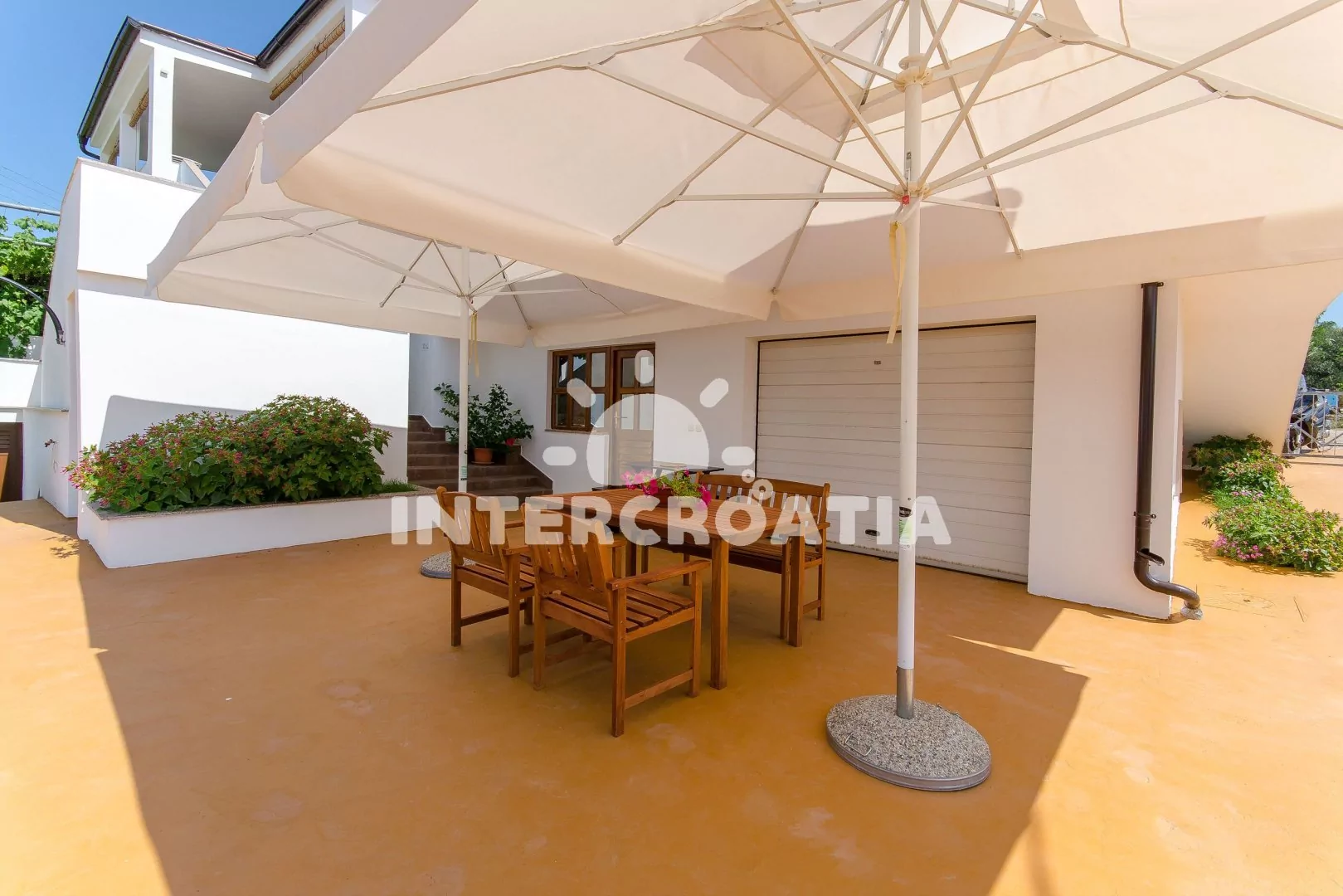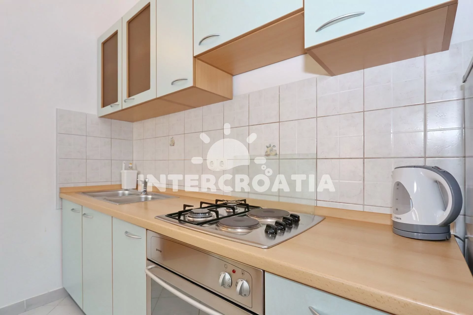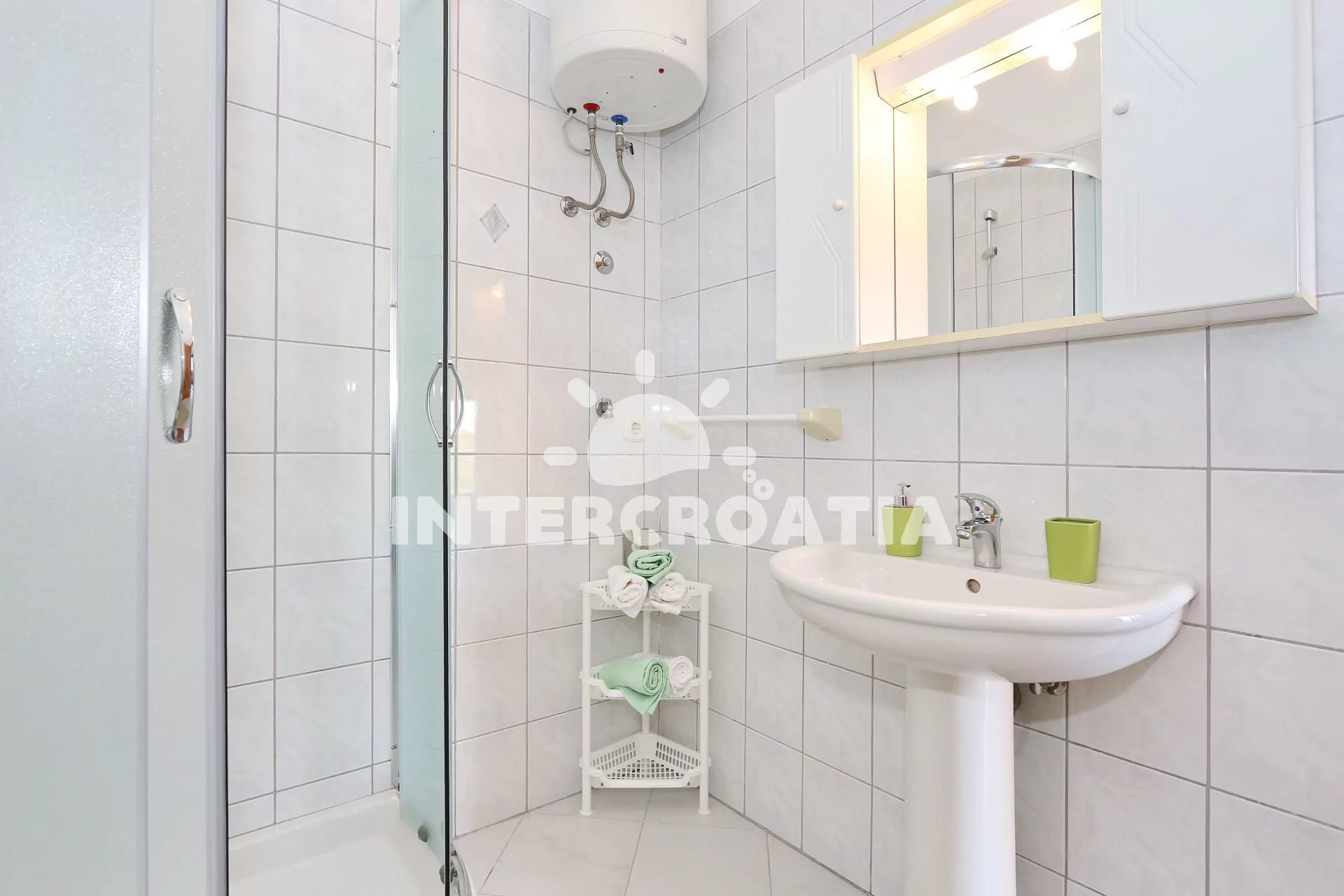 Apartmán (65 m2) s balkonem, částečným výhledem na moře se nachází v 1. patře vily a je vhodný pro 4 až 5 osob. Obývací pokoj je spojený s kuchyní. Kuchyňská linka je vybavena varnou deskou, vestavěnou troubou, rychlovarnou konvicí, mikrovlnnou troubou, nádobím a lednicí s mrazákem. Obývací pokoj s jídelním stolem pro 6 osob, pohovkou (rozložitelná na extra lůžko pro 1 osobu), televizí se satelitním programem a klimatizací. První ložnice s dvoulůžkem a vstupem na balkon. Druhá ložnice s dvěma jednolůžky. Koupelna se sprchovým koutem, umyvadlem, fénem, bidetem a wc. Dále samostatné wc s umyvadlem. Hostům je k dispozici parkování u objektu zdarma.