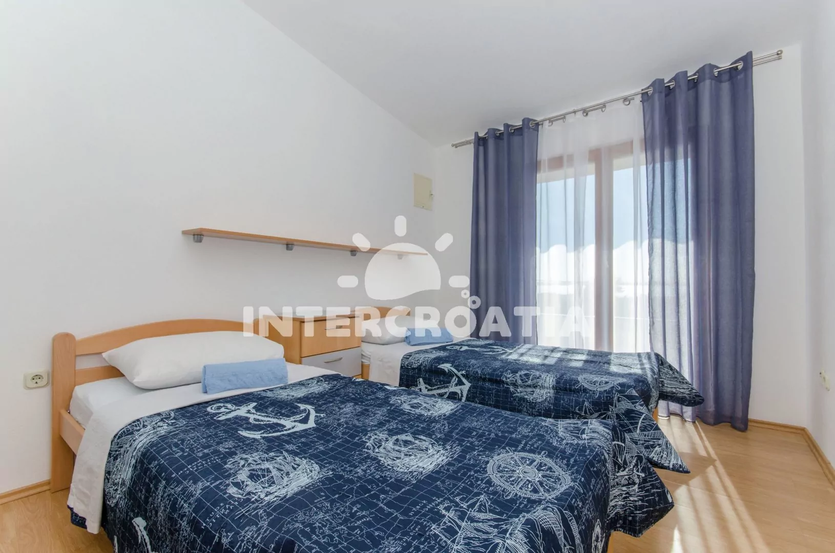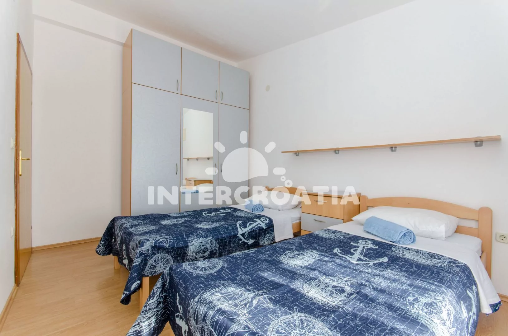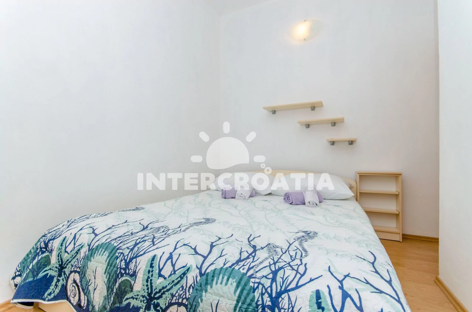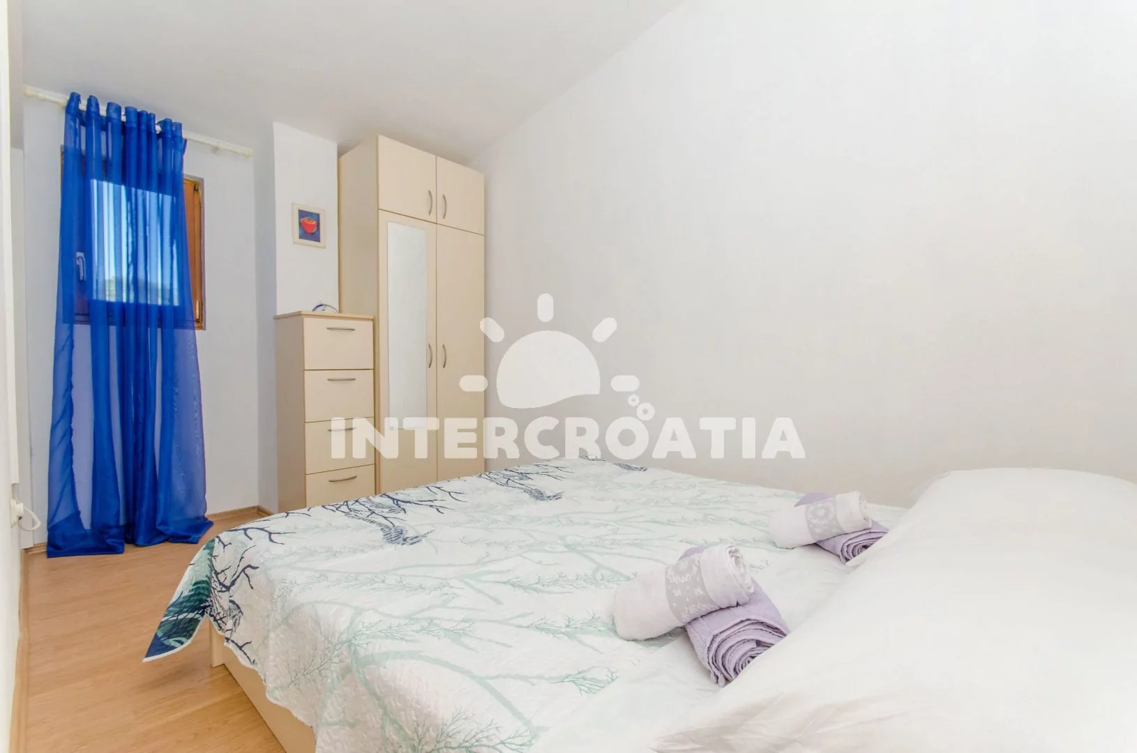 Apartmán (65 m2) s vlastní terasou, výhledem na moře se nachází v 1. patře vily a je vhodný pro 4 až 5 osob. Obývací pokoj je spojený s kuchyní. Kuchyňská linka je vybavena varnou deskou, digestoří, vestavěnou troubou, rychlovarnou konvicí, mikrovlnnou troubou, nádobím a lednicí s mrazákem. Obývací pokoj s jídelním stolem pro 6 osob, pohovkou (rozložitelná na extra lůžko pro 1 osobu), televizí se satelitním programem, klimatizací a vstupem na terasu. První ložnice s dvoulůžkem. Druhá ložnice s dvěma jednolůžky a vstupem na terasu. Koupelna se sprchovým koutem, umyvadlem, fénem a wc. Hostům je k dispozici parkování u objektu zdarma.