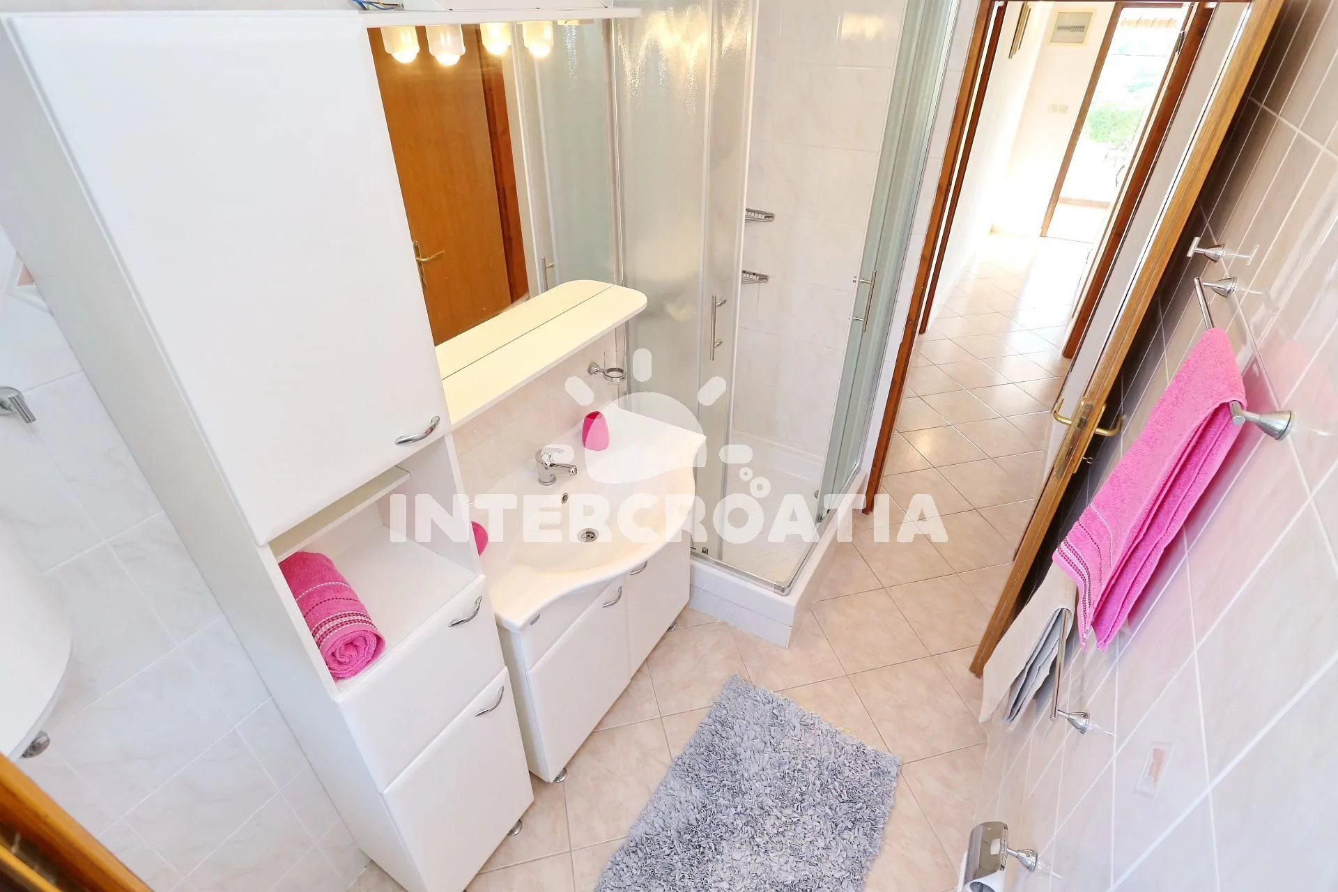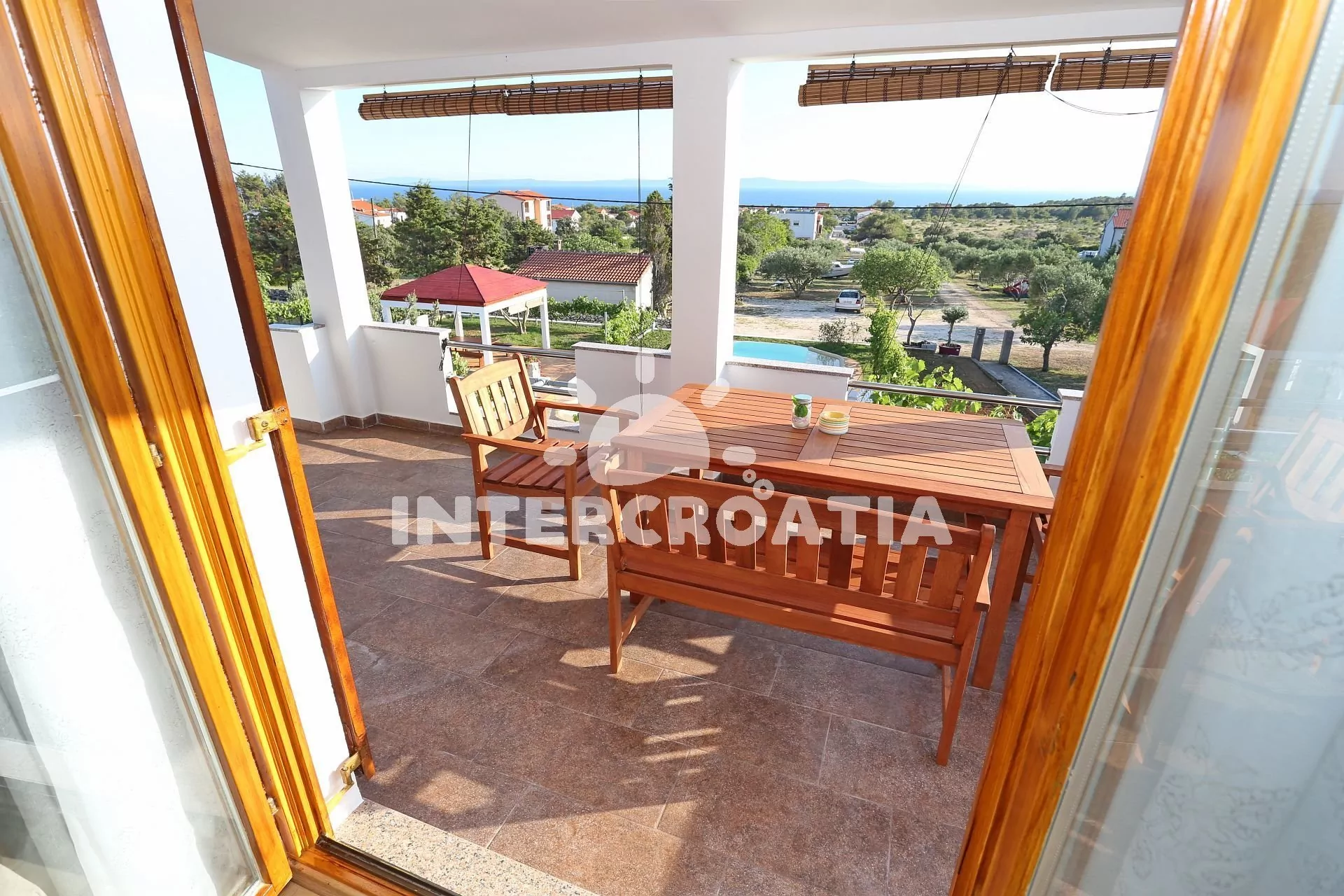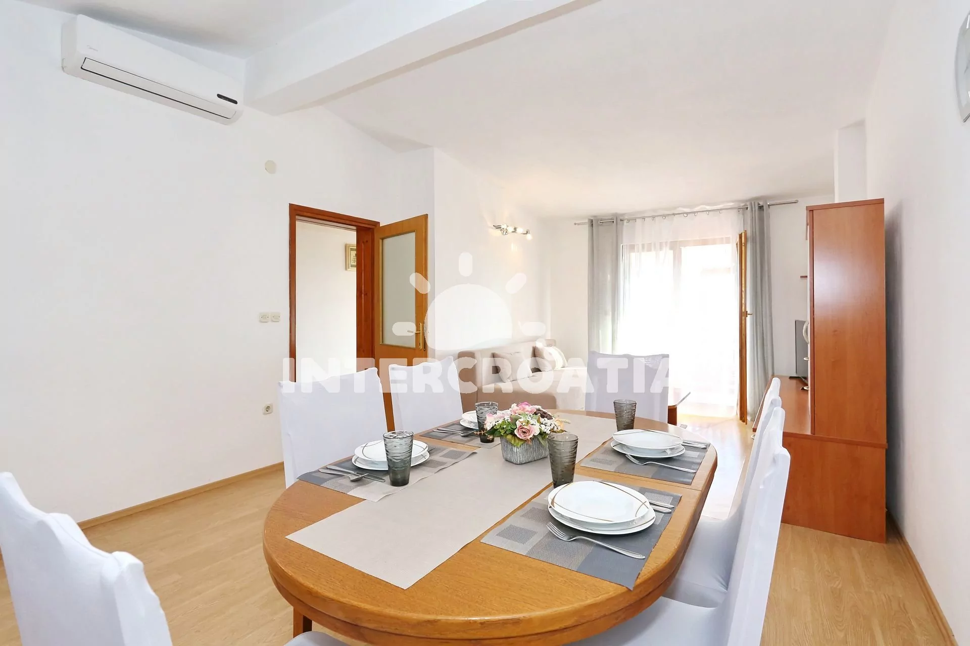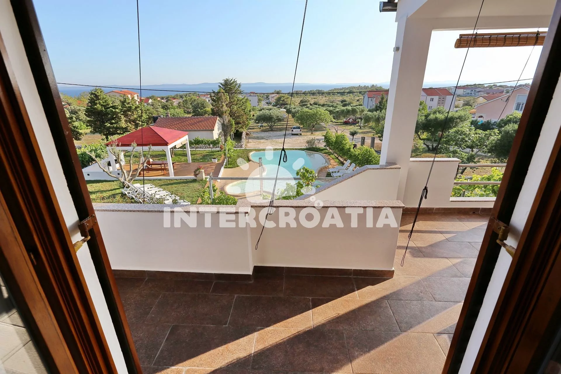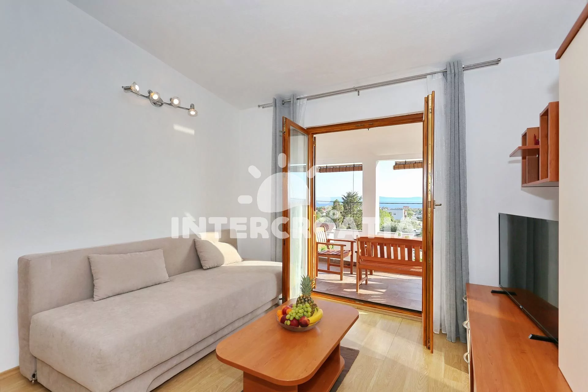 Apartmán (65 m2) s vlastní terasou, výhledem na moře se nachází v 1. patře vily a je vhodný pro 4 až 5 osob. Obývací pokoj je spojený s kuchyní. Kuchyňská linka je vybavena varnou deskou, digestoří, vestavěnou troubou, rychlovarnou konvicí, mikrovlnnou troubou, nádobím a lednicí s mrazákem. Obývací pokoj s jídelním stolem pro 6 osob, pohovkou (rozložitelná na extra lůžko pro 1 osobu), televizí se satelitním programem, klimatizací a vstupem na terasu. První ložnice s dvoulůžkem. Druhá ložnice s dvěma jednolůžky a vstupem na terasu. Koupelna se sprchovým koutem, umyvadlem, fénem a wc. Hostům je k dispozici parkování u objektu zdarma.