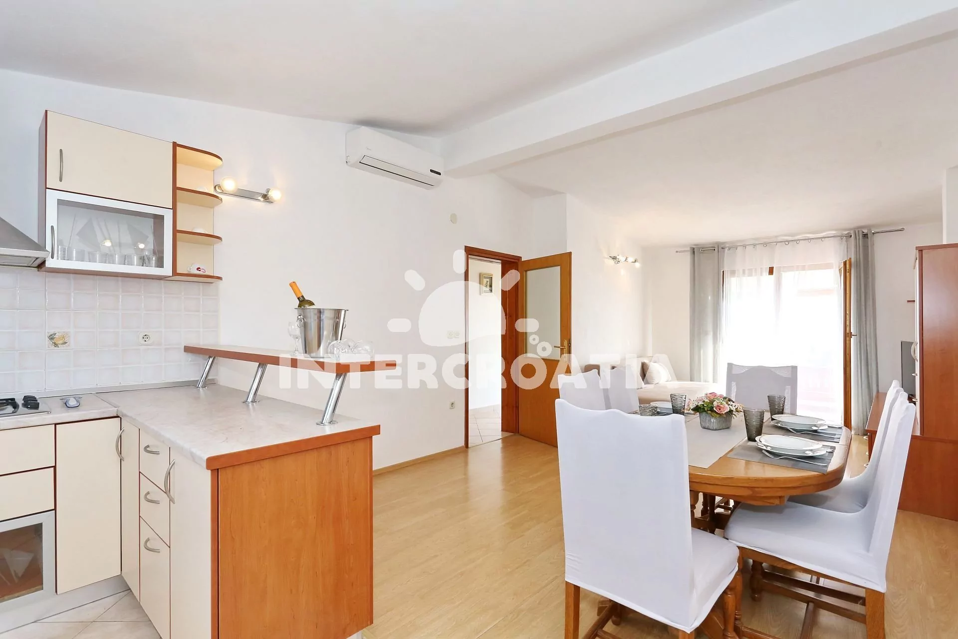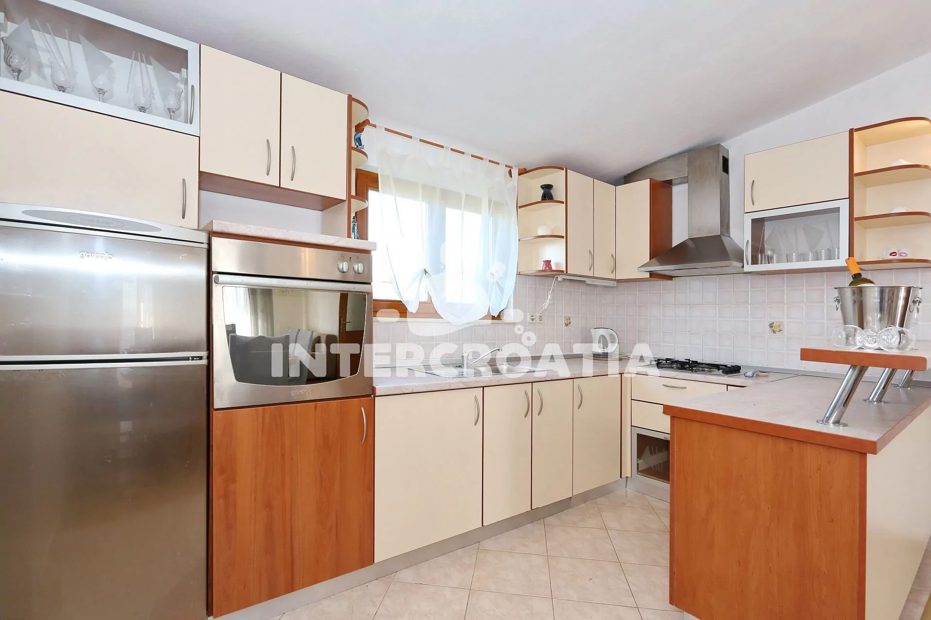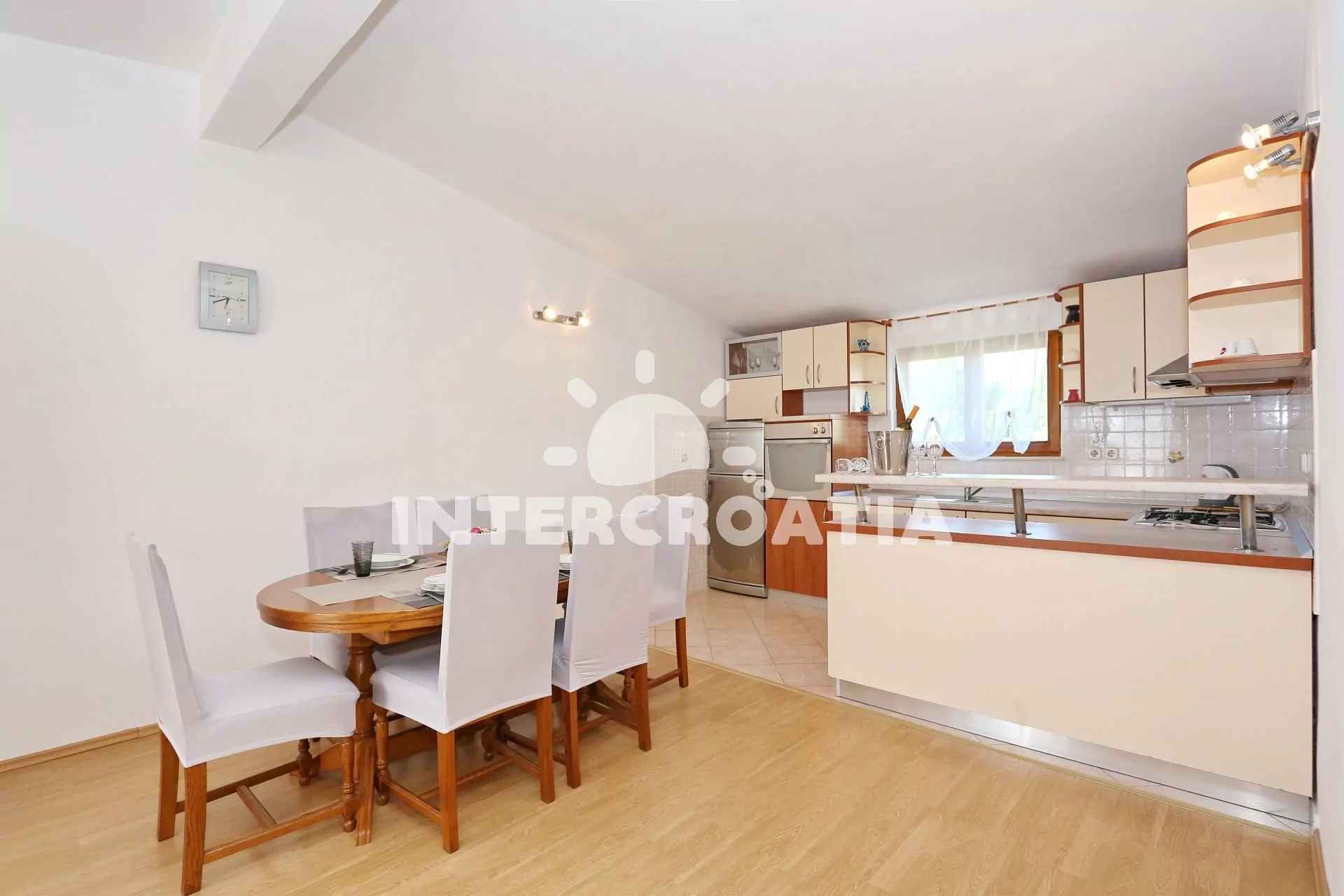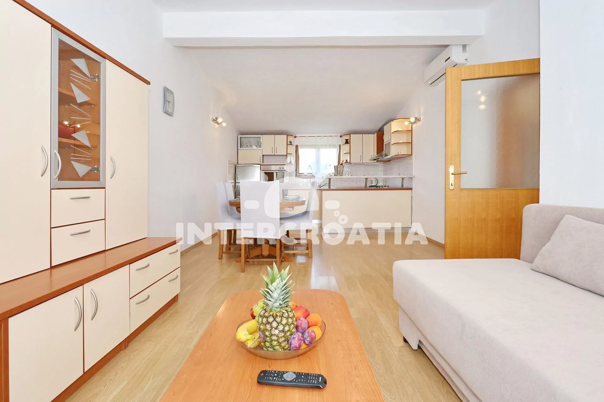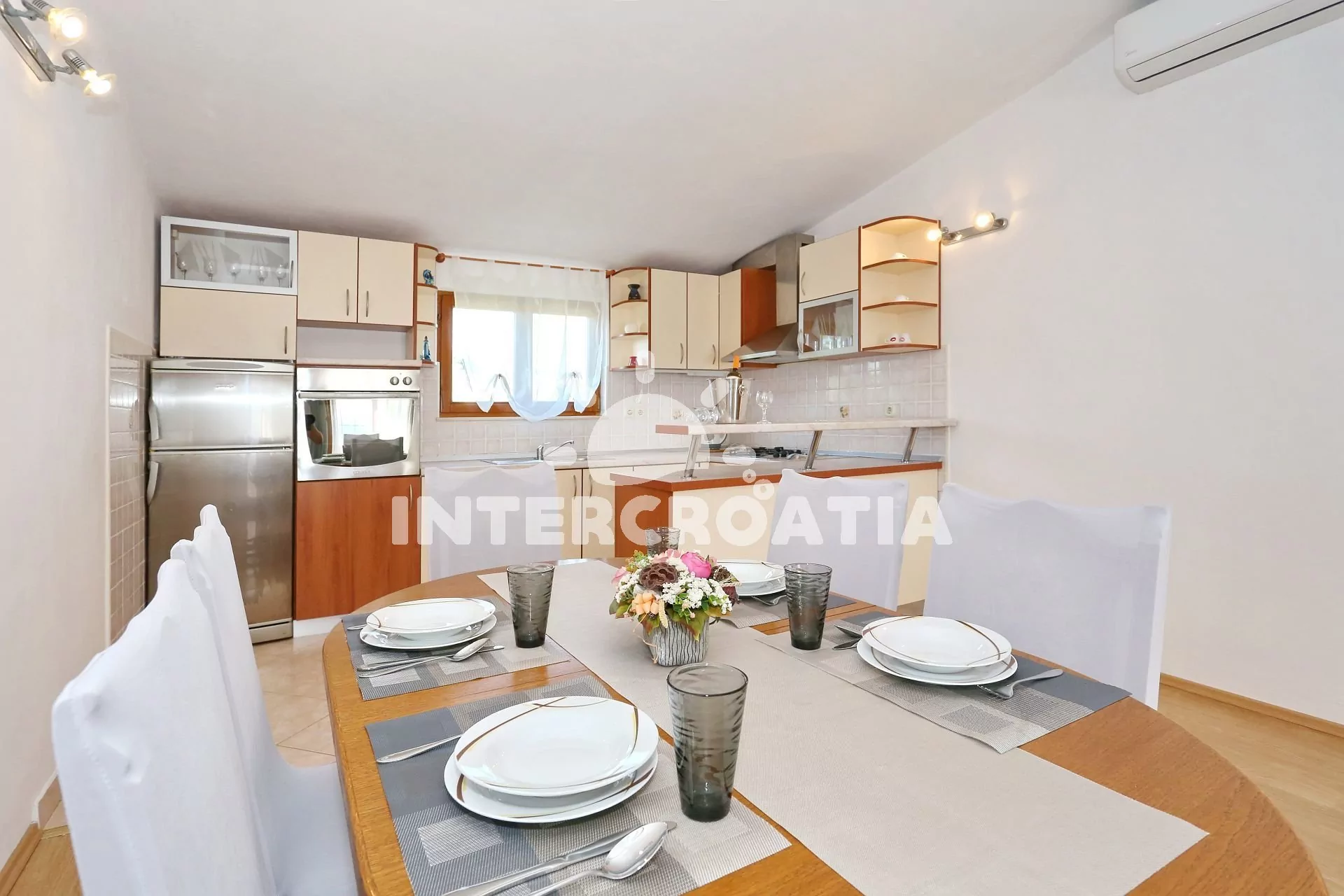 Apartmán (65 m2) s vlastní terasou, výhledem na moře se nachází v 1. patře vily a je vhodný pro 4 až 5 osob. Obývací pokoj je spojený s kuchyní. Kuchyňská linka je vybavena varnou deskou, digestoří,…