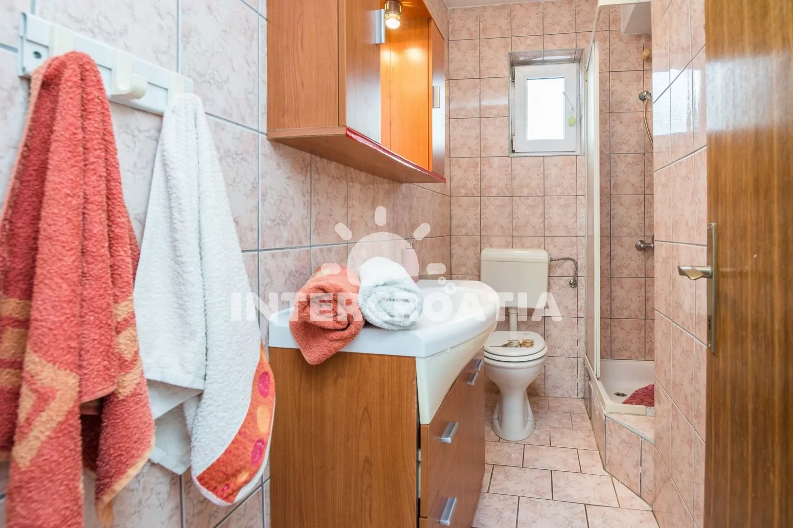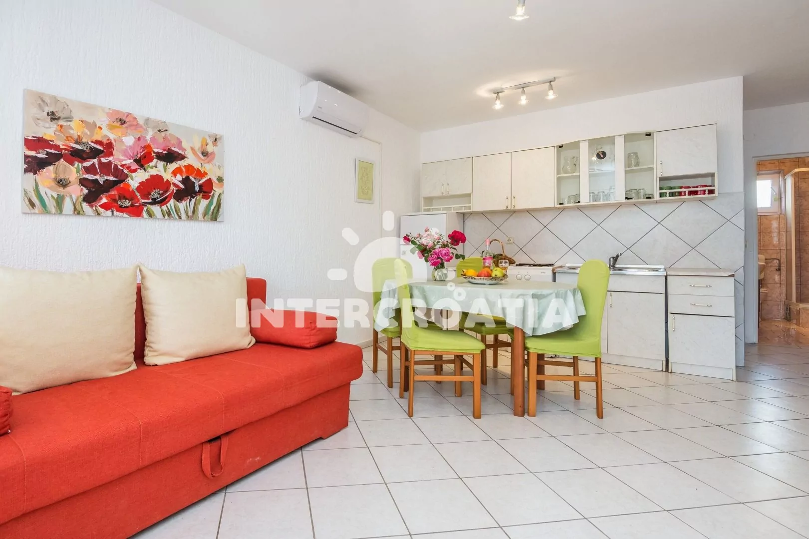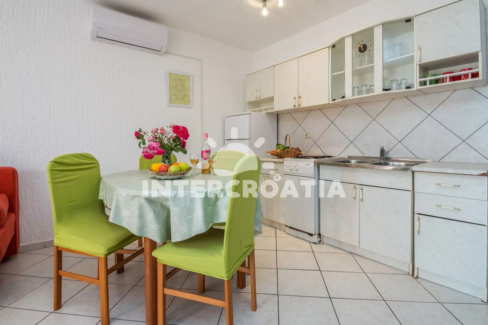 Apartmán (54 m2) s terasou, posezením a výhledem na moře se nachází v přízemí domu. Apartmán má 1 ložnici a je vhodný pro 2 až 4 osoby. Obývací pokoj je spojený s kuchyní. Kuchyňská linka je vybavena dvouplotýnkovým vařičem, mikrovlnnou troubou, rychlovarnou konvicí, kávovarem, toustovačem, nádobím a lednicí s mrazákem. Obývací pokoj s jídelním stolem, pohovkou (rozložitelná na extra lůžko pro 2 osoby), televizí se satelitním programem, klimatizací a vstupem na terasu. Ložnice s jedním dvoulůžkem. Koupelna se sprchovým koutem, umyvadlem, fénem a wc. Hostům je k dispozici parkování u objektu zdarma.