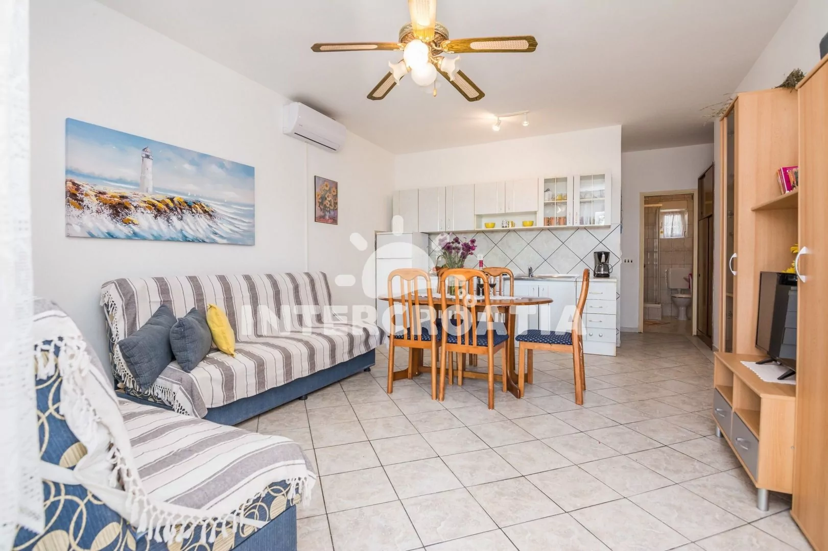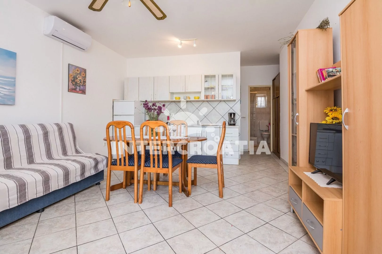 Apartmán (54 m2) s terasou, posezením a výhledem na moře se nachází v přízemí domu. Apartmán má 1 ložnici a je vhodný pro 2 až 4 osoby. Obývací pokoj je spojený s kuchyní. Kuchyňská linka je vybavena dvouplotýnkovým vařičem, mikrovlnnou troubou, rychlovarnou konvicí, kávovarem, toustovačem, nádobím a lednicí s mrazákem. Obývací pokoj s jídelním stolem, pohovkou (rozložitelná na extra lůžko pro 2 osoby), televizí se satelitním programem, klimatizací a vstupem na terasu. Ložnice s jedním dvoulůžkem. Koupelna se sprchovým koutem, umyvadlem, fénem a wc. Hostům je k dispozici parkování u objektu zdarma.