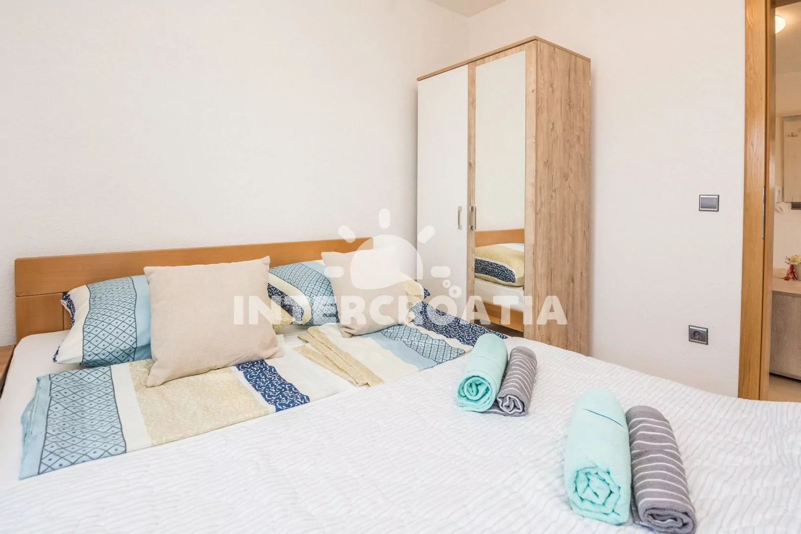 Apartmán (55 m2) s terasou a venkovním posezením se nachází v 2. patře domu. Apartmán má 1 ložnici a je vhodný pro 2 až 4 osoby. Obývací pokoj je spojený s kuchyní. Kuchyňská linka je vybavena sklokeramickou varnou deskou, vestavěnou troubou, rychlovarnou konvicí, mikrovlnnou troubou, toustovačem, kávovarem, nádobím a lednicí s mrazákem. Obývací pokoj s jídelním stolem, pohovkou (rozložitelná na extra lůžko pro 2 osoby), televizí se satelitním programem, klimatizací a vstupem na terasu. Ložnice s jedním dvoulůžkem. Koupelna se sprchovým koutem, umyvadlem, fénem a wc. Hostům je k dispozici parkování u objektu zdarma.