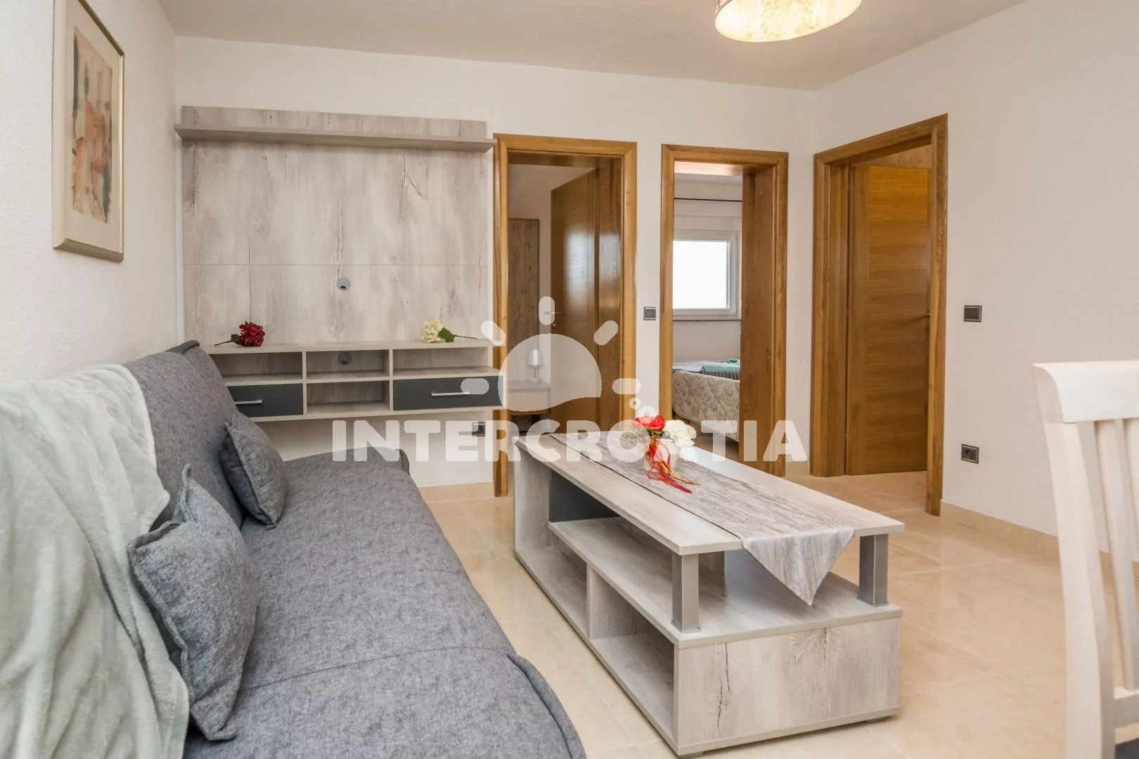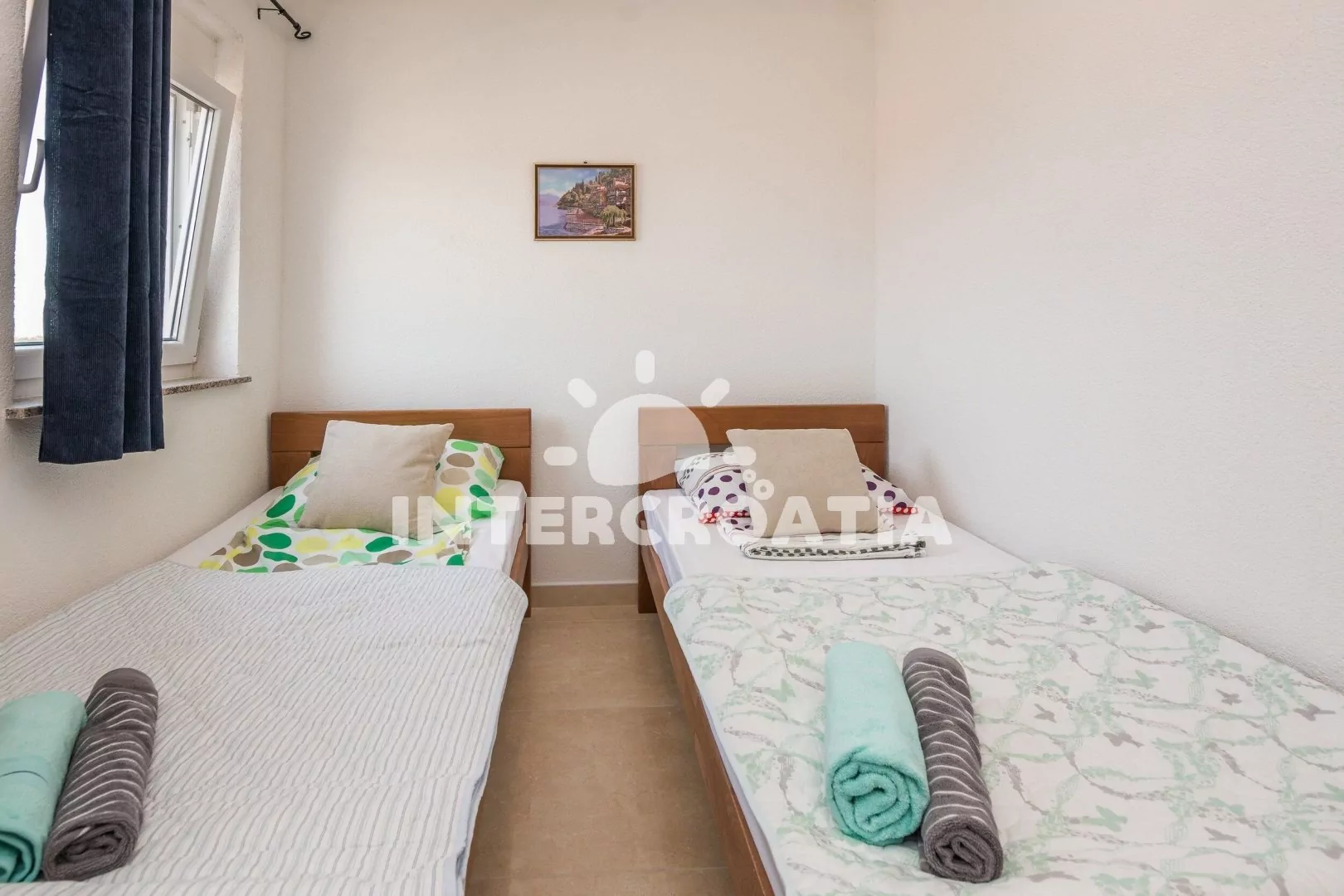 Apartmán (70 m2) s terasou a venkovním posezením se nachází ve 2. patře domu. Apartmán má 2 ložnice a je vhodný pro 4 až 6 osob. Obývací pokoj je spojený s kuchyní. Kuchyňská linka je vybavena sklokeramickou varnou deskou, vestavěnou troubou, rychlovarnou konvicí, mikrovlnnou troubou, toustovačem, kávovarem, nádobím a lednicí s mrazákem. Obývací pokoj s jídelním stolem, pohovkou (rozložitelná na extra lůžko pro 2 osoby), televizí se satelitním programem, klimatizací a vstupem na terasu. První ložnice s jedním dvoulůžkem. Druhá ložnice s dvěma jednolůžky. Koupelna se sprchovým koutem, umyvadlem, fénem a wc. Hostům je k dispozici parkování u objektu zdarma.