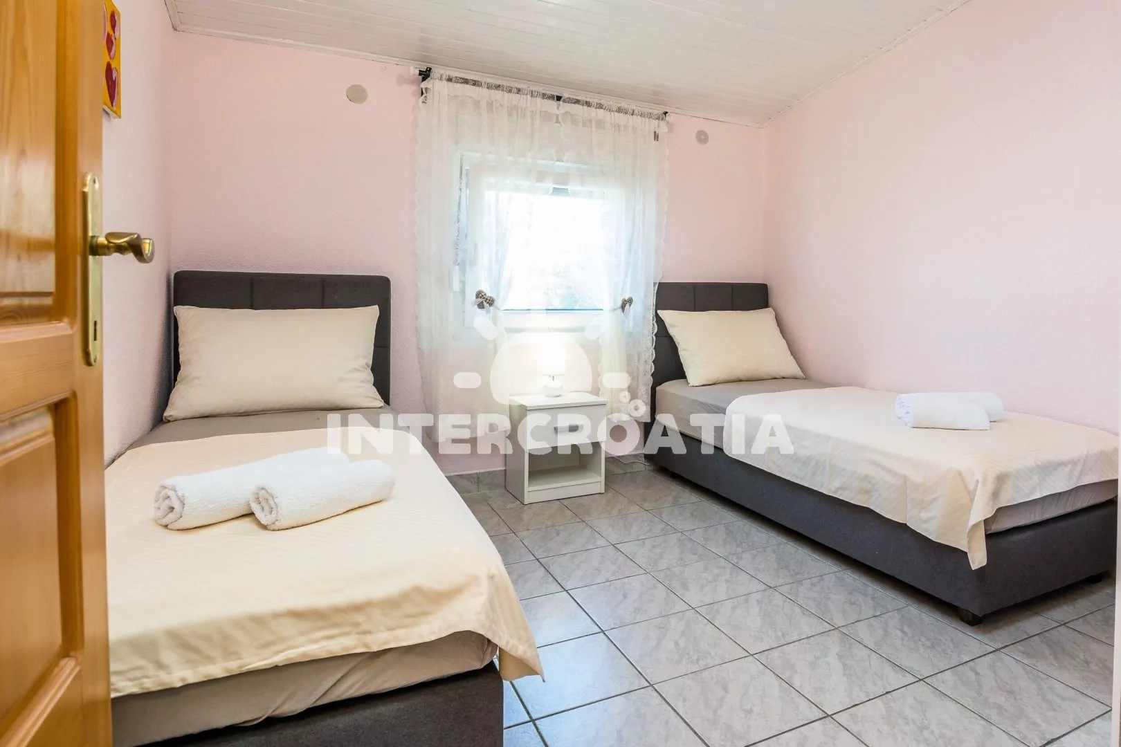 Apartmán (60 m2) s terasou a venkovním posezením se nachází v 1. patře domu. Apartmán má 2 ložnice a je vhodný pro až 4 osoby. Obývací pokoj s pohovkou, televizí se satelitním programem a vstupem na terasu. V kuchyni klimatizace, jídelní stůl a kuchyňská linka. Kuchyňská linka je vybavena dvouplotýnkovým vařičem, mikrovlnou troubou, kávovarem, toustovačem, rychlovarnou konvicí, nádobím a lednicí s mrazákem. První ložnice s dvoulůžkem a vstupem na terasu. Druhá ložnice s dvěma jednolůžky. Koupelna se sprchovým koutem, umyvadlem, fénem a wc. Hostům je k dispozici parkování u objektu zdarma.