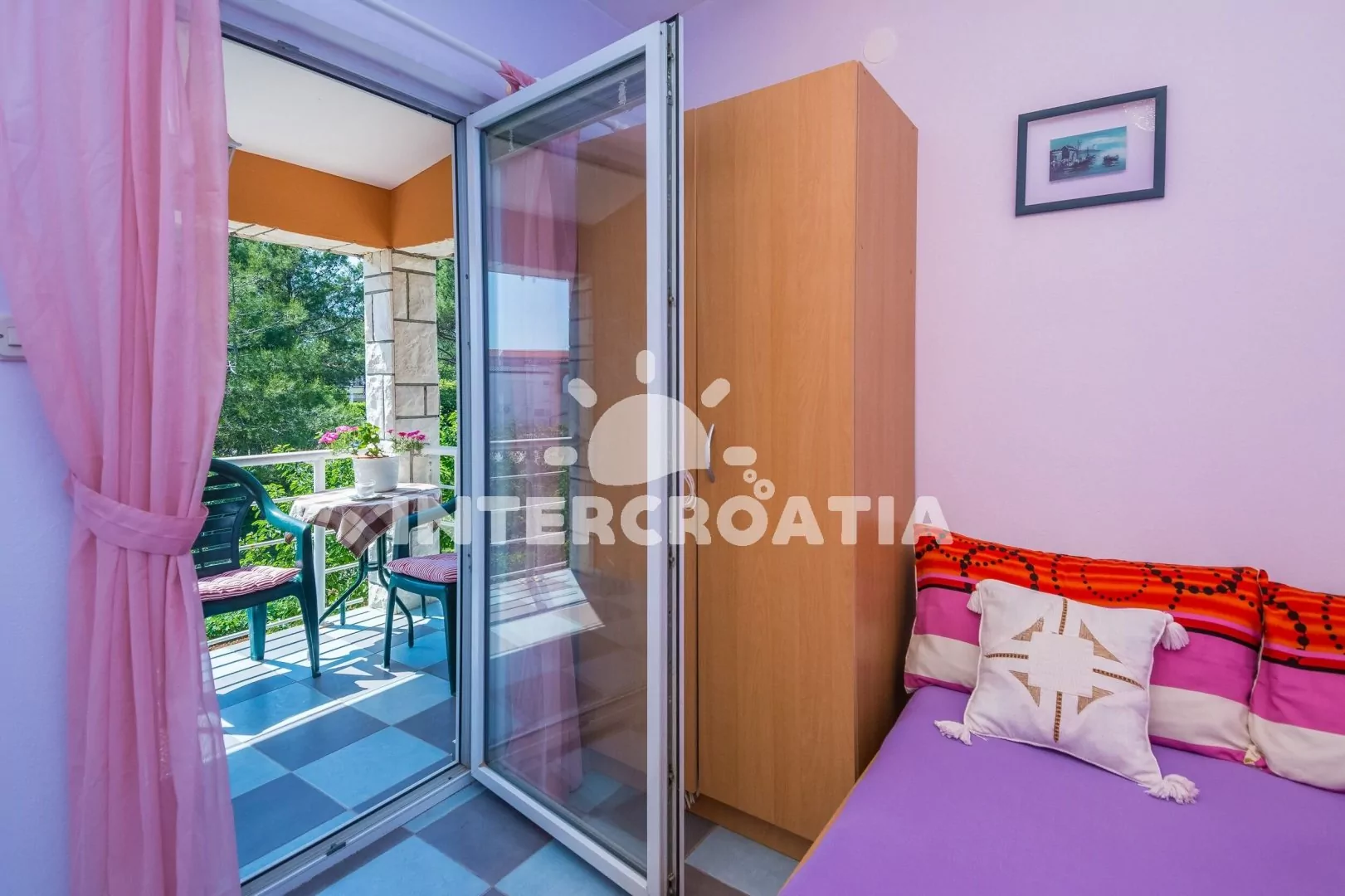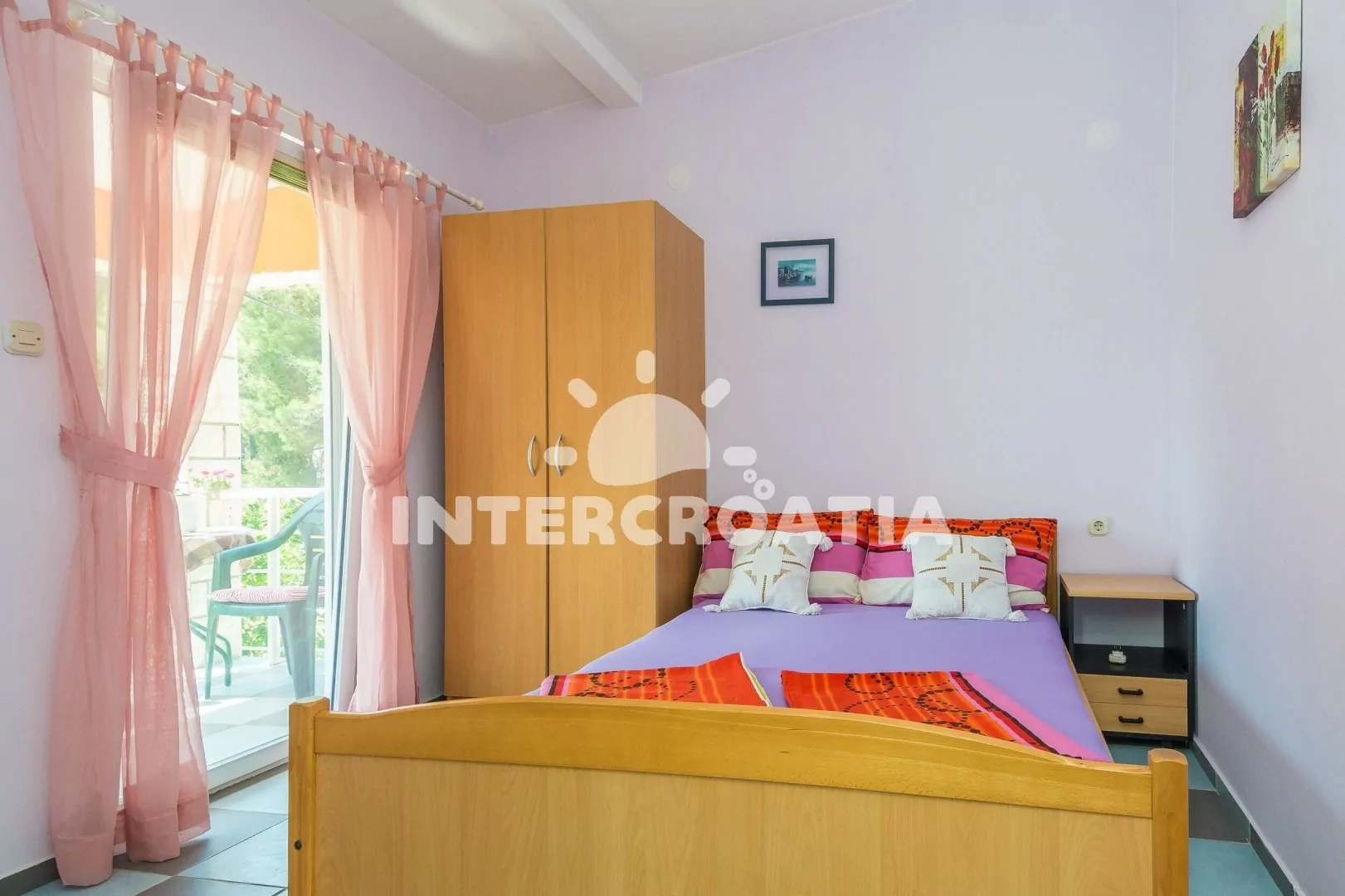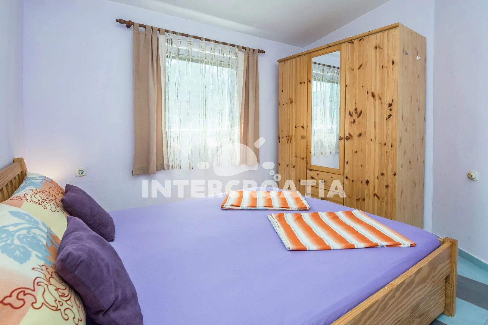 Apartmán (45 m2) s terasou a venkovním posezením se nachází v 1. patře domu. Apartmán má 2 ložnice a je vhodný pro 4 až 5 osob. Obývací pokoj je spojený s kuchyní. Kuchyňská linka je vybavena sporákem s troubou, rychlovarnou konvicí, mikrovlnnou troubou, kávovarem, toustovačem, nádobím a lednicí s mrazákem. Obývací pokoj s jídelním stolem, pohovkou (rozložitelná na extra lůžko pro 1 osobu), televizí se satelitním programem, klimatizací a vstupem na terasu. První ložnice s dvoulůžkem. Druhá ložnice s dvoulůžkem a vstupem na terasu. Koupelna se sprchovým koutem, umyvadlem, fénem, pračkou a wc. Hostům je k dispozici parkování u objektu zdarma.