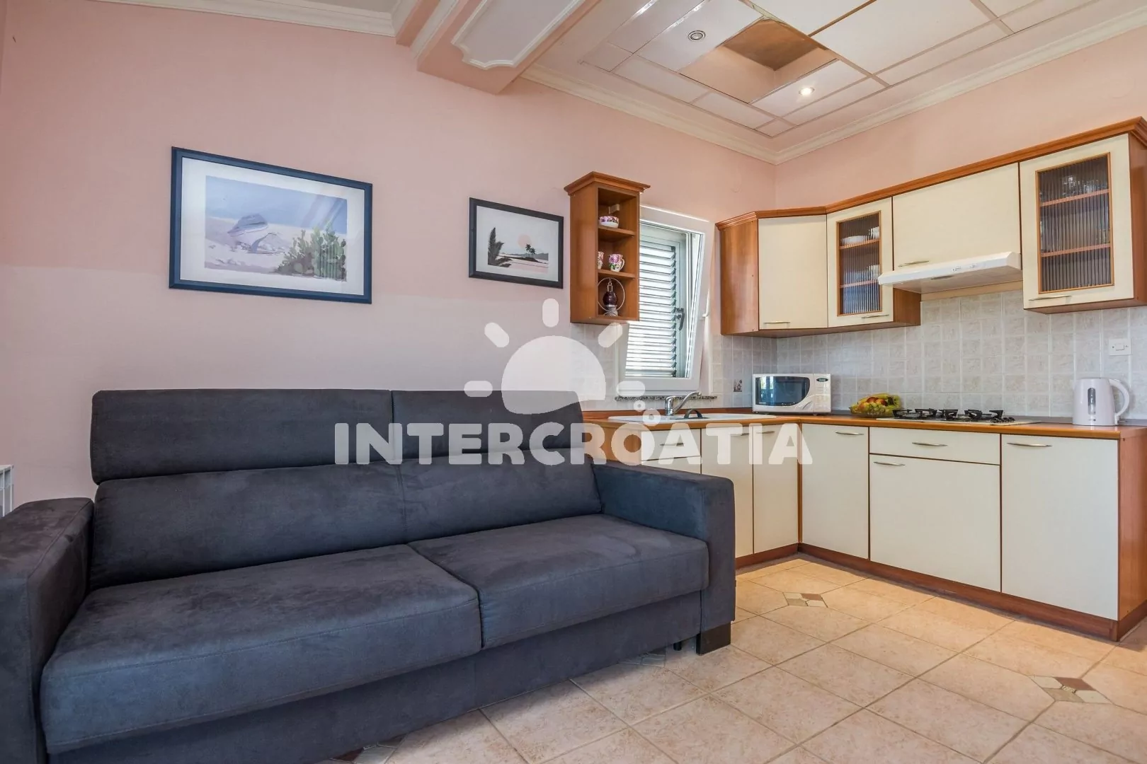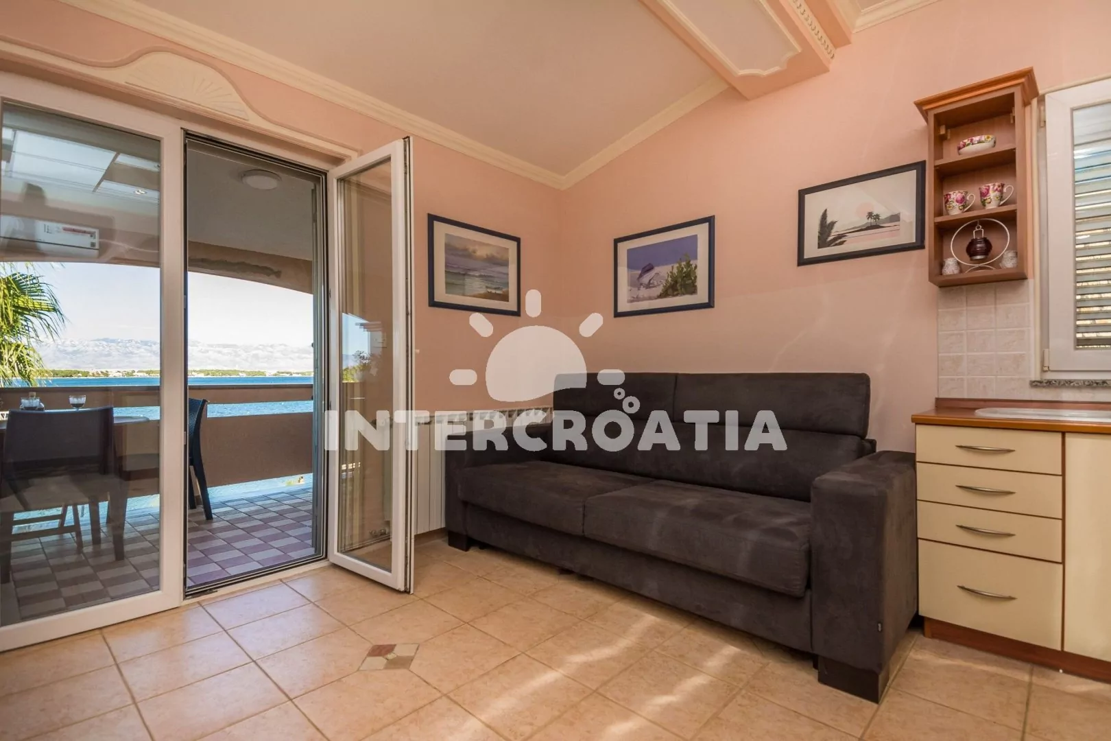 Apartmán (50 m2) s terasou, posezením a výhledem na moře se nachází v 1. patře domu. Apartmán má 1 ložnici a je vhodný pro 2 až 4 osoby. Obývací pokoj je spojený s kuchyní. Kuchyňská linka je vybavena varnou deskou, digestoří, mikrovlnnou troubou, rychlovarnou konvicí, kávovarem, toustovačem, nádobím a lednicí s mrazákem. Obývací pokoj s pohovkou (rozložitelná na extra lůžko pro 2 osoby), televizí se satelitním programem, klimatizací a vstupem na terasu. Ložnice s dvoulůžkem a vstupem na terasu. Koupelna se sprchovým koutem, umyvadlem, fénem a wc. Hostům je k dispozici parkování 150-300 m od domu zdarma.