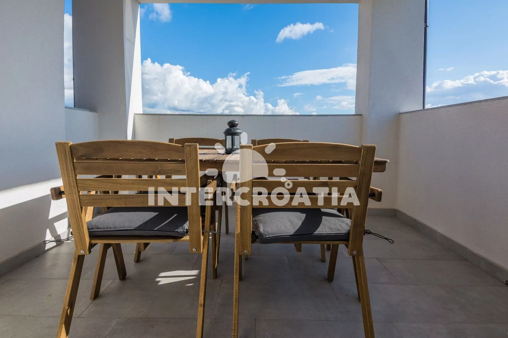 Apartmán (38 m2) s terasou a venkovním posezením se nachází v 1. patře domu. Apartmán má 1 ložnici a je vhodný pro 2 až 4 osoby. Obývací pokoj je spojený s kuchyní. Kuchyňská linka je vybavena sklokeramickou varnou deskou, vestavěnou troubou, mikrovlnnou troubou, rychlovarnou konvicí, kávovarem, toustovačem, nádobím a lednicí s mrazákem. Obývací pokoj s pohovkou (rozložitelná na extra lůžko pro 2 osoby), televizí se satelitním programem, klimatizací a vstupem na terasu. Ložnice s jedním dvoulůžkem. Koupelna se sprchovým koutem, umyvadlem, fénem, pračkou a wc. Hostům je k dispozici parkování u objektu zdarma.
