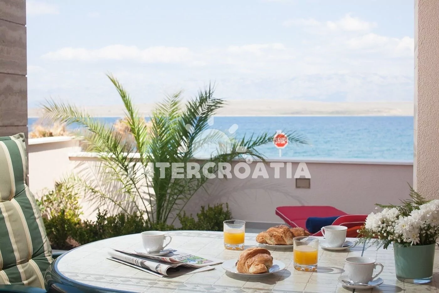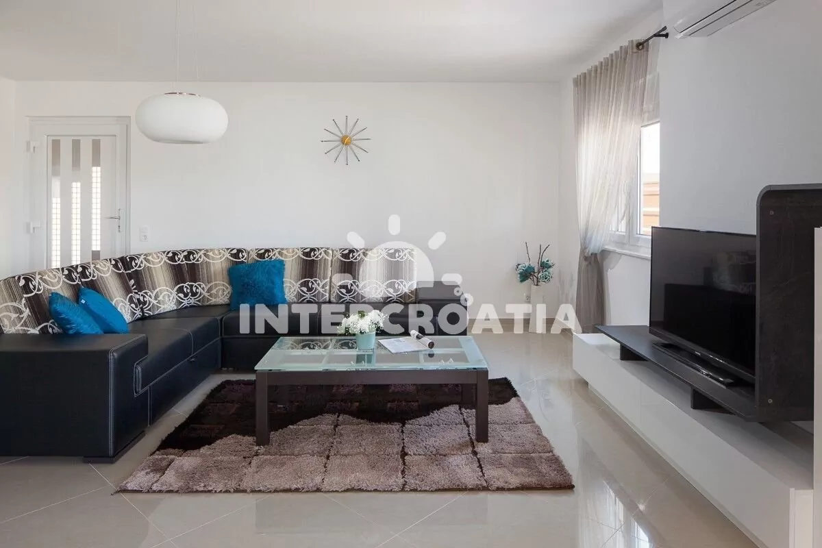 Apartmán (100 m2) s terasou, venkovním posezením a výhledem na moře se nachází v přízemí domu. Apartmán má 2 ložnice a je vhodný pro 4 až 6 osob. Obývací pokoj je spojený s kuchyní. Kuchyňská linka je vybavena sklokeramickou varnou deskou, digestoří, vestavěnou troubou, myčkou na nádobí, mikrovlnnou troubou, rychlovarnou konvicí, kávovarem, toustovačem, nádobím a lednicí s mrazákem. Obývací pokoj s jídelním stolem, pohovkou (rozložitelná na extra lůžko pro 2 osoby), televizí se satelitním programem, klimatizací a vstupem na terasu. První i druhá ložnice je vybavena vždy s jedním dvoulůžkem. Koupelna se sprchovým koutem, umyvadlem, fénem, pračkou a wc.