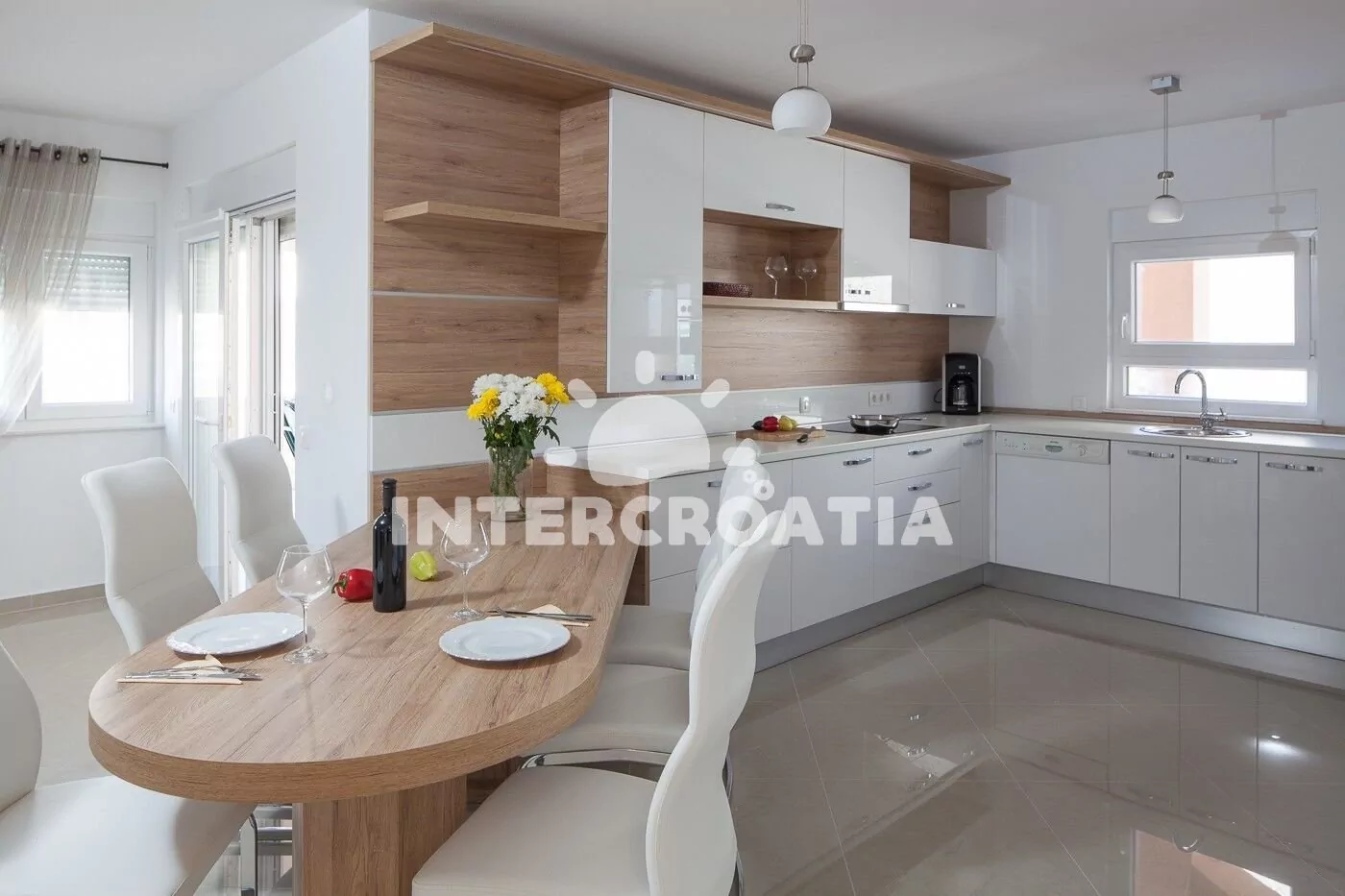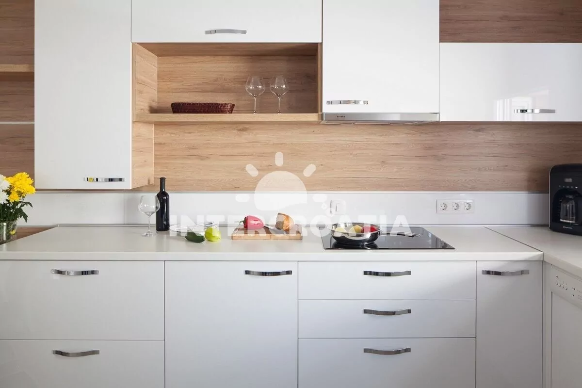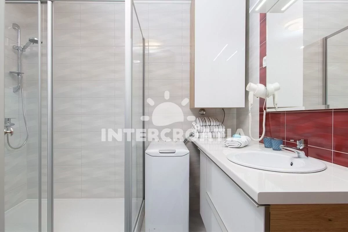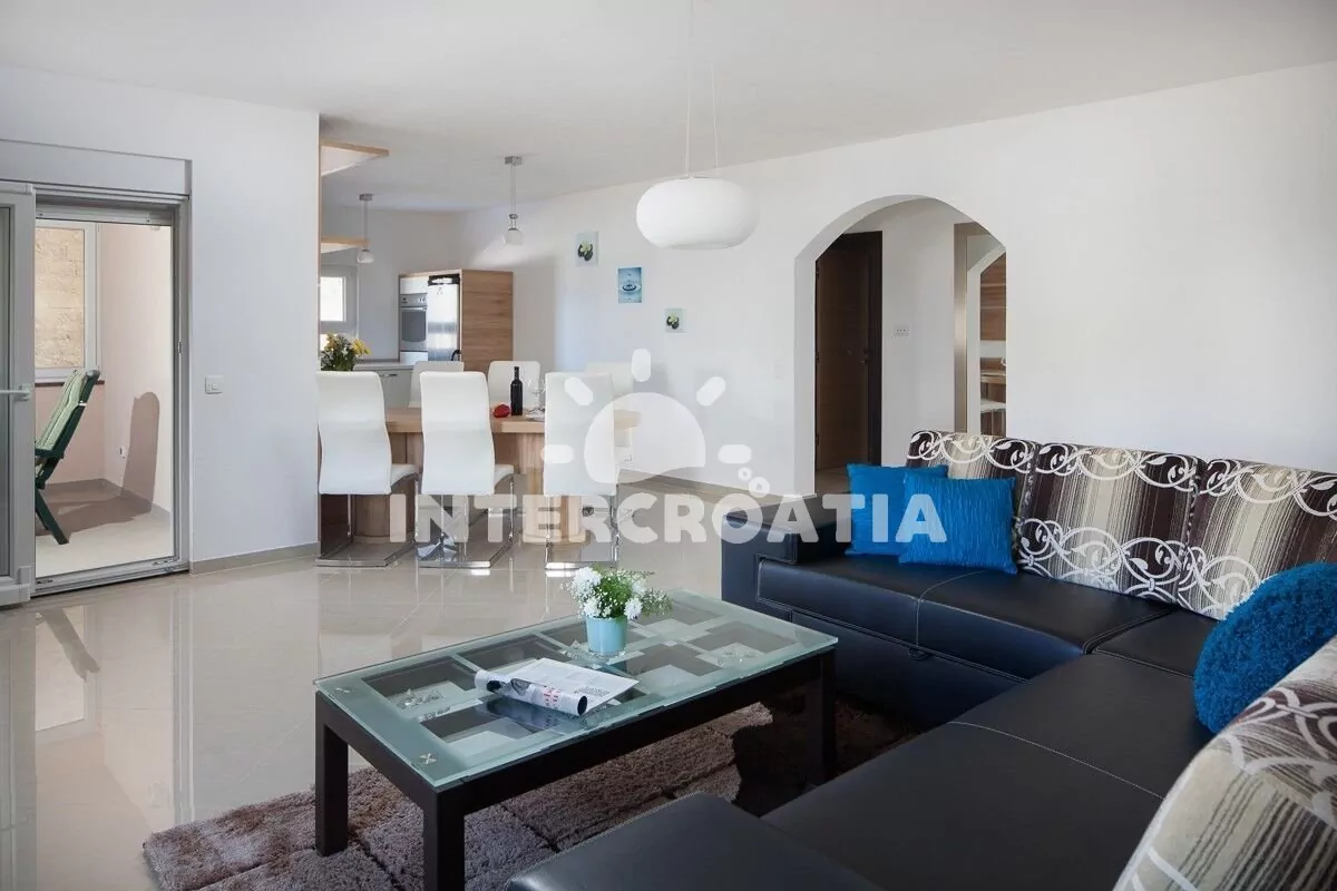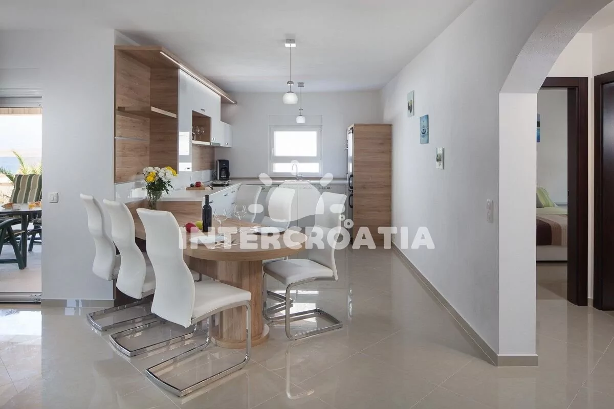 Apartmán (100 m2) s terasou, venkovním posezením a výhledem na moře se nachází v přízemí domu. Apartmán má 2 ložnice a je vhodný pro 4 až 6 osob. Obývací pokoj je spojený s kuchyní. Kuchyňská linka…