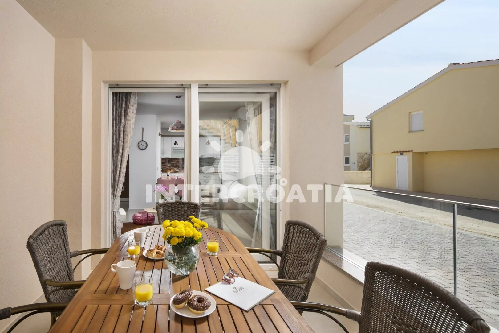 Apartmán (63 m2) s terasou, venkovním posezením a výhledem na moře se nachází v přízemí domu. Apartmán má 2 ložnice a je vhodný pro až 4 osoby. Obývací pokoj je spojený s kuchyní. Kuchyňská linka je vybavena sklokeramickou varnou deskou, digestoří, myčkou na nádobí, mikrovlnnou troubou, rychlovarnou konvicí, kávovarem, toustovačem, nádobím a lednicí s mrazákem. Obývací pokoj s jídelním stolem, pohovkou, televizí se satelitním programem, klimatizací a vstupem na terasu. První i druhá ložnice je vybavena vždy s jedním dvoulůžkem. Koupelna se sprchovým koutem, umyvadlem, fénem, pračkou a wc.