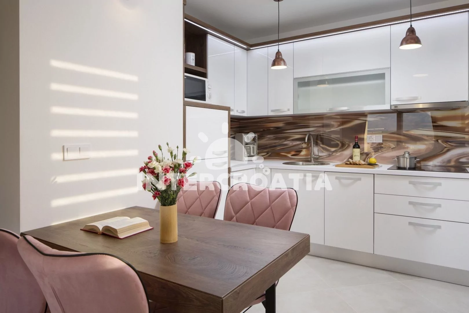 Apartmán (63 m2) s terasou, venkovním posezením a výhledem na moře. Apartmán má 2 ložnice a je vhodný pro až 4 osoby. Obývací pokoj je spojený s kuchyní. Kuchyňská linka je vybavena sklokeramickou…