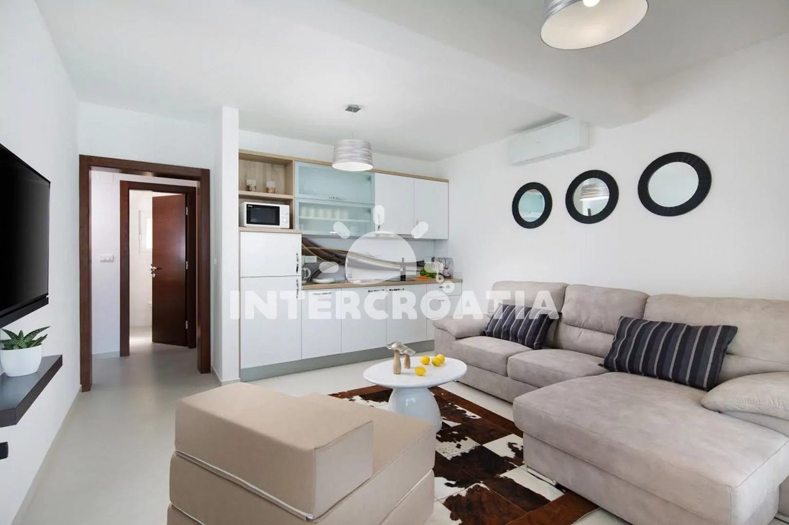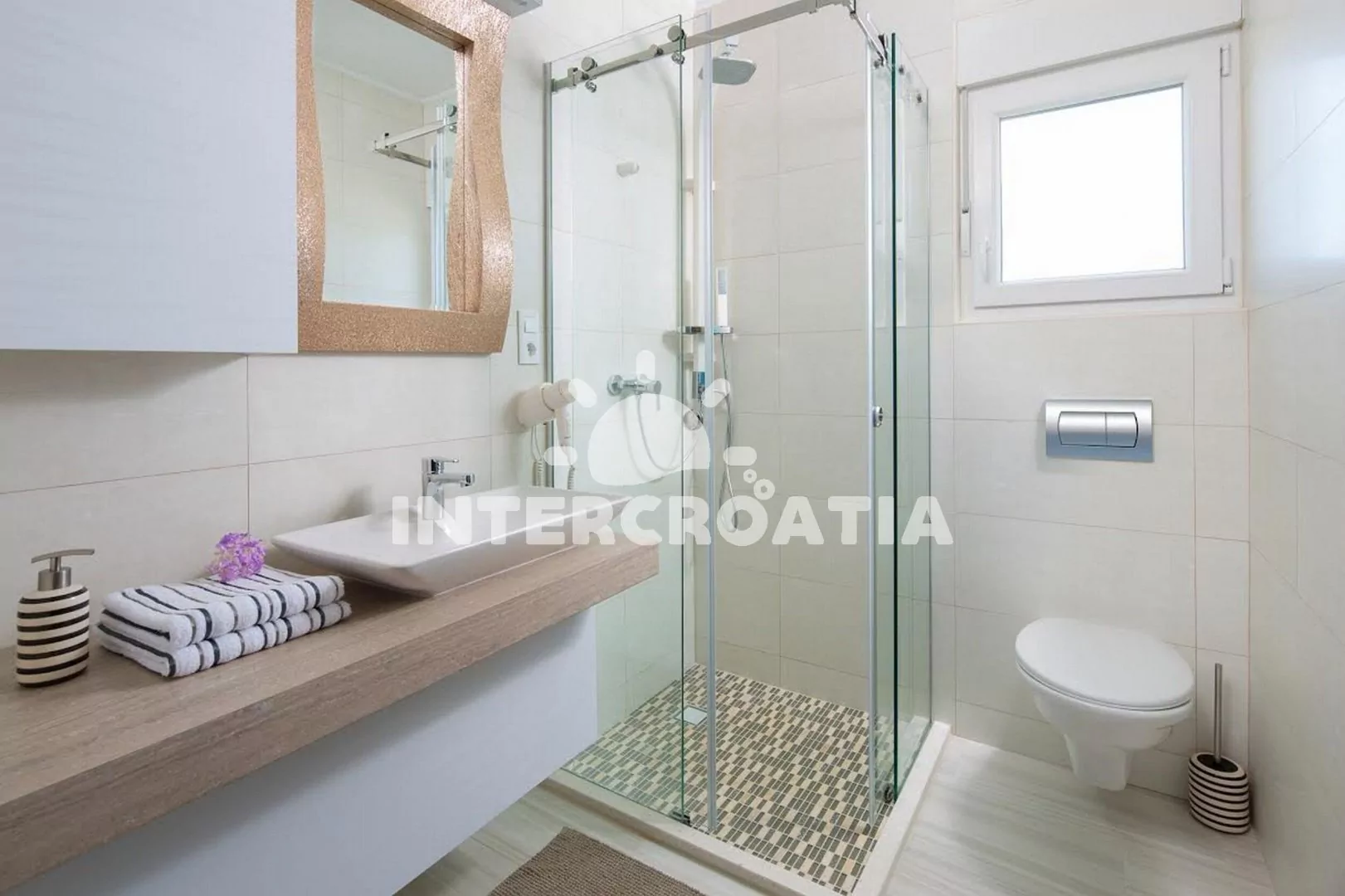 Apartmán (50 m2) s terasou, venkovním posezením a výhledem na moře se nachází v 1. patře domu. Apartmán má 1 ložnici a je vhodný pro až 4 osoby. Obývací pokoj je spojený s kuchyní. Kuchyňská linka je vybavena sklokeramickou varnou deskou, digestoří, myčkou na nádobí, mikrovlnnou troubou, rychlovarnou konvicí, kávovarem, toustovačem, nádobím a lednicí s mrazákem. Obývací pokoj s pohovkou (rozložitelná na extra lůžko pro 2 osoby), televizí se satelitním programem, klimatizací a vstupem na terasu. Ložnice s jedním dvoulůžkem. Koupelna se sprchovým koutem, umyvadlem, fénem, pračkou a wc. Hostům je k dispozici parkování u objektu zdarma.