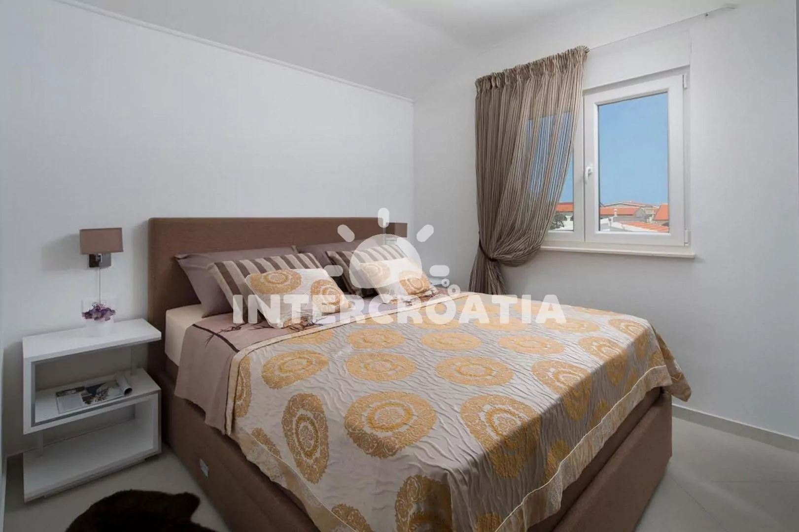 Apartmán (50 m2) s terasou, venkovním posezením a výhledem na moře se nachází ve 2. patře domu. Apartmán má 1 ložnici a je vhodný pro až 4 osoby. Obývací pokoj je spojený s kuchyní. Kuchyňská linka je vybavena sklokeramickou varnou deskou, digestoří, myčkou na nádobí, mikrovlnnou troubou, rychlovarnou konvicí, kávovarem, toustovačem, nádobím a lednicí s mrazákem. Obývací pokoj s pohovkou (rozložitelná na extra lůžko pro 2 osoby), televizí se satelitním programem, klimatizací a vstupem na terasu. Ložnice s jedním dvoulůžkem. Koupelna se sprchovým koutem, umyvadlem, fénem, pračkou a wc. Hostům je k dispozici parkování u objektu zdarma.