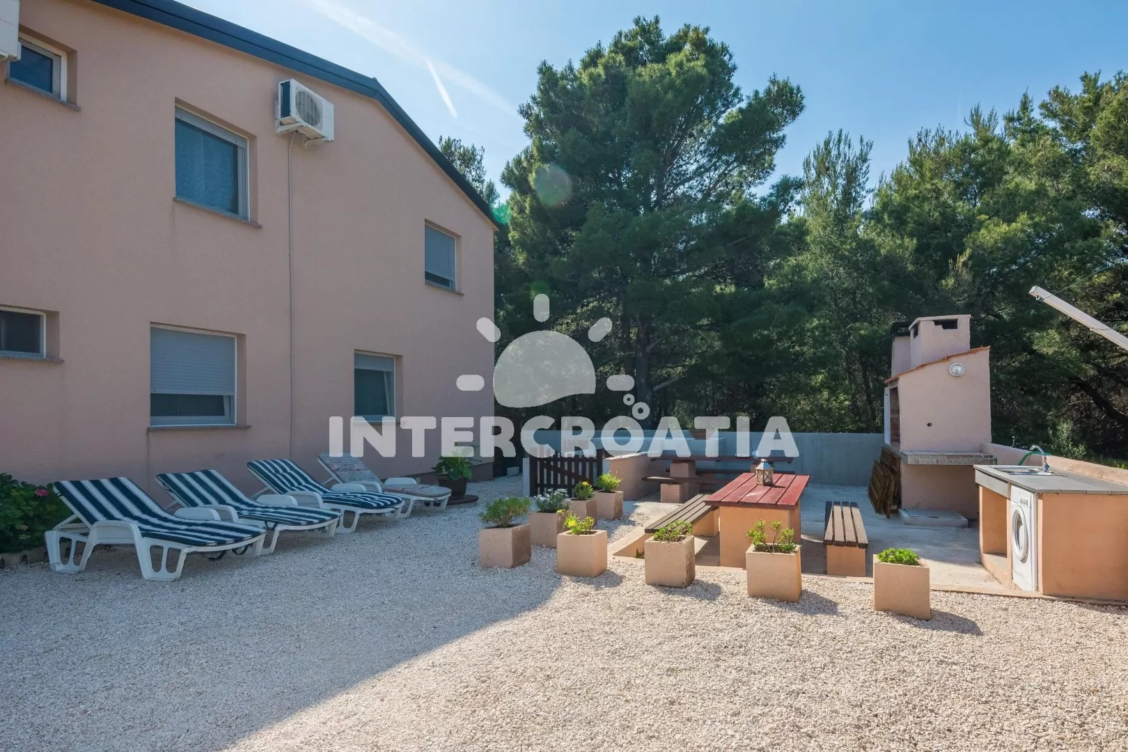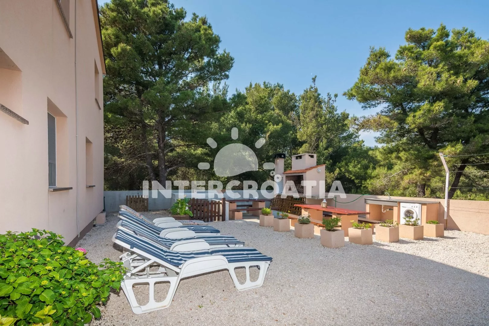 Samostatně stojící apartmánový dům se zahradou se nachází 8 minut pěší chůzí od moře a pláže (oblázková a betonová mola). Dům nabízí ubytování v klimatizovaných apartmánech s lodžiemi a venkovním posezením. K dispozici je společná zahrada s terasou, posezením, lehátky, zahradní kuchyní a zděným grilem. Dům má oplocený pozemek a parkovací místa pro automobily u objektu.