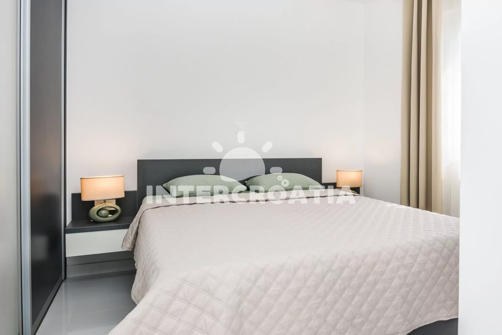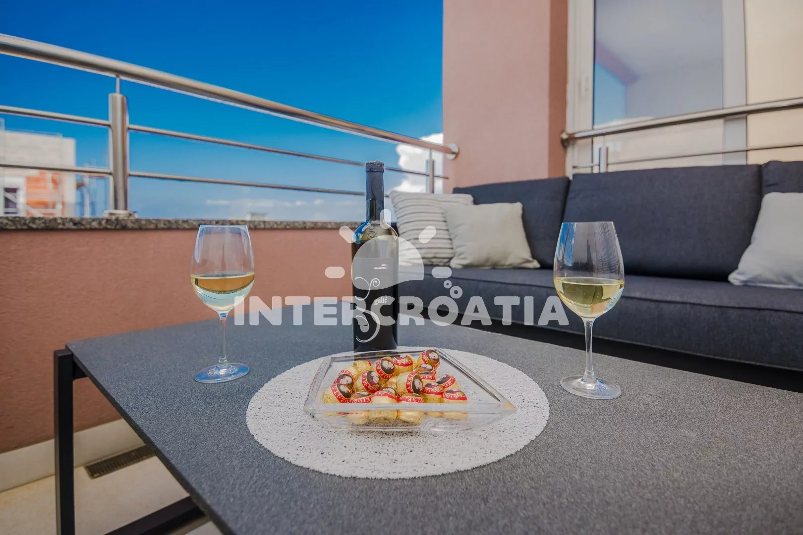 Apartmán (64 m2) s terasou, venkovním posezením a výhledem na moře se nachází v 1. patře domu. Apartmán má 2 ložnice a je vhodný pro 4 až 6 osob. Obývací pokoj je spojený s kuchyní. Kuchyňská linka je vybavena sklokeramickou varnou deskou, digestoří, vestavěnou troubou, myčkou na nádobí, mikrovlnnou troubou, rychlovarnou konvicí, kávovarem, toustovačem, nádobím a lednicí s mrazákem. Obývací pokoj s jídelním stolem, pohovkou (rozložitelná na extra lůžko pro 2 osoby), televizí se satelitním programem, klimatizací a vstupem na terasu. První ložnice s dvoulůžkem a klimatizací. Druhá ložnice se dvěma jednolůžky a klimatizací. Koupelna se sprchovým koutem, umyvadlem, fénem a wc. Hostům je k dispozici parkování u objektu zdarma.