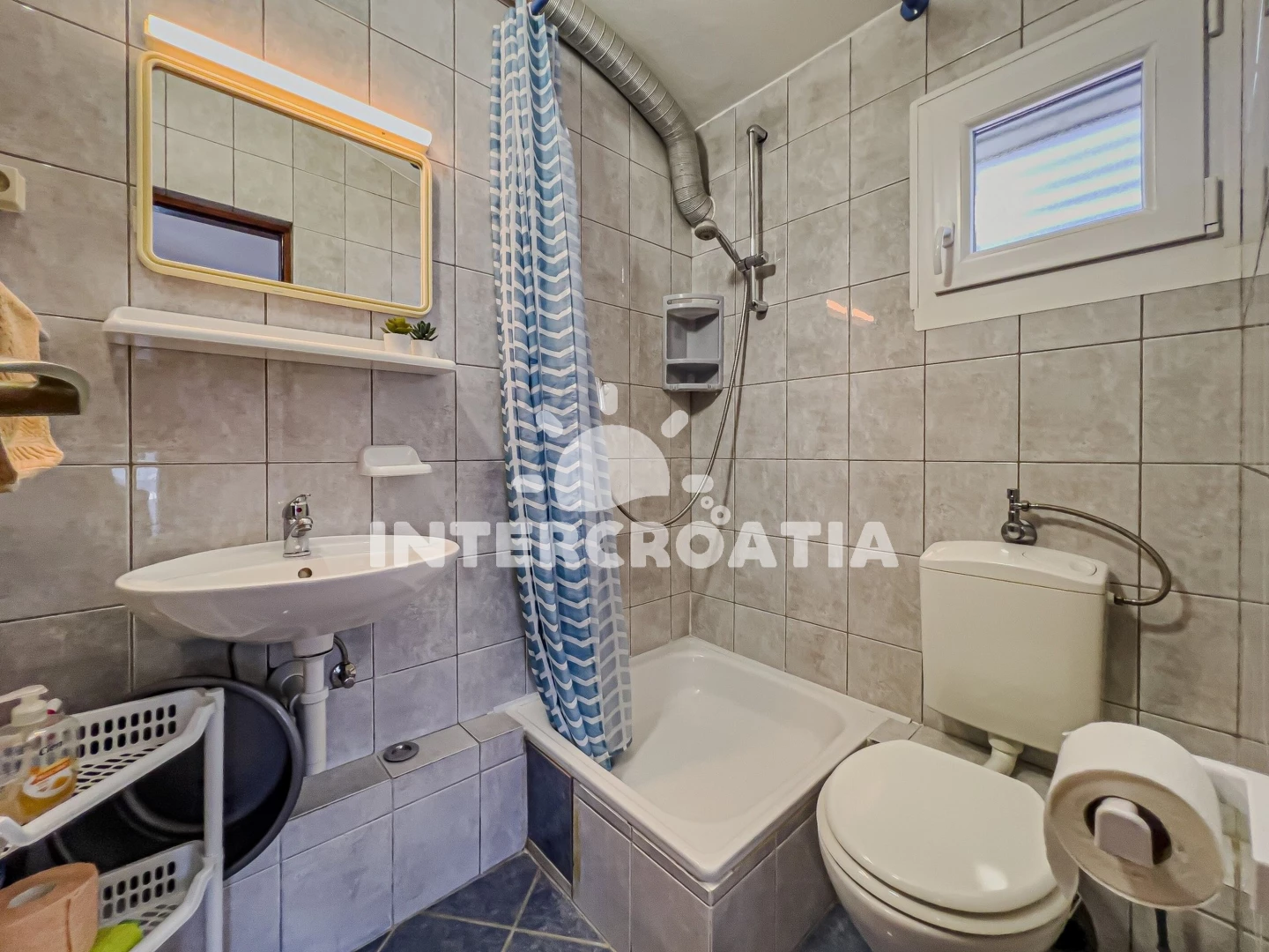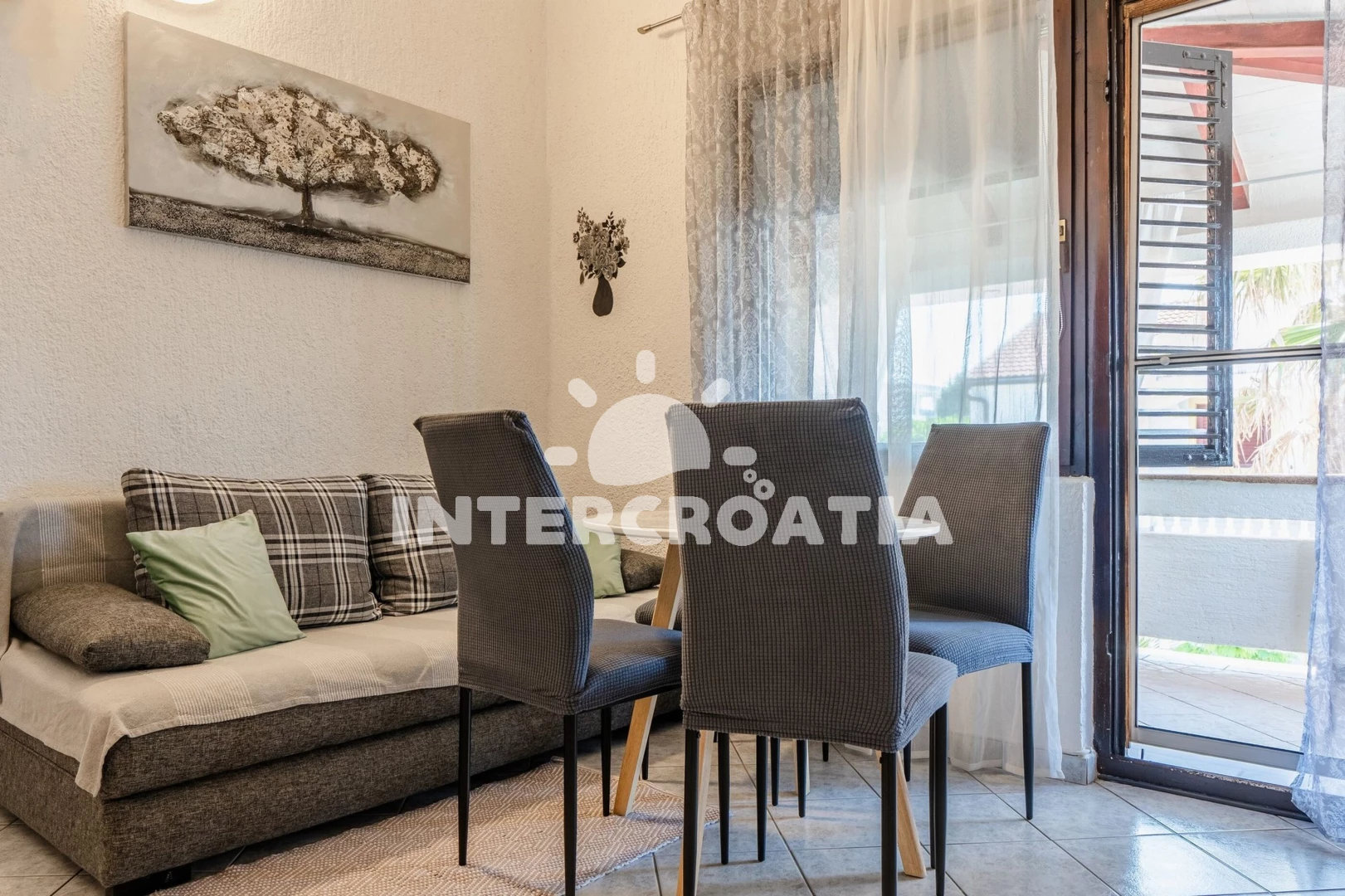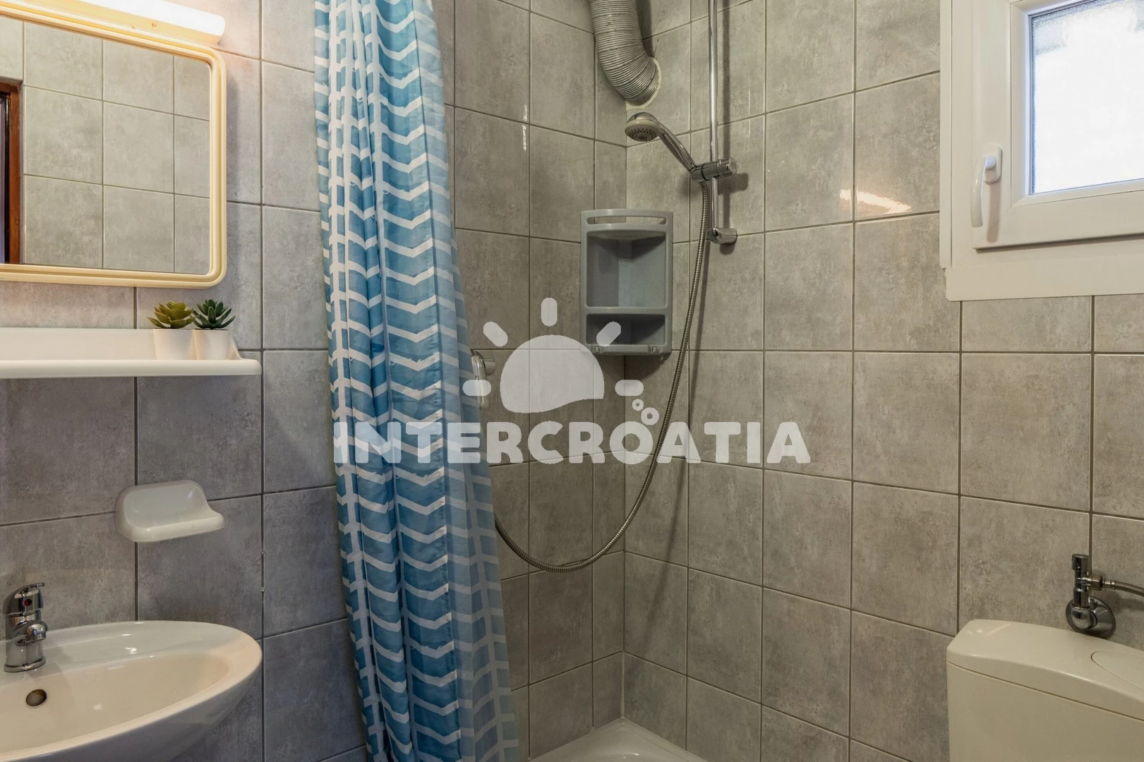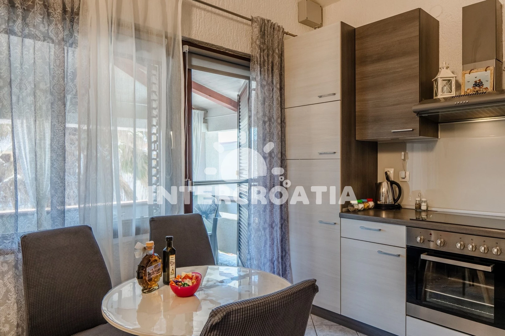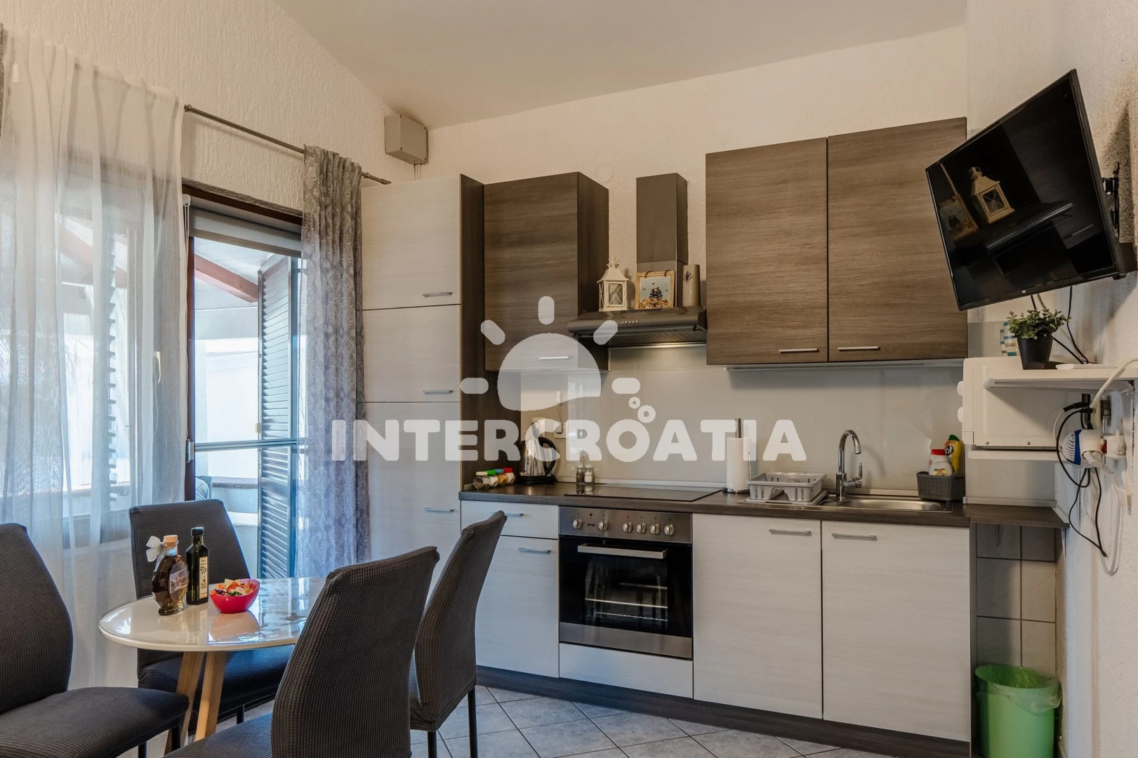 Apartmán (35 m2) s terasou, posezením a výhledem na moře se nachází v 1. patře domu. Apartmán má 1 ložnici a je vhodný pro až 4 osoby. Obývací pokoj je spojený s kuchyní. Kuchyňská linka je vybavena sklokeramickou varnou deskou, digestoří, vestavěnou troubou, mikrovlnnou troubou, rychlovarnou konvicí, toustovačem, kávovarem, nádobím a lednicí s mrazákem. Obývací pokoj s jídelním stolem, pohovkou (rozložitelná na extra lůžko pro 2 osoby), televizí se satelitním programem a vstupem na terasu. Ložnice s dvoulůžkem, klimatizací a vstupem na terasu. Koupelna se sprchovým koutem, umyvadlem, fénem a wc. Hostům je k dispozici parkování u objektu zdarma.