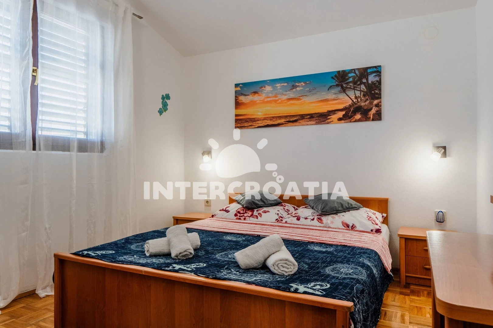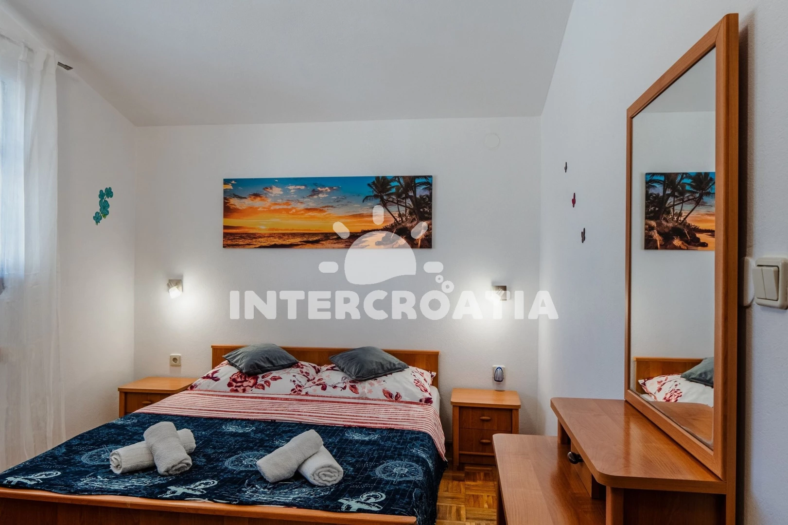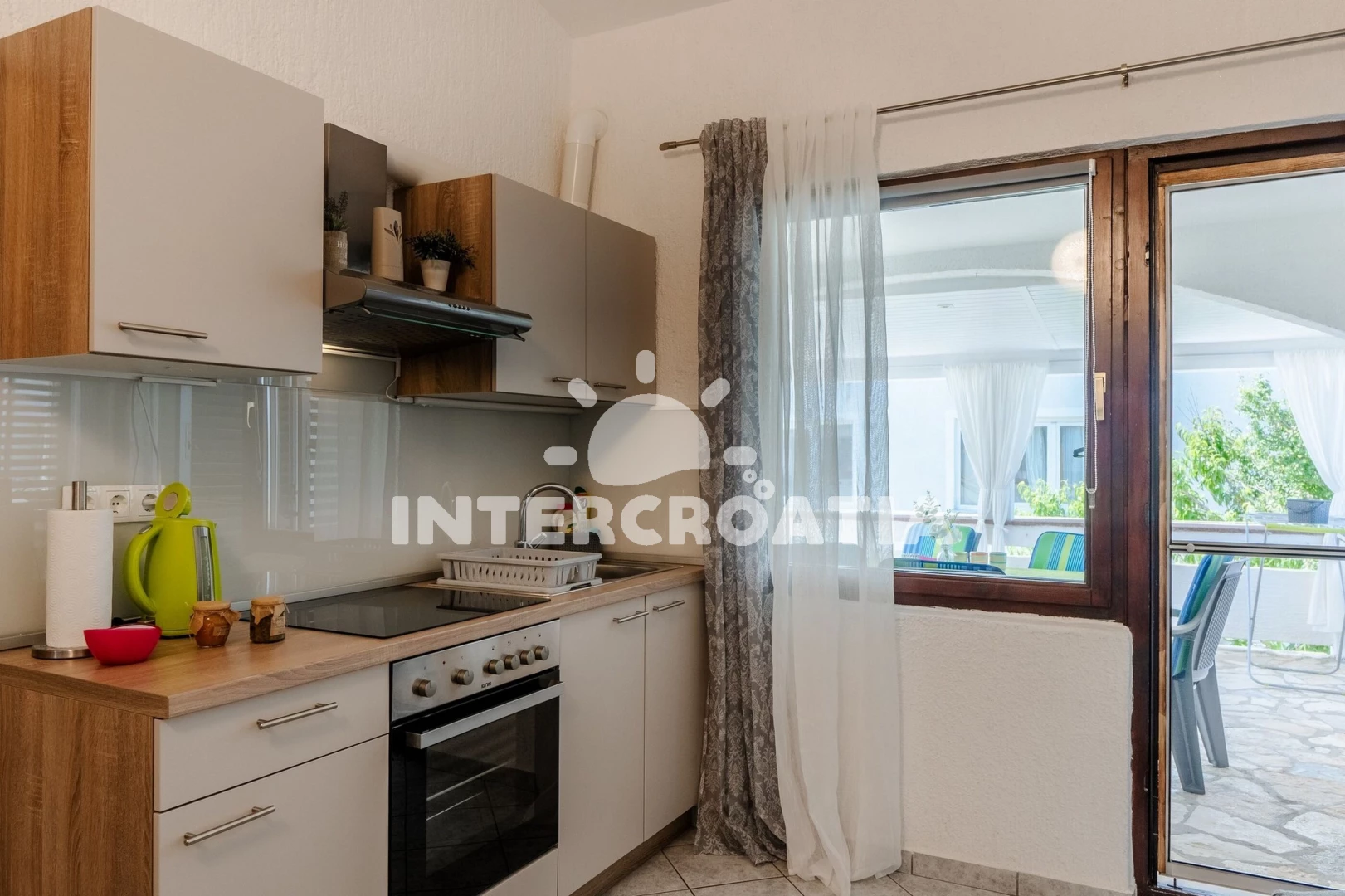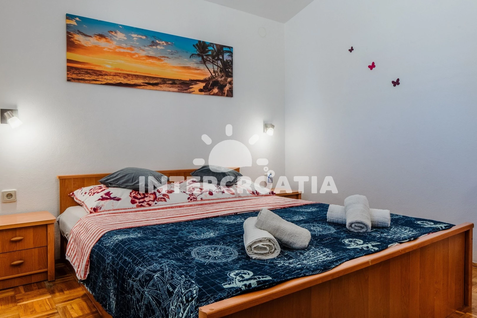 Apartmán (35 m2) s terasou, posezením a částečným výhledem na moře se nachází v 1. patře domu. Apartmán má 1 ložnici a je vhodný pro až 4 osoby. Obývací pokoj je spojený s kuchyní. Kuchyňská linka je vybavena sklokeramickou varnou deskou, digestoří, vestavěnou troubou, mikrovlnnou troubou, rychlovarnou konvicí, toustovačem, kávovarem, nádobím a lednicí s mrazákem. Obývací pokoj s jídelním stolem, pohovkou (rozložitelná na extra lůžko pro 2 osoby), televizí se satelitním programem, klimatizací a vstupem na terasu. Ložnice s jedním dvoulůžkem. Koupelna se sprchovým koutem, umyvadlem, fénem a wc. Hostům je k dispozici parkování u objektu zdarma.