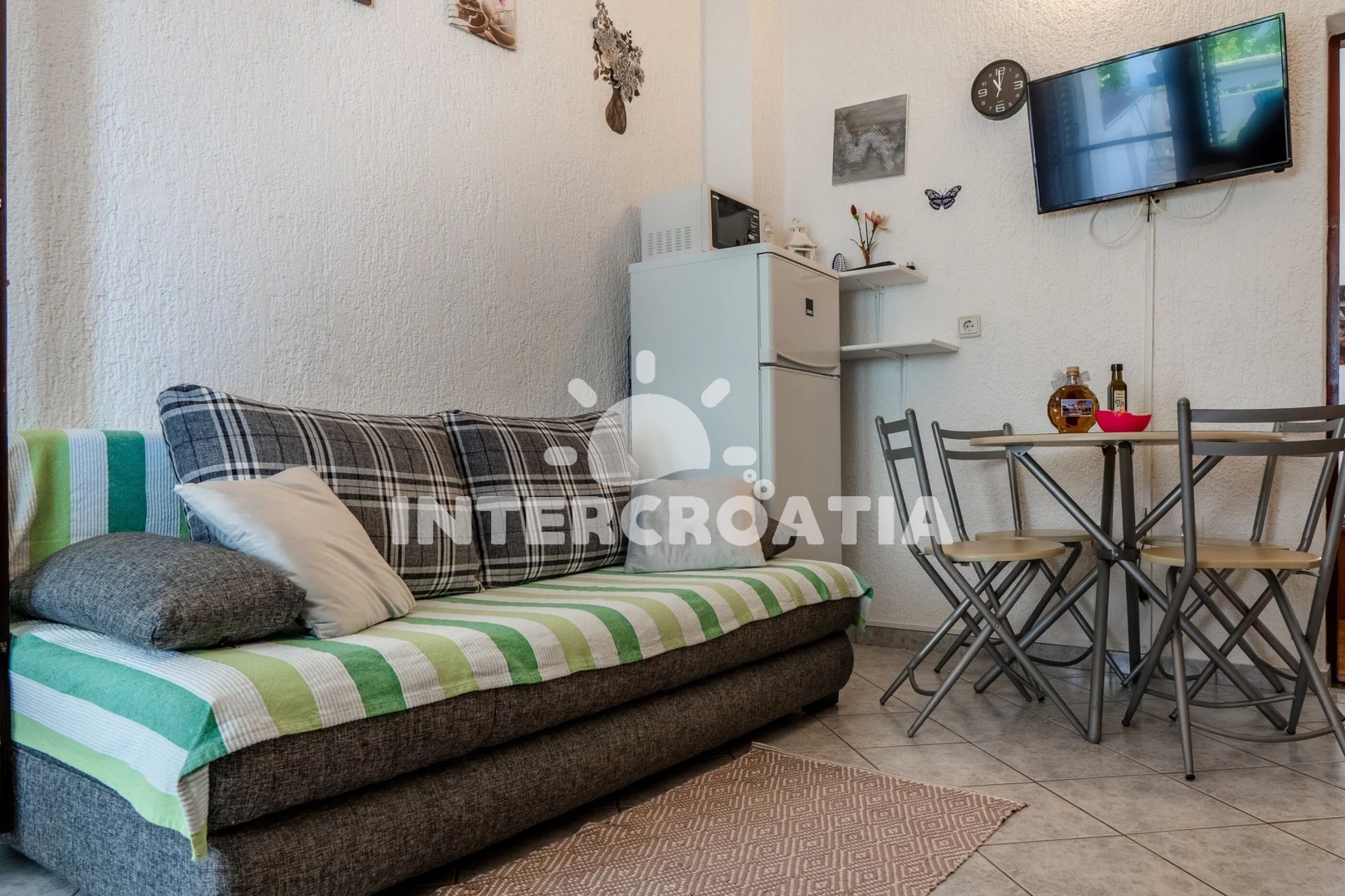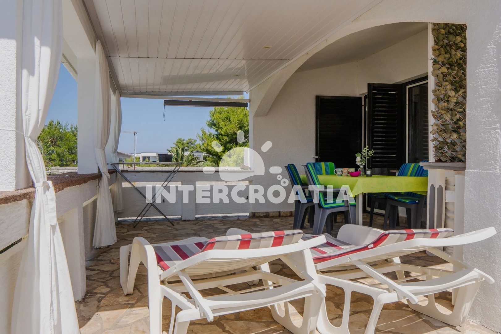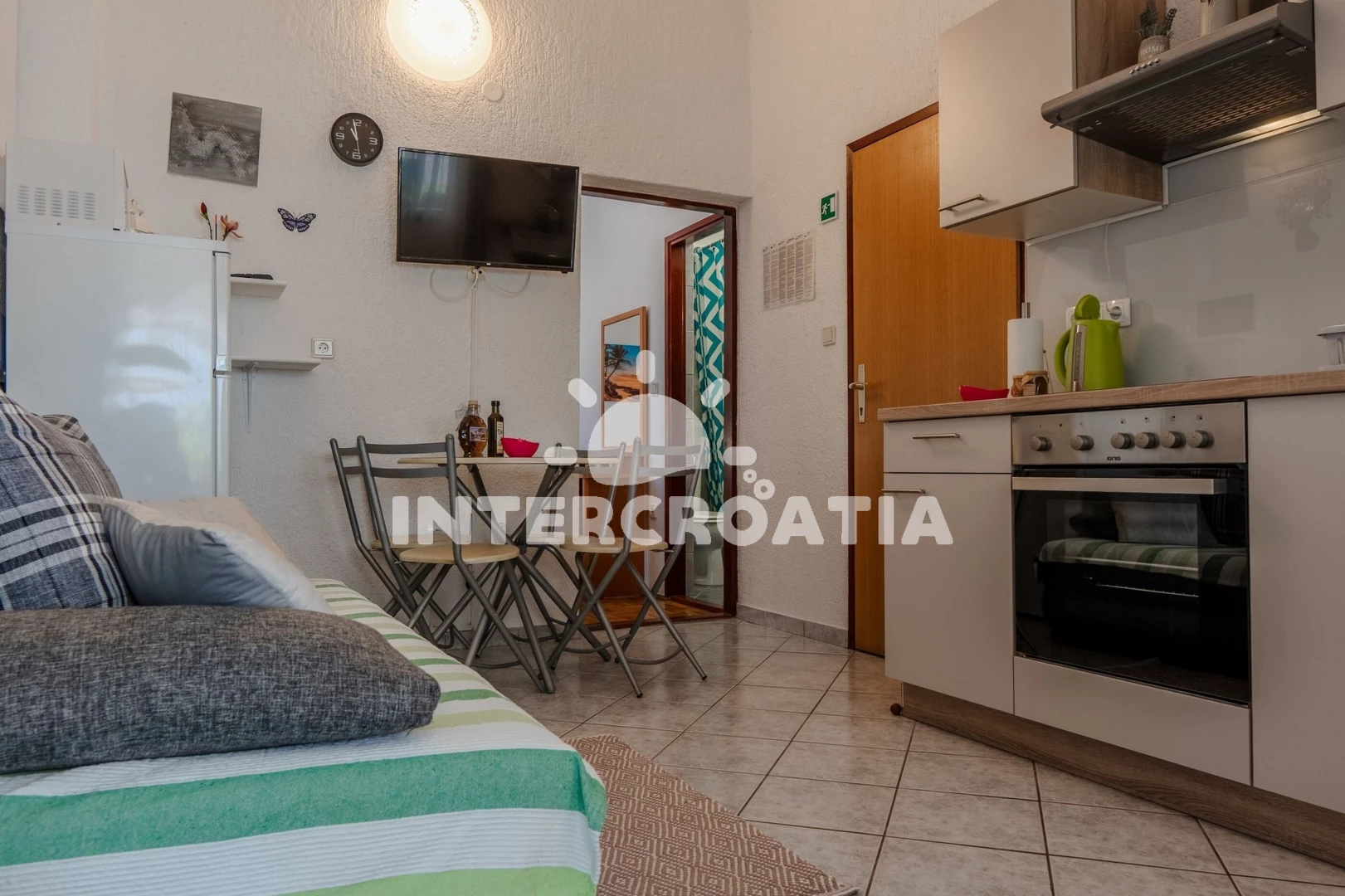 Apartmán (35 m2) s terasou, posezením a částečným výhledem na moře se nachází v 1. patře domu. Apartmán má 1 ložnici a je vhodný pro až 4 osoby. Obývací pokoj je spojený s kuchyní. Kuchyňská linka je vybavena sklokeramickou varnou deskou, digestoří, vestavěnou troubou, mikrovlnnou troubou, rychlovarnou konvicí, toustovačem, kávovarem, nádobím a lednicí s mrazákem. Obývací pokoj s jídelním stolem, pohovkou (rozložitelná na extra lůžko pro 2 osoby), televizí se satelitním programem, klimatizací a vstupem na terasu. Ložnice s jedním dvoulůžkem. Koupelna se sprchovým koutem, umyvadlem, fénem a wc. Hostům je k dispozici parkování u objektu zdarma.