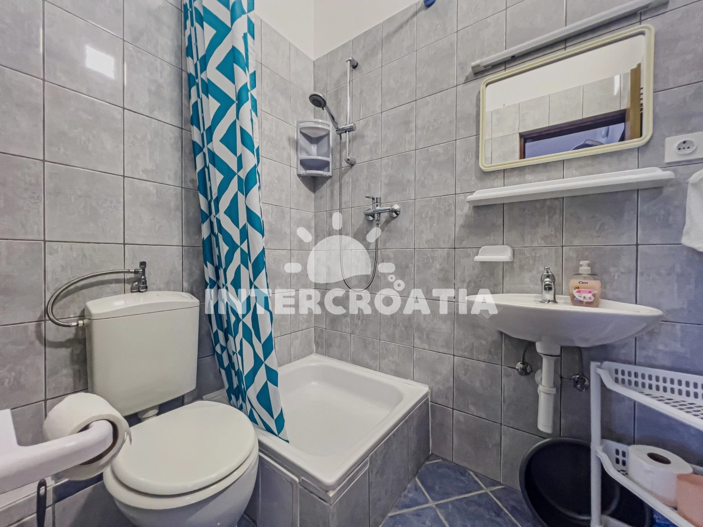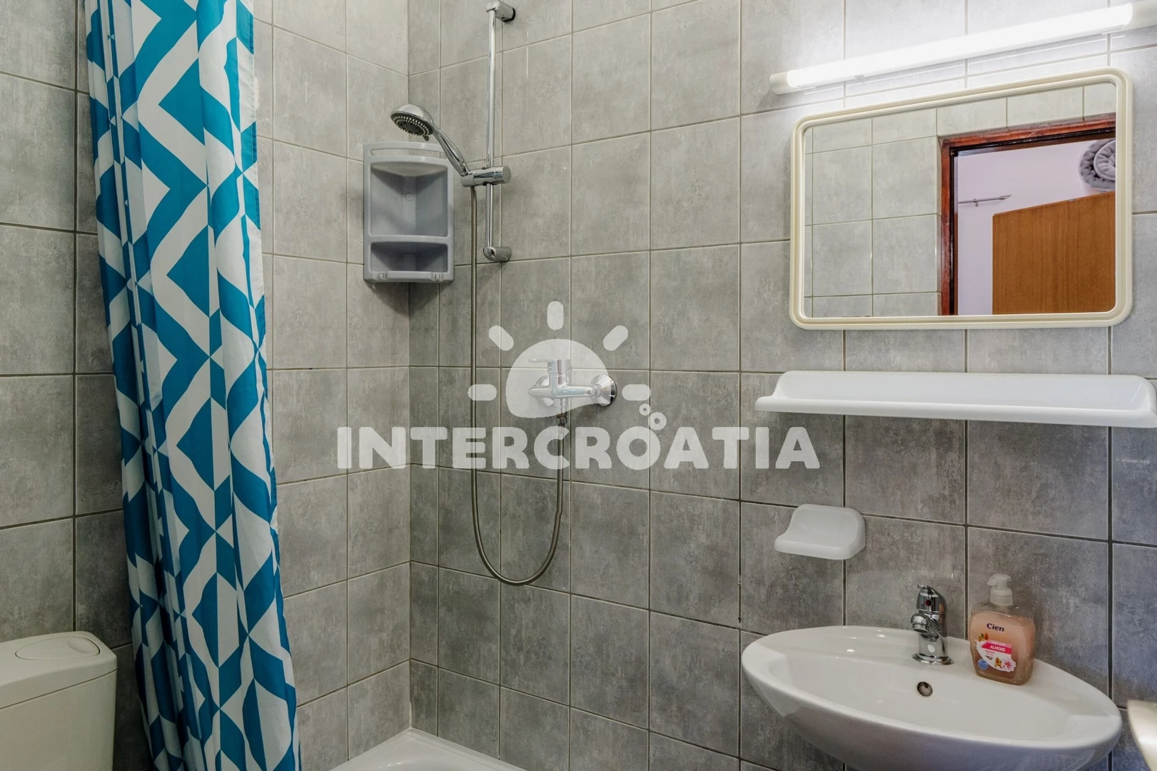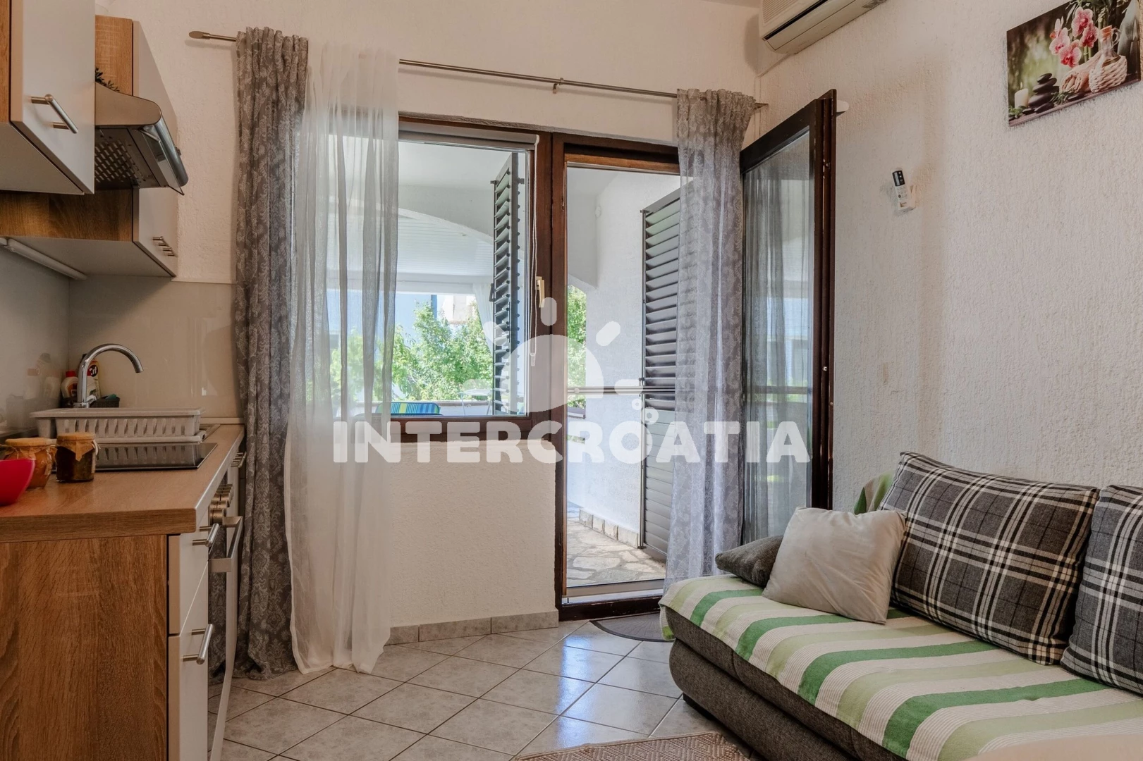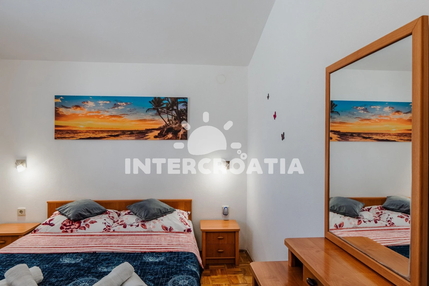 Apartmán (35 m2) s terasou, posezením a částečným výhledem na moře se nachází v 1. patře domu. Apartmán má 1 ložnici a je vhodný pro až 4 osoby. Obývací pokoj je spojený s kuchyní. Kuchyňská linka je vybavena sklokeramickou varnou deskou, digestoří, vestavěnou troubou, mikrovlnnou troubou, rychlovarnou konvicí, toustovačem, kávovarem, nádobím a lednicí s mrazákem. Obývací pokoj s jídelním stolem, pohovkou (rozložitelná na extra lůžko pro 2 osoby), televizí se satelitním programem, klimatizací a vstupem na terasu. Ložnice s jedním dvoulůžkem. Koupelna se sprchovým koutem, umyvadlem, fénem a wc. Hostům je k dispozici parkování u objektu zdarma.