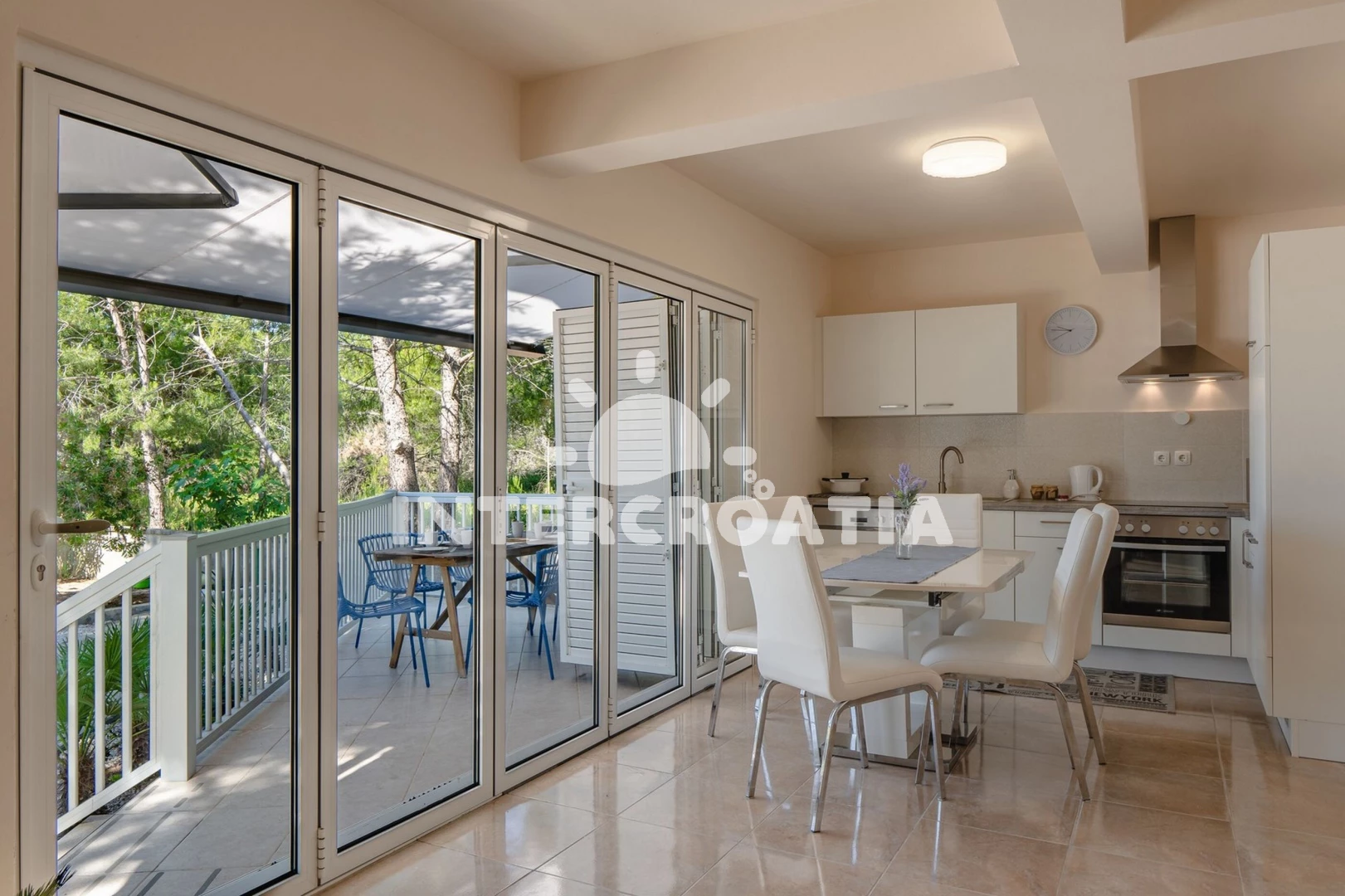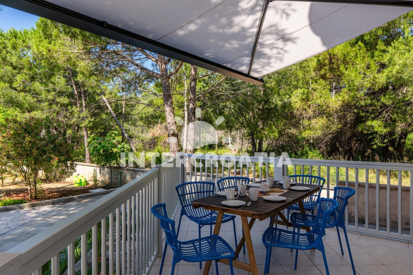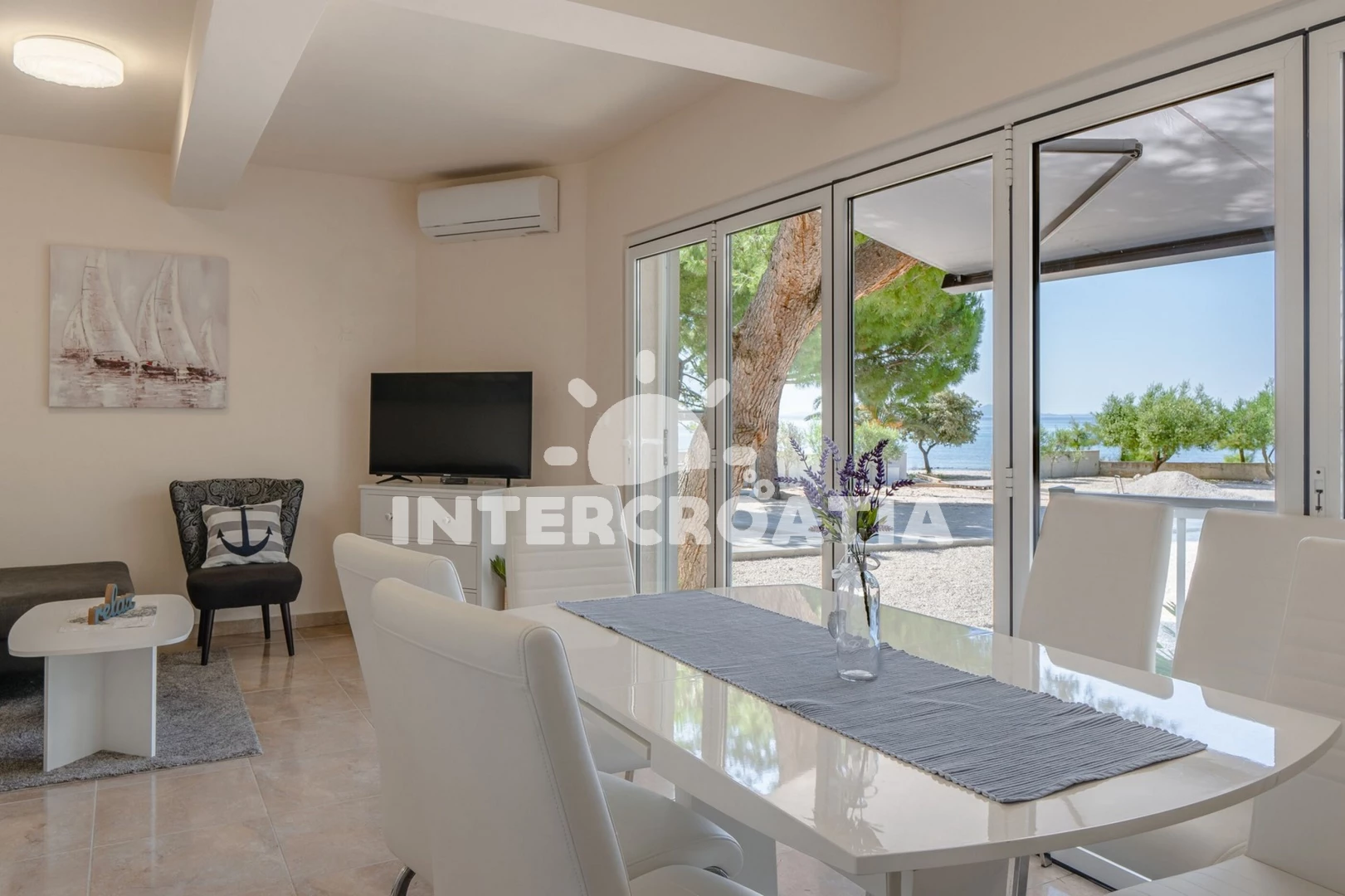 Nádherný dům s velkým pozemkem a zahradou se nachází v těsné blízkosti moře a oblázkové pláže, kterou doplňují betonová mola. Dům disponuje velkou vybaveností jako je společná zahrada s terasou, pergolami, posezením, zahradní kuchyní a grilem. Apartmány jsou moderně zařízené, klimatizované a disponují soukromými lodžiemi s venkovním posezením. U domu jsou parkovací místa pro automobily.