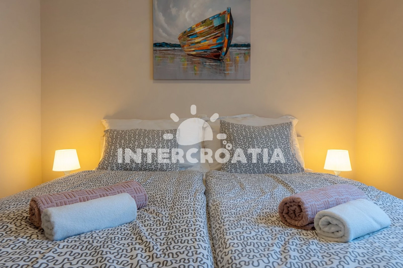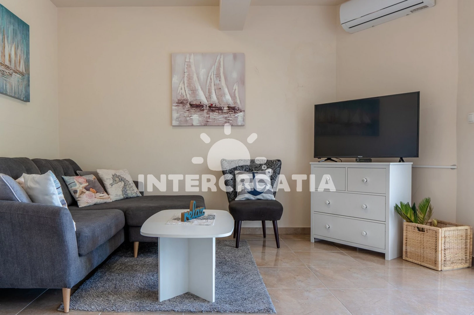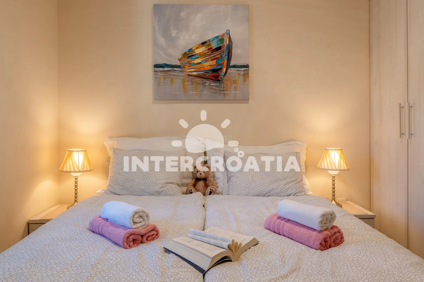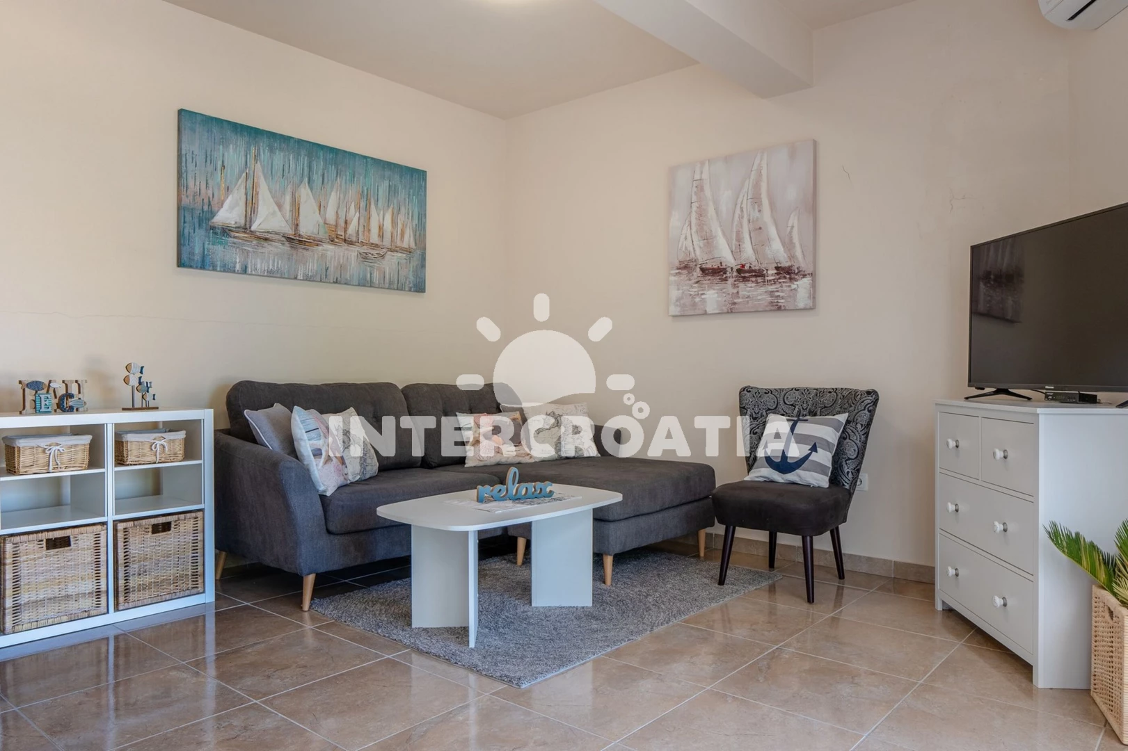 Apartmán (60 m2) s terasou, posezením a výhledem na moře se nachází v přízemí domu. Apartmán má 2 ložnice a je vhodný pro až 4 osoby. Obývací pokoj je spojený s kuchyní. Kuchyňská linka je vybavena sklokeramickou varnou deskou, digestoří, vestavěnou troubou, myčkou na nádobí, mikrovlnnou troubou, rychlovarnou konvicí, kávovarem, toustovačem, nádobím a lednicí s mrazákem. Obývací pokoj s jídelním stolem, pohovkou, televizí, klimatizací a vstupem na terasu. První ložnice s dvoulůžkem. Druhá ložnice s dvoulůžkem. Koupelna se sprchovým koutem, umyvadlem, fénem a wc. Hostům je k dispozici parkování u objektu zdarma.
