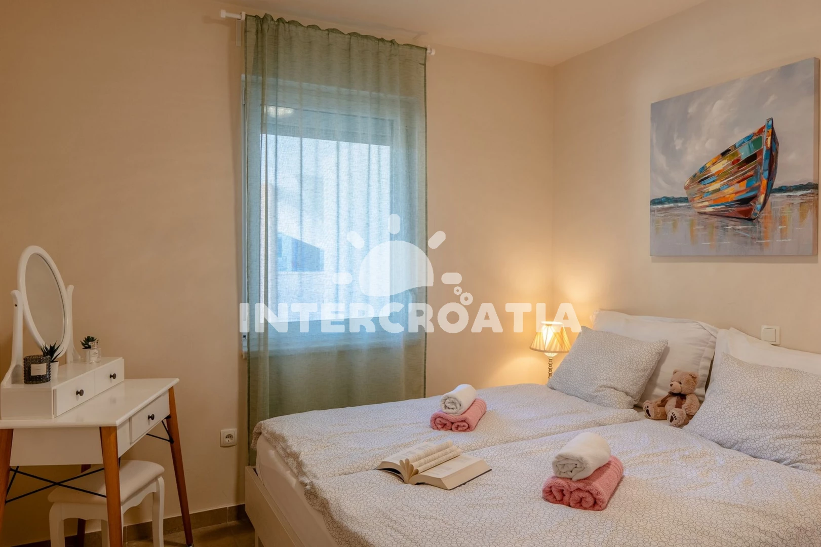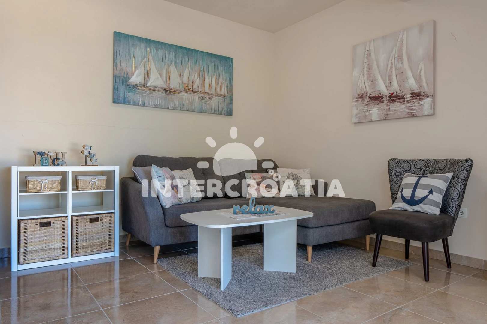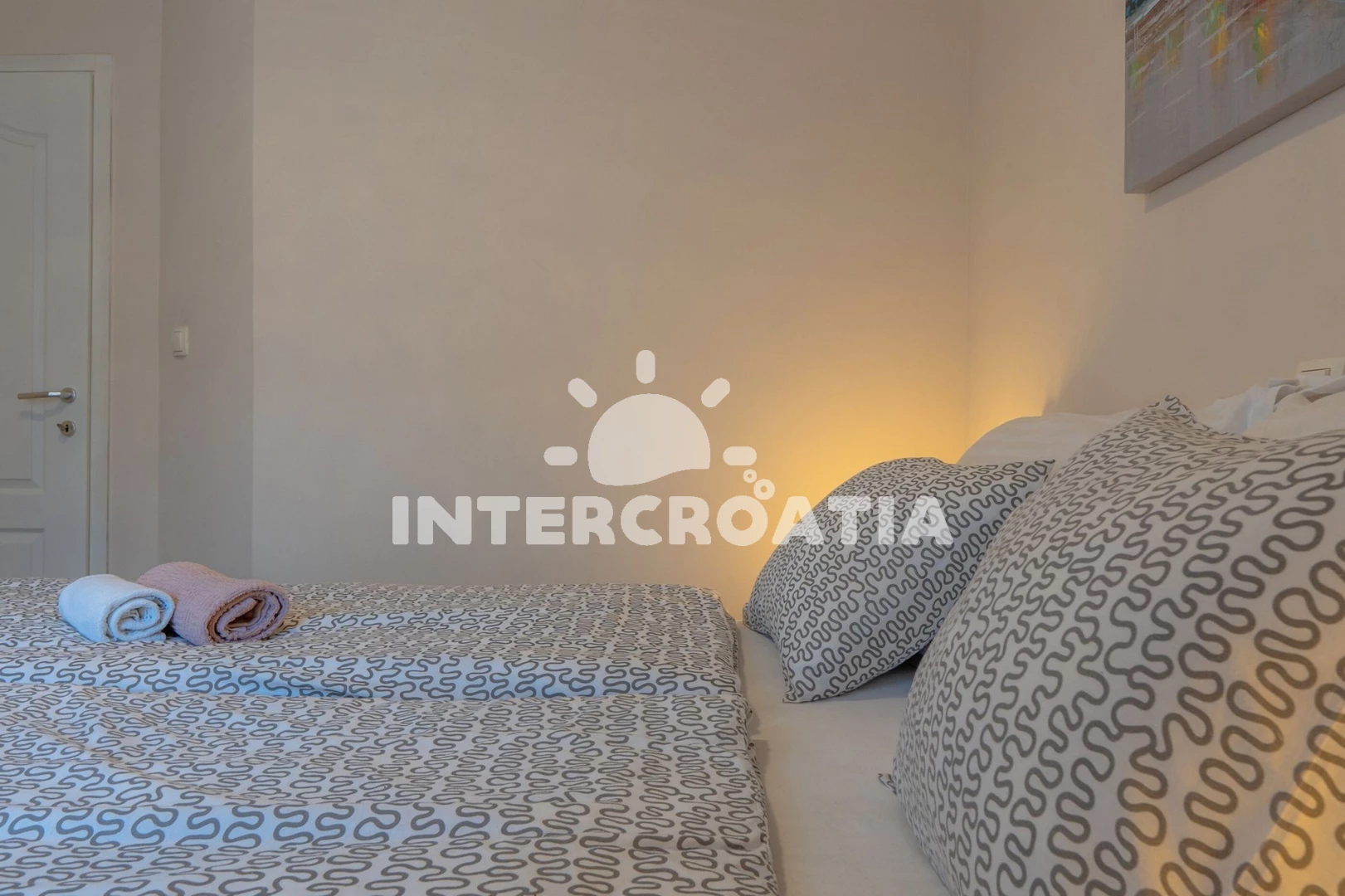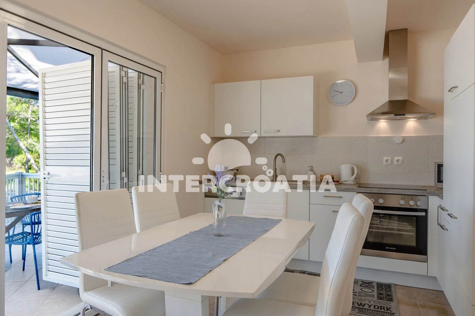 Apartmán (60 m2) s terasou, posezením a výhledem na moře se nachází v přízemí domu. Apartmán má 2 ložnice a je vhodný pro až 4 osoby. Obývací pokoj je spojený s kuchyní. Kuchyňská linka je vybavena sklokeramickou varnou deskou, digestoří, vestavěnou troubou, myčkou na nádobí, mikrovlnnou troubou, rychlovarnou konvicí, kávovarem, toustovačem, nádobím a lednicí s mrazákem. Obývací pokoj s jídelním stolem, pohovkou, televizí, klimatizací a vstupem na terasu. První ložnice s dvoulůžkem. Druhá ložnice s dvoulůžkem. Koupelna se sprchovým koutem, umyvadlem, fénem a wc. Hostům je k dispozici parkování u objektu zdarma.