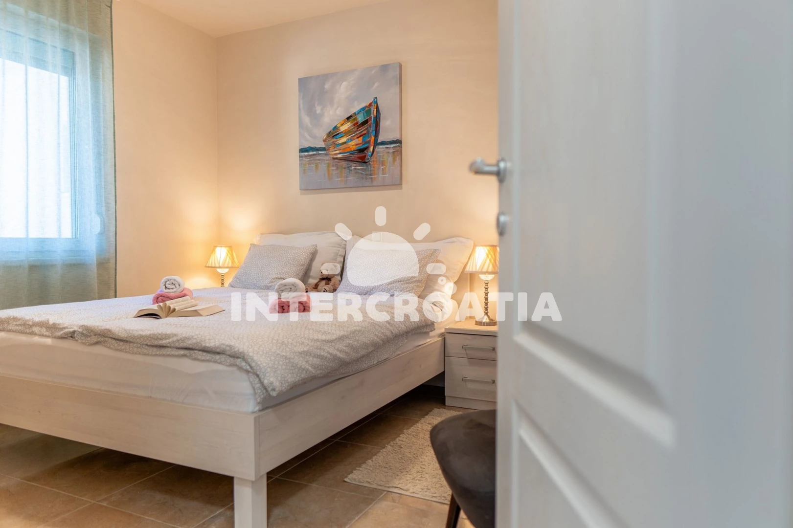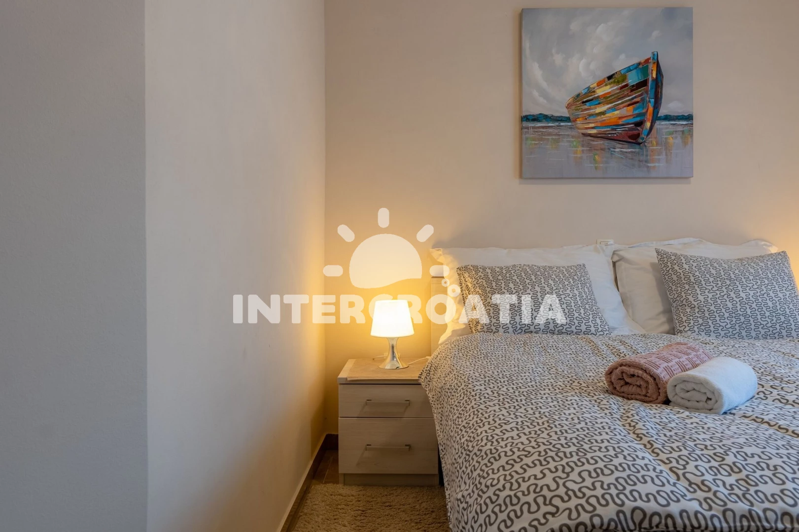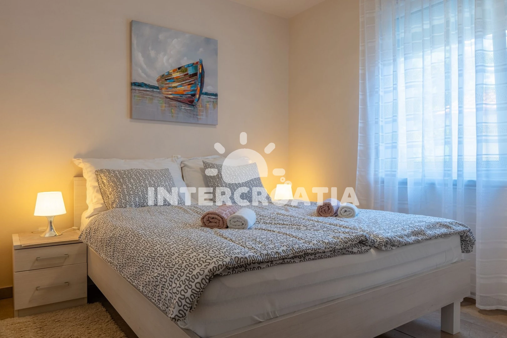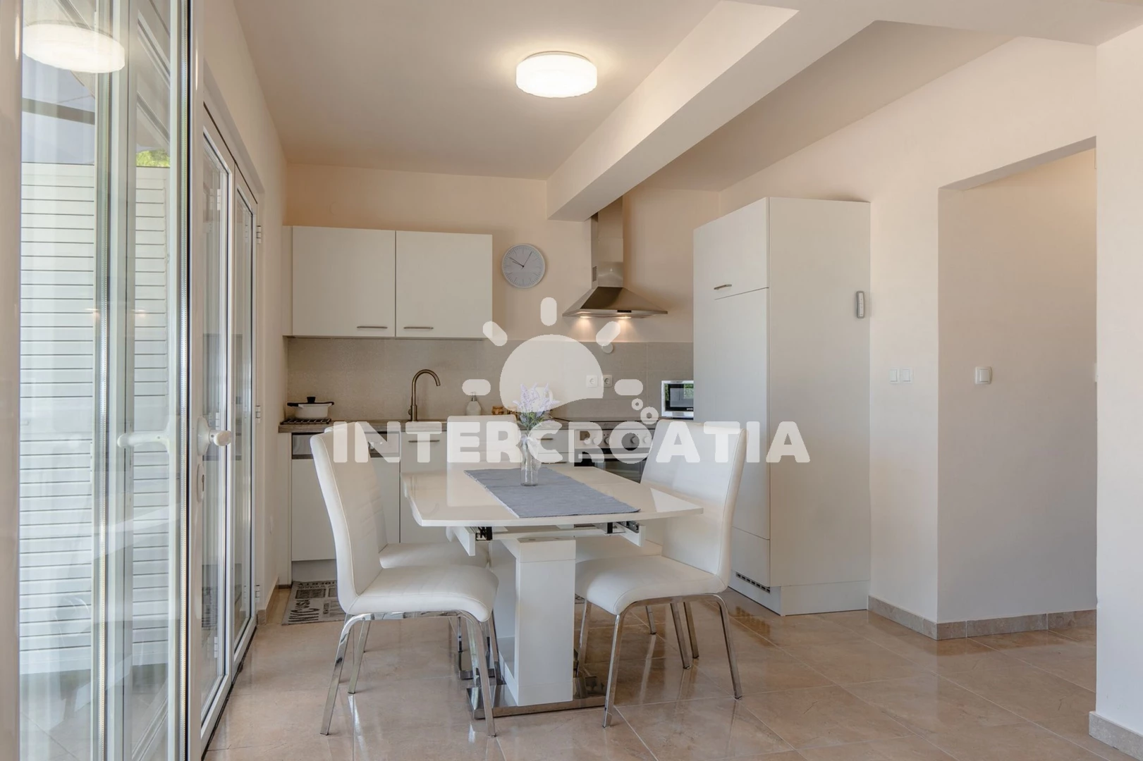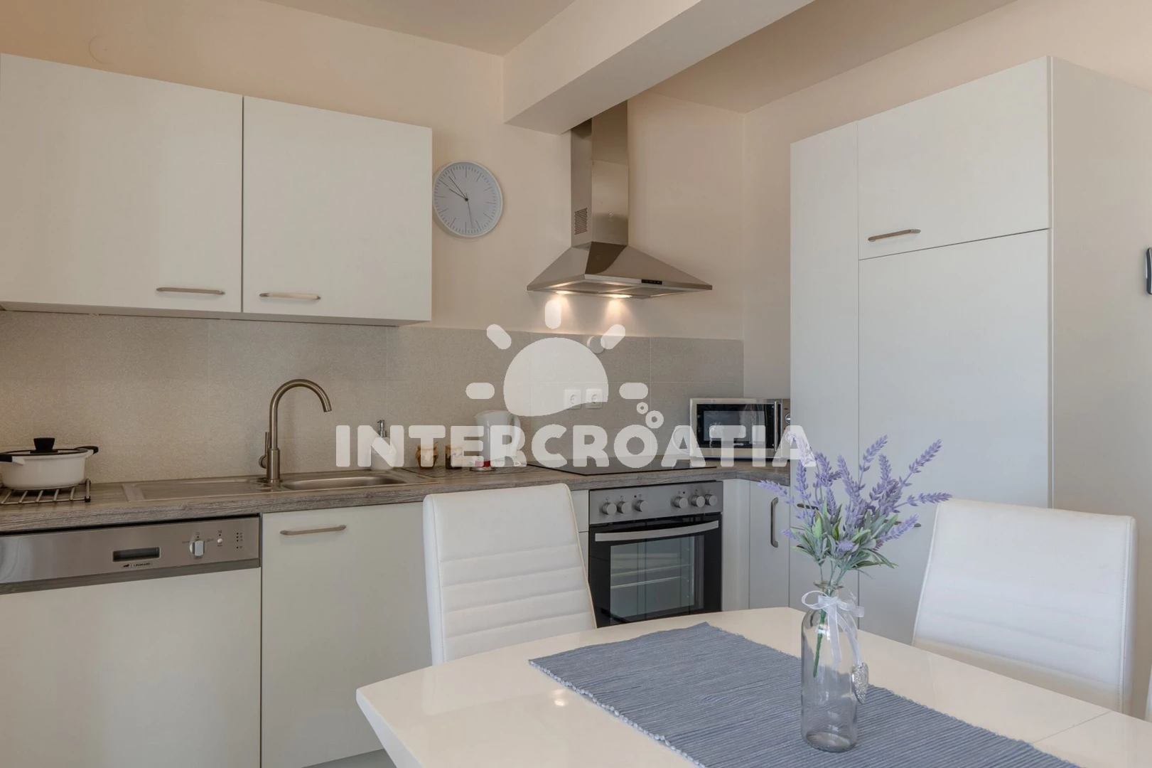 Apartmán (60 m2) s terasou, posezením a výhledem na moře se nachází v přízemí domu. Apartmán má 2 ložnice a je vhodný pro až 4 osoby. Obývací pokoj je spojený s kuchyní. Kuchyňská linka je vybavena sklokeramickou varnou deskou, digestoří, vestavěnou troubou, myčkou na nádobí, mikrovlnnou troubou, rychlovarnou konvicí, kávovarem, toustovačem, nádobím a lednicí s mrazákem. Obývací pokoj s jídelním stolem, pohovkou, televizí, klimatizací a vstupem na terasu. První ložnice s dvoulůžkem. Druhá ložnice s dvoulůžkem. Koupelna se sprchovým koutem, umyvadlem, fénem a wc. Hostům je k dispozici parkování u objektu zdarma.