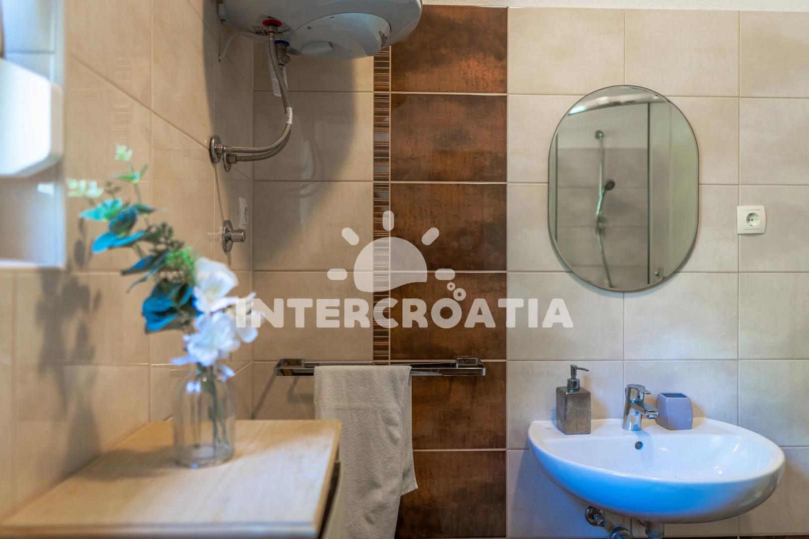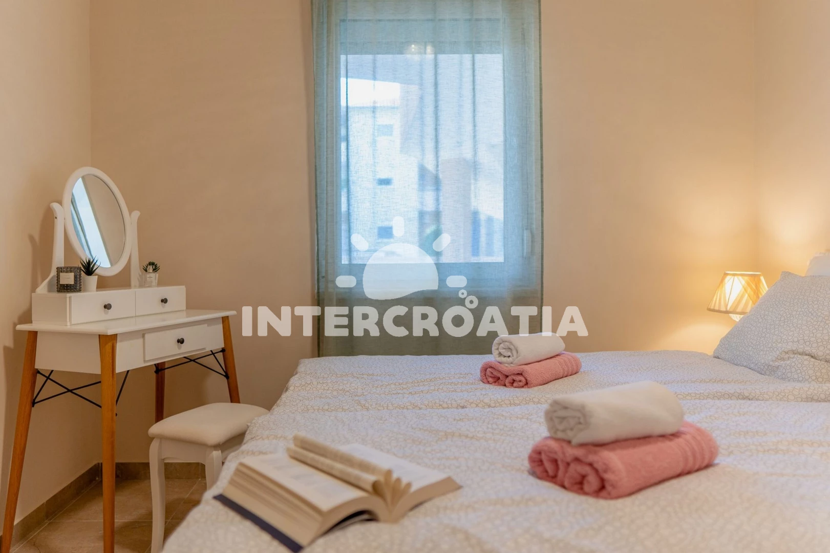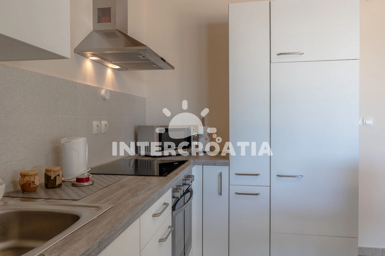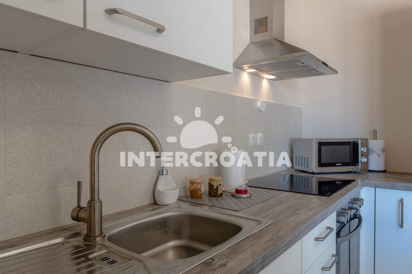 Apartmán (60 m2) s terasou, posezením a výhledem na moře se nachází v přízemí domu. Apartmán má 2 ložnice a je vhodný pro až 4 osoby. Obývací pokoj je spojený s kuchyní. Kuchyňská linka je vybavena sklokeramickou varnou deskou, digestoří, vestavěnou troubou, myčkou na nádobí, mikrovlnnou troubou, rychlovarnou konvicí, kávovarem, toustovačem, nádobím a lednicí s mrazákem. Obývací pokoj s jídelním stolem, pohovkou, televizí, klimatizací a vstupem na terasu. První ložnice s dvoulůžkem. Druhá ložnice s dvoulůžkem. Koupelna se sprchovým koutem, umyvadlem, fénem a wc. Hostům je k dispozici parkování u objektu zdarma.