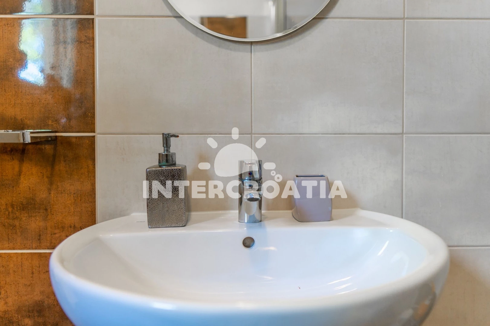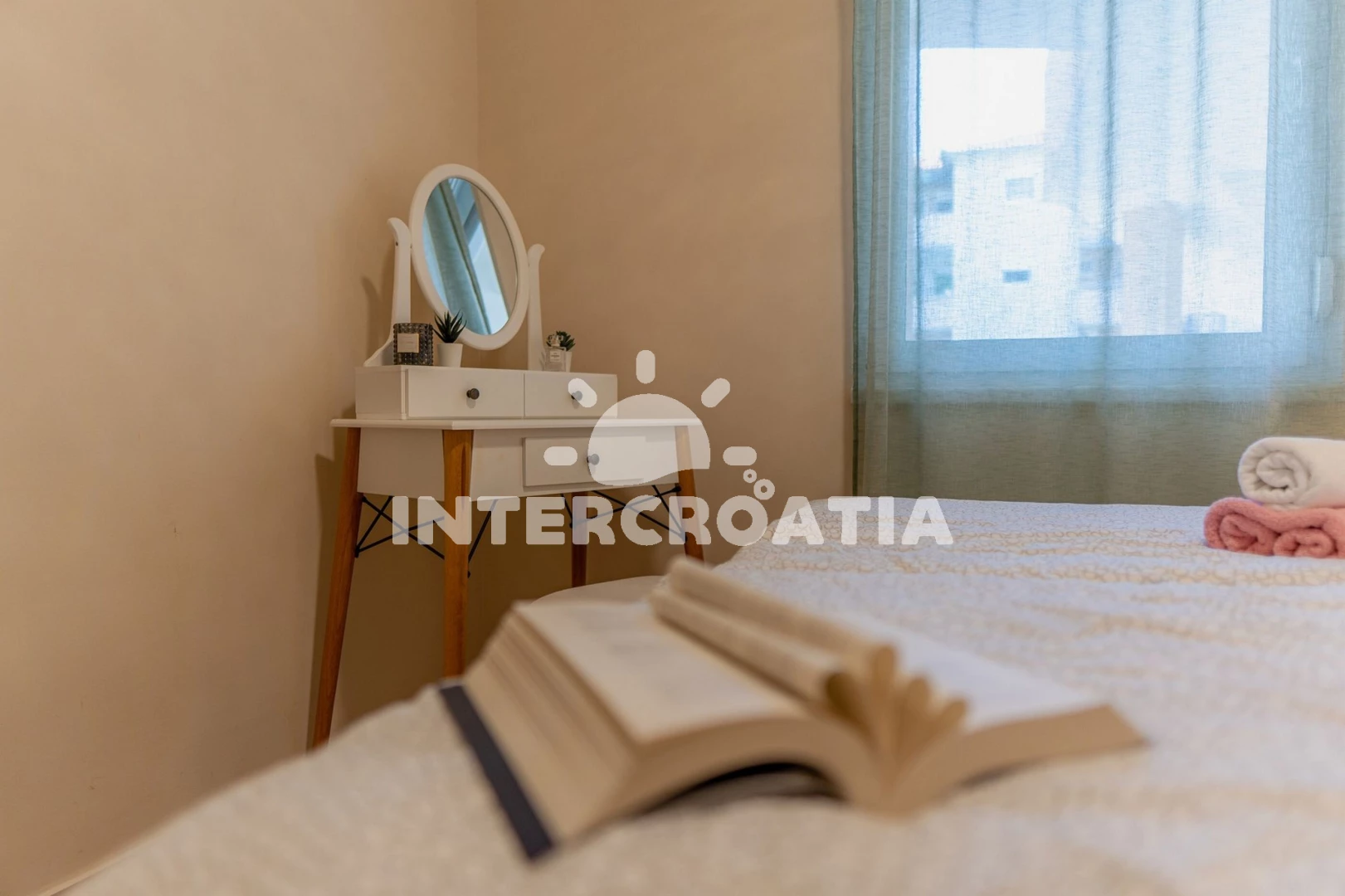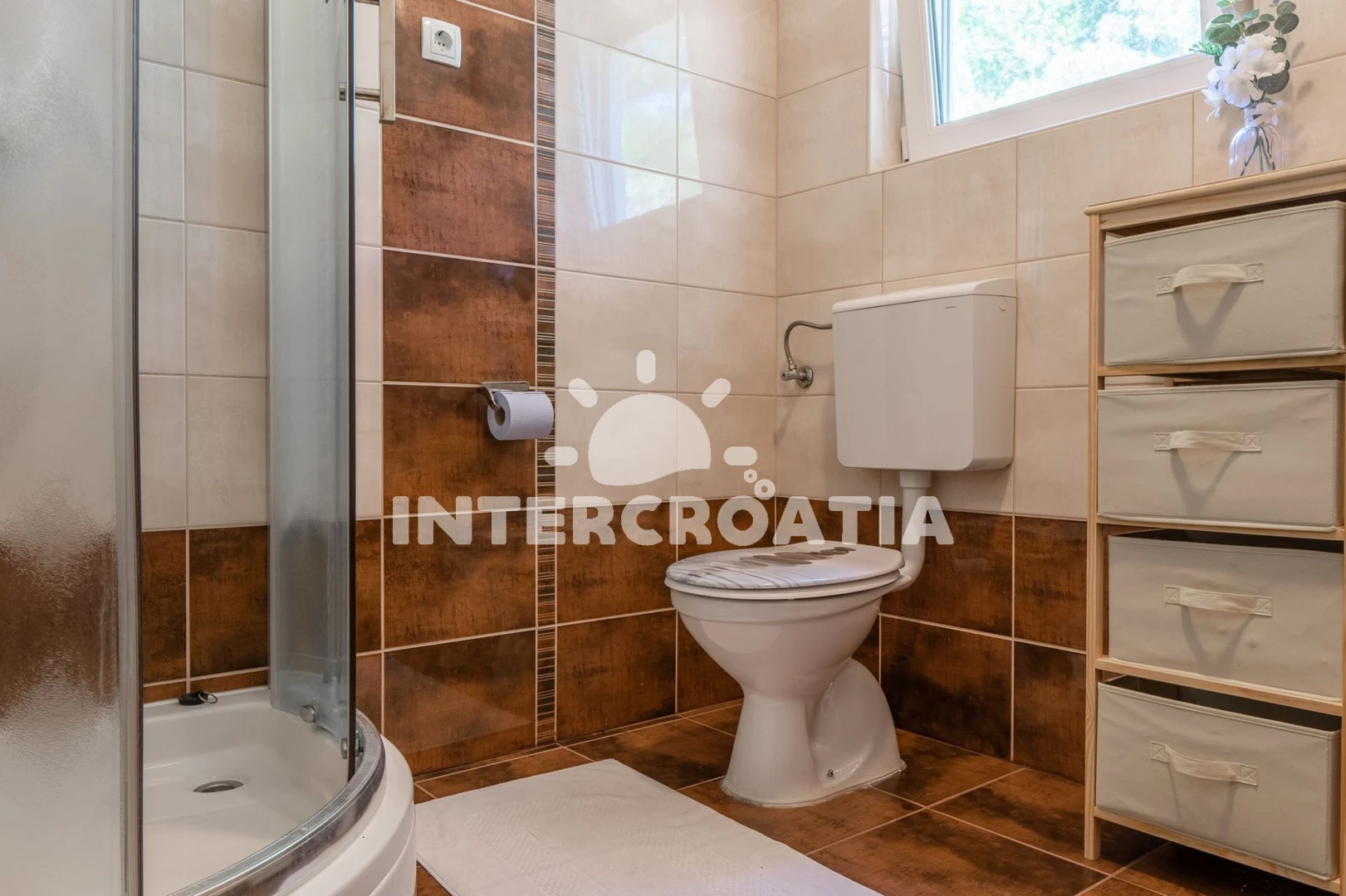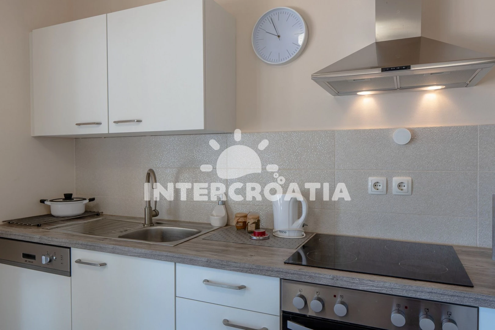 Apartmán (60 m2) s terasou, posezením a výhledem na moře se nachází v přízemí domu. Apartmán má 2 ložnice a je vhodný pro až 4 osoby. Obývací pokoj je spojený s kuchyní. Kuchyňská linka je vybavena sklokeramickou varnou deskou, digestoří, vestavěnou troubou, myčkou na nádobí, mikrovlnnou troubou, rychlovarnou konvicí, kávovarem, toustovačem, nádobím a lednicí s mrazákem. Obývací pokoj s jídelním stolem, pohovkou, televizí, klimatizací a vstupem na terasu. První ložnice s dvoulůžkem. Druhá ložnice s dvoulůžkem. Koupelna se sprchovým koutem, umyvadlem, fénem a wc. Hostům je k dispozici parkování u objektu zdarma.