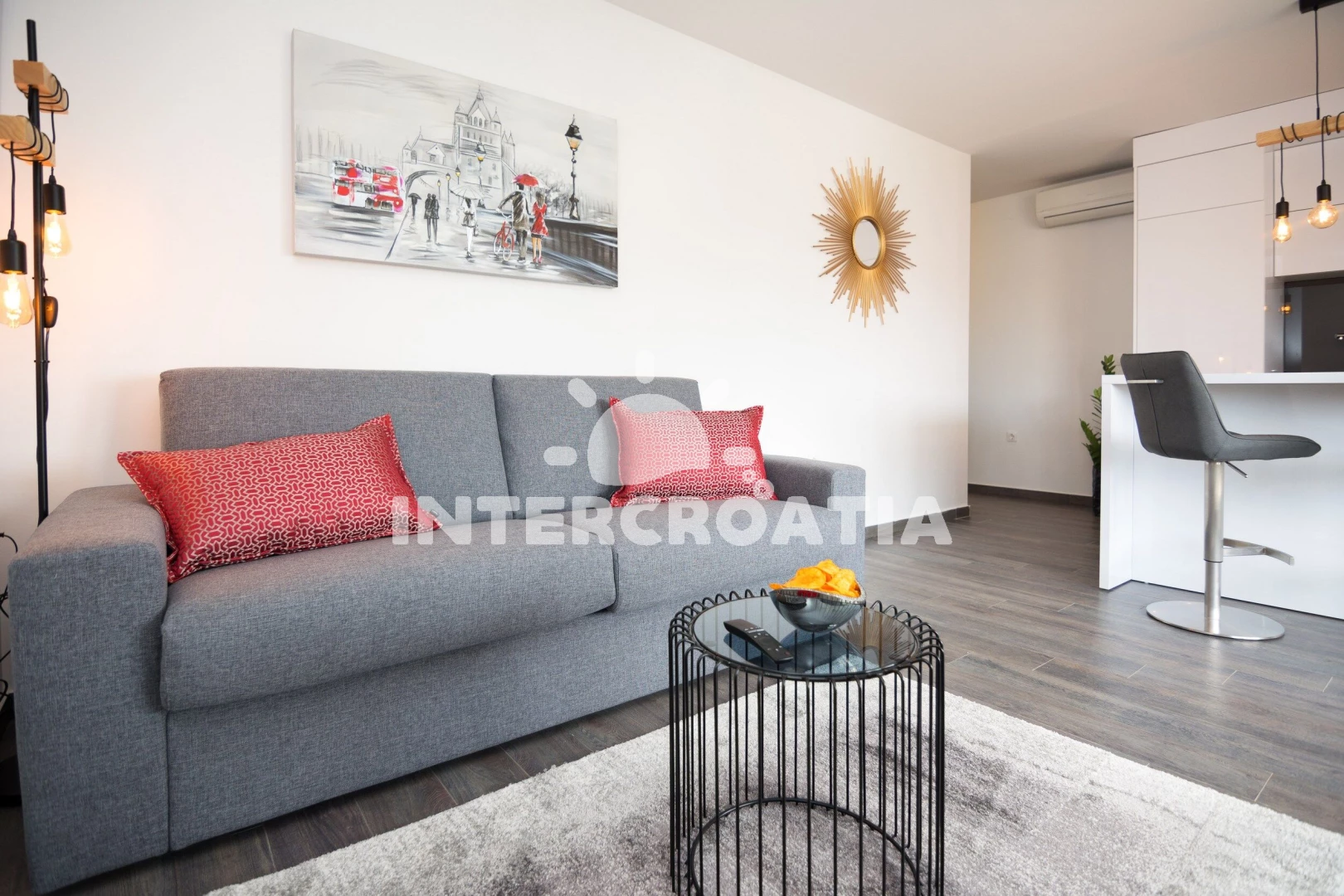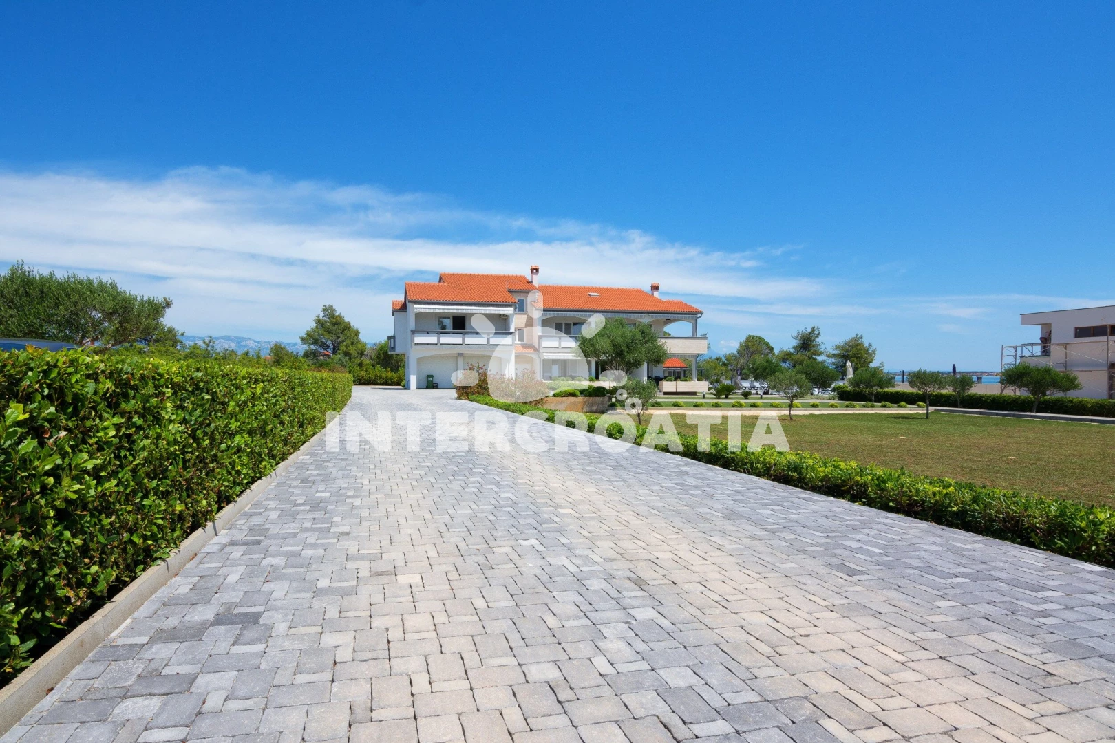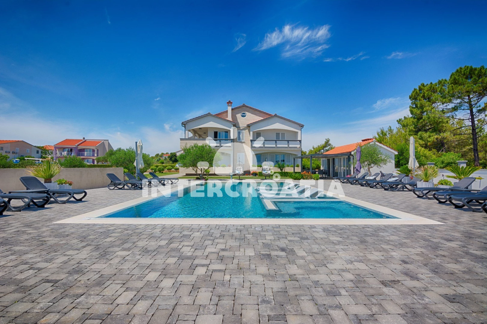 Luxusně zařízená apartmánová vila s venkovním bazénem, lehátky, posezením a zahradou se nachází v 1. řadě přímo u moře a oblázkové pláže. K dispozici je zahradní kuchyň s terasou, pergolou, posezením a zděným grilem. Apartmány jsou klimatizované, moderně zařízené a disponují lodžiemi s venkovním posezením. Parkovací místa pro automobily jsou u vily.