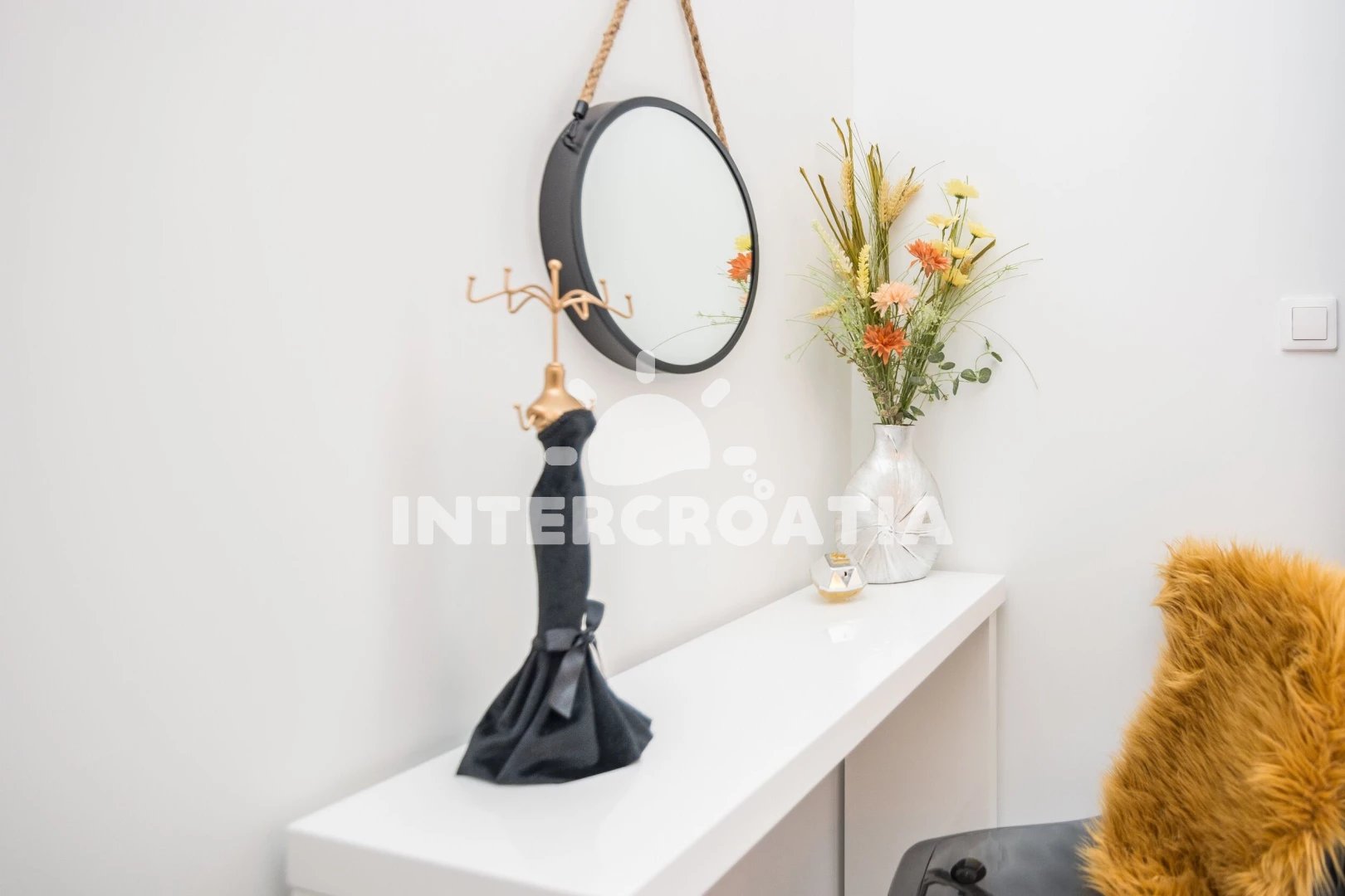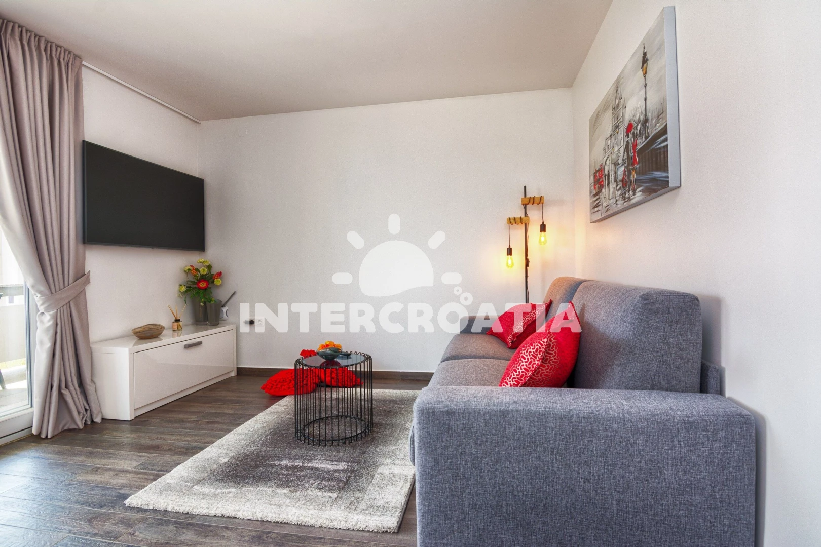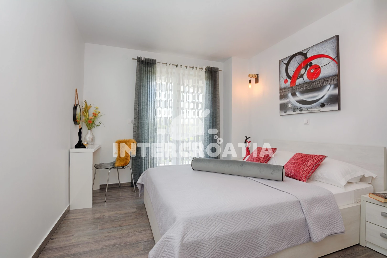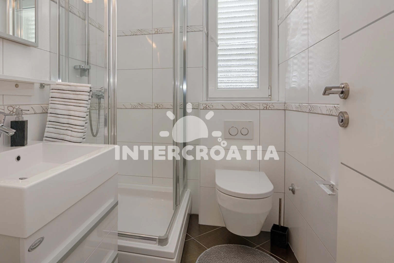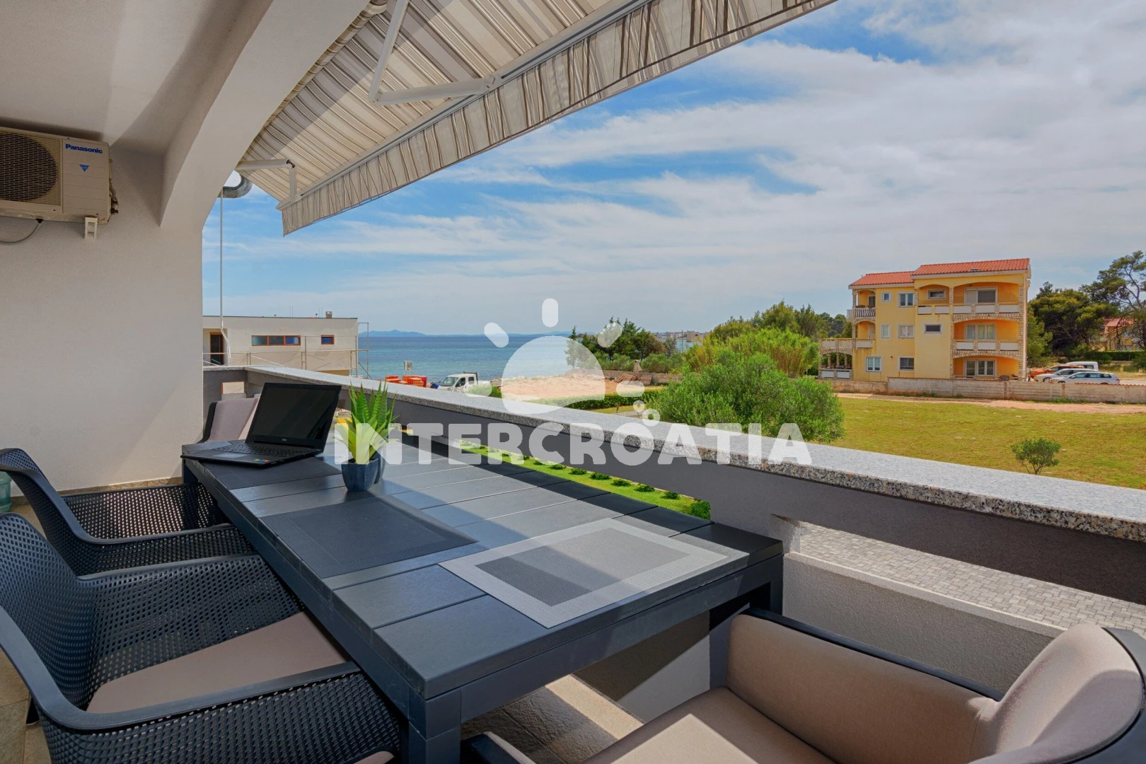 Apartmán (45 m2) s terasou, posezením a výhledem na moře se nachází v 1. patře vily. Apartmán má 1 ložnici a je vhodný pro až 4 osoby. Obývací pokoj je spojený s kuchyní. Kuchyňská linka je vybavena sklokeramickou varnou deskou, digestoří, myčkou na nádobí, rychlovarnou konvicí, mikrovlnnou troubou, kávovarem, toustovačem, nádobím a lednicí s mrazákem. Obývací pokoj s barovým stolem, pohovkou (rozložitelná na extra lůžko pro 2 osoby), televizí se satelitním programem, klimatizací a vstupem na terasu. Ložnice s dvoulůžkem, sejfem a vstupem na terasu. Koupelna se sprchovým koutem, umyvadlem, fénem, pračkou, žehličkou a wc. Hostům je k dispozici parkování u vily zdarma.