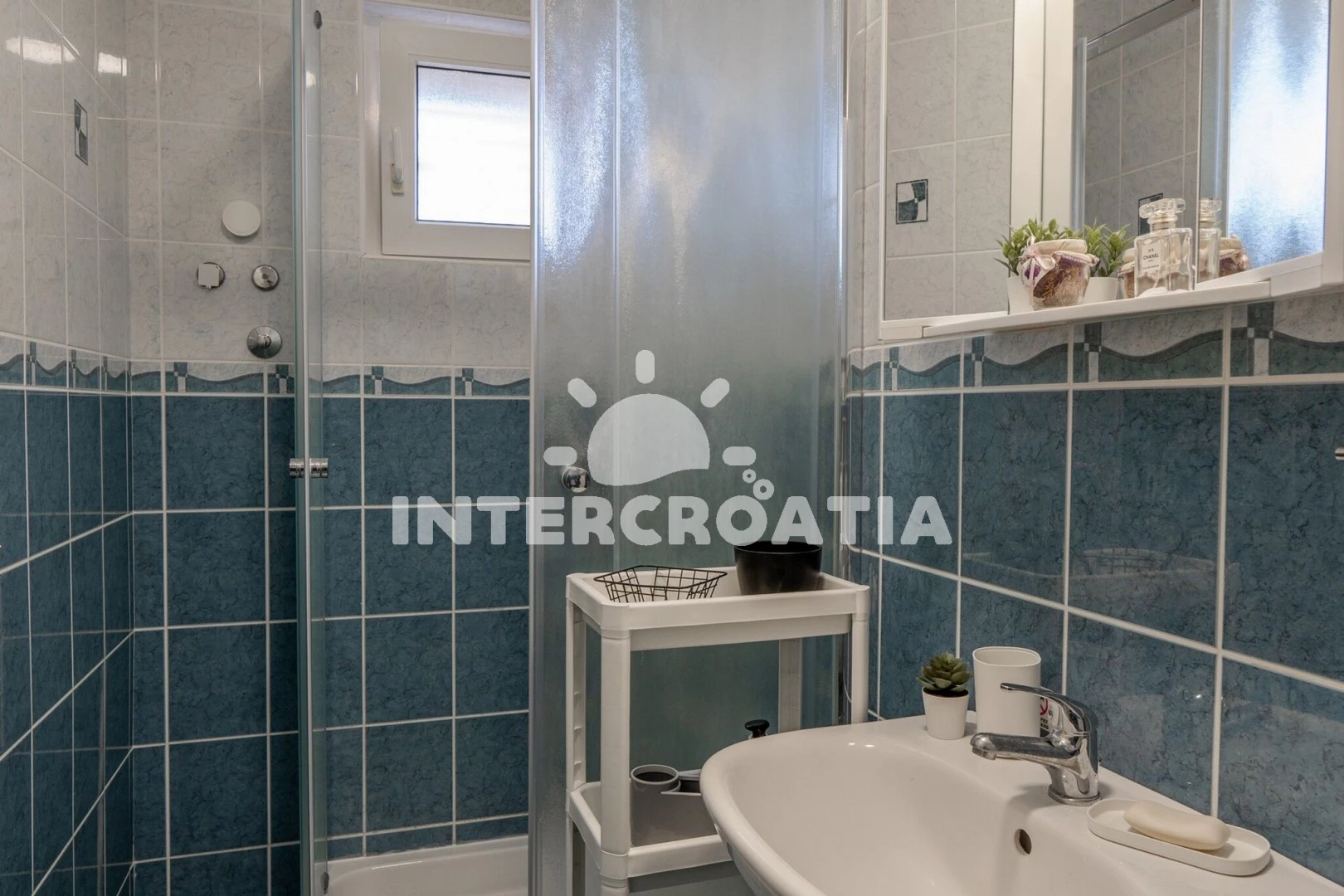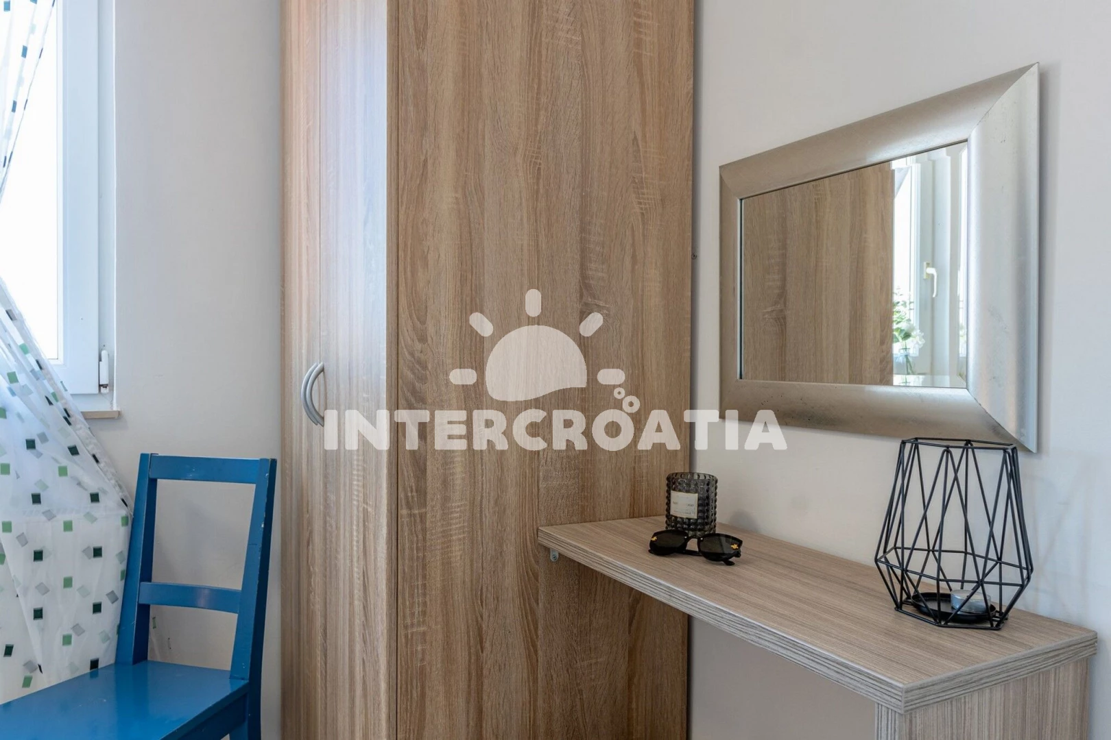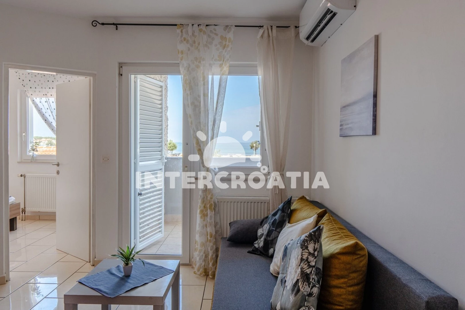 Apartmán (38 m2) s balkonem, posezením a výhledem na moře se nachází v 1. patře vily. Apartmán má 2 ložnice a je vhodný pro až 5 osob. Obývací pokoj je spojený s kuchyní. Kuchyňská linka je vybavena varnou deskou, digestoří, vestavěnou troubou, mikrovlnnou troubou, rychlovarnou konvicí, kávovarem, toustovačem, nádobím a lednicí s mrazákem. Obývací pokoj s jídelním stolem, pohovkou (rozložitelná na extra lůžko pro 1 osobu), televizí, sejfem, klimatizací a vstupem na balkon. První i druhá ložnice je vybavena vždy s jedním dvoulůžkem. Koupelna se sprchovým koutem, umyvadlem, fénem a wc. Hostům je k dispozici parkování u objektu zdarma.