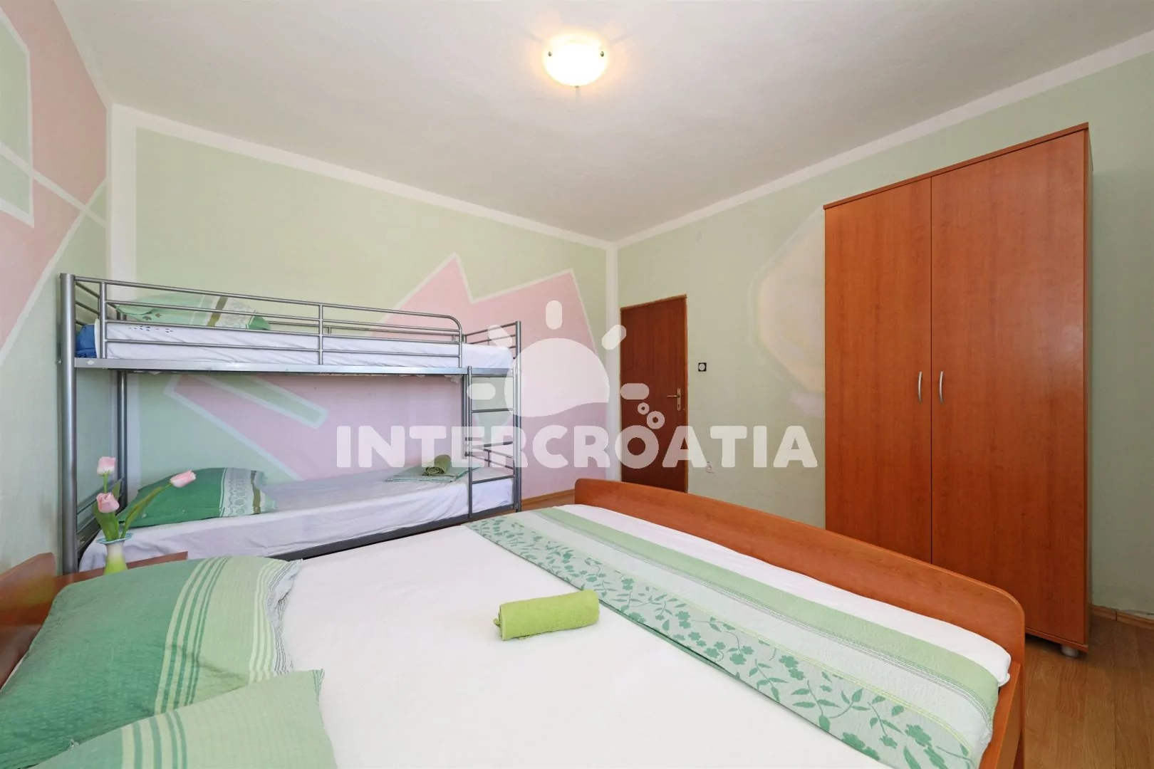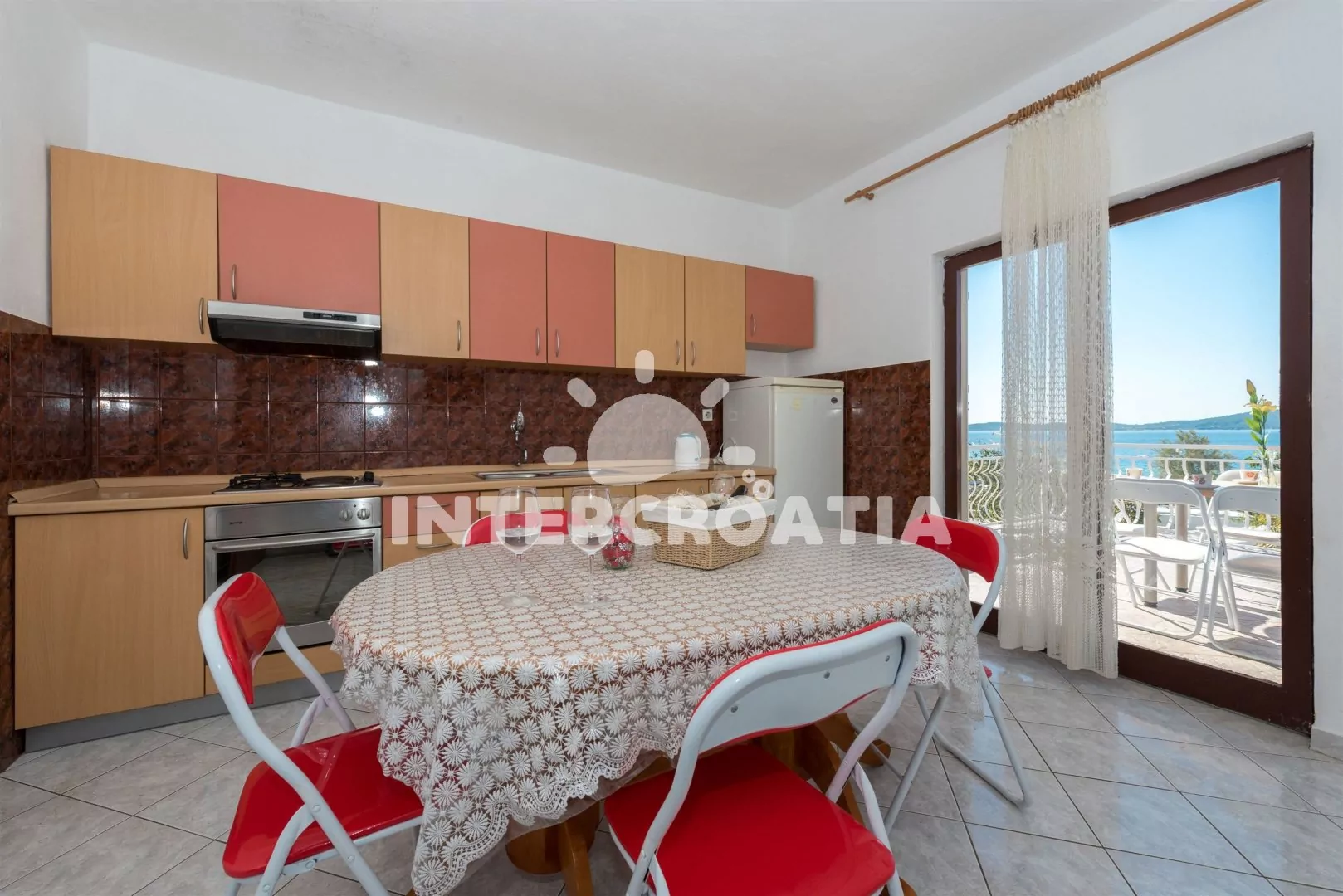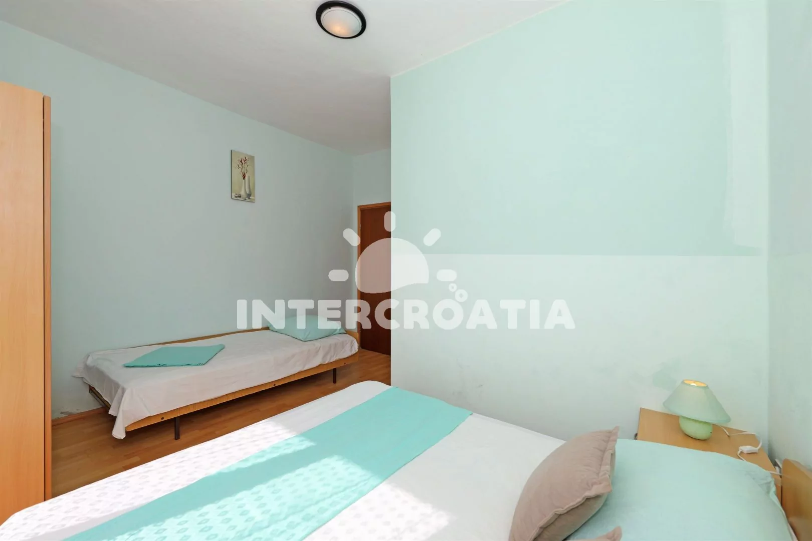 Apartmán (110 m2) v prvním patře s výhledem na moře je vhodný pro 5 až 7 osob. Kuchyň s jídelním stolem pro 5 osob, televizí se satelitním programem, kuchyňskou linkou se sporákem, digestoří, vestavěnou troubou, rychlovarnou konvicí, toustovačem, nádobím a lednicí s mrazákem. První ložnice s jedním dvoulůžkem, jedním jednolůžkem a klimatizací. Druhá ložnice s dvoulůžkem, patrovou postelí (pro 2 osoby) a klimatizací. Ze všech místností je vstup na terasu, nebo balkon. Dvě koupelny, vždy s jedním sprchovým koutem, umyvadlem a wc. Hostům je k dispozici parkování u objektu zdarma.
