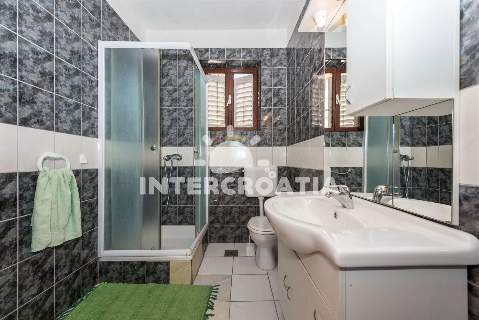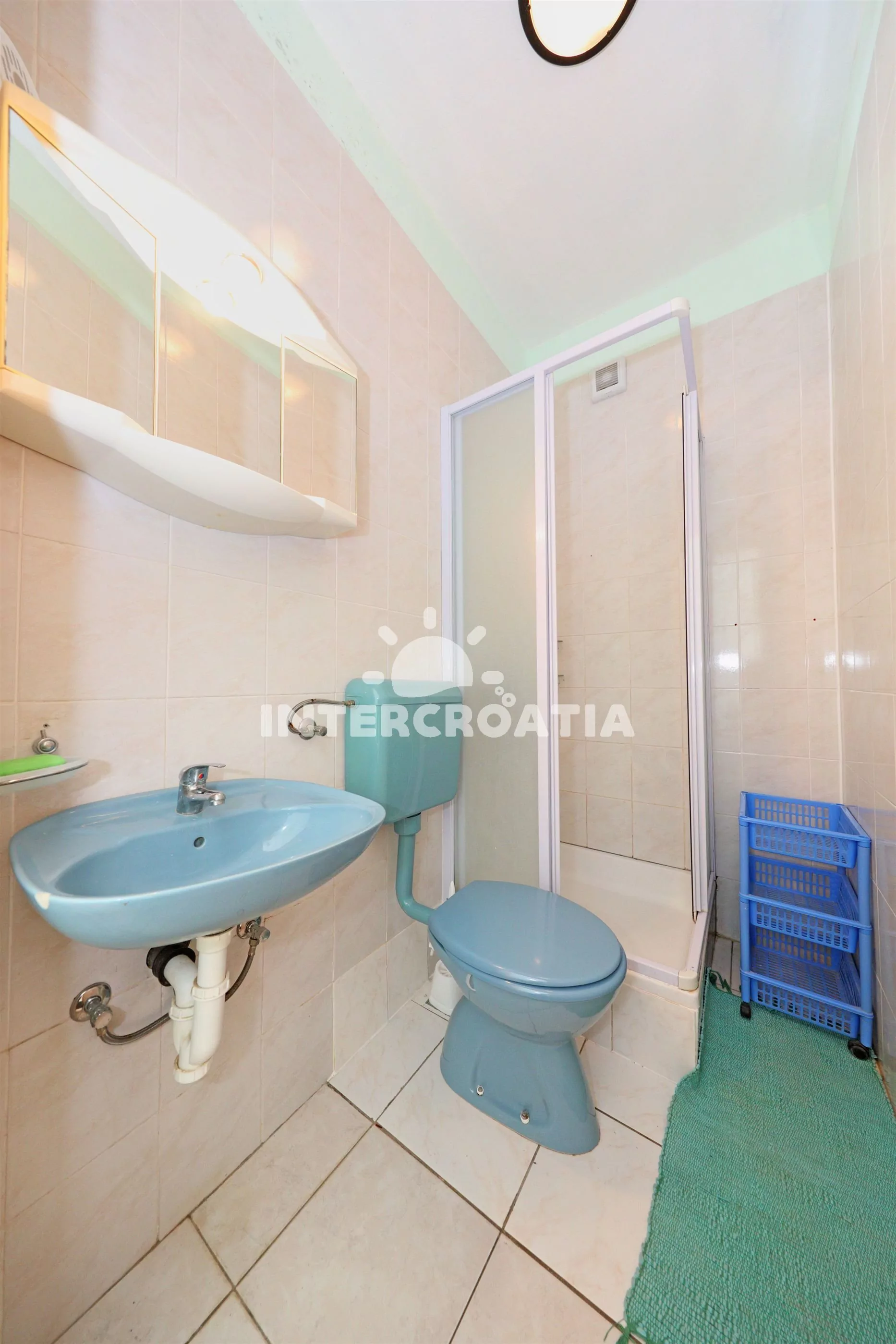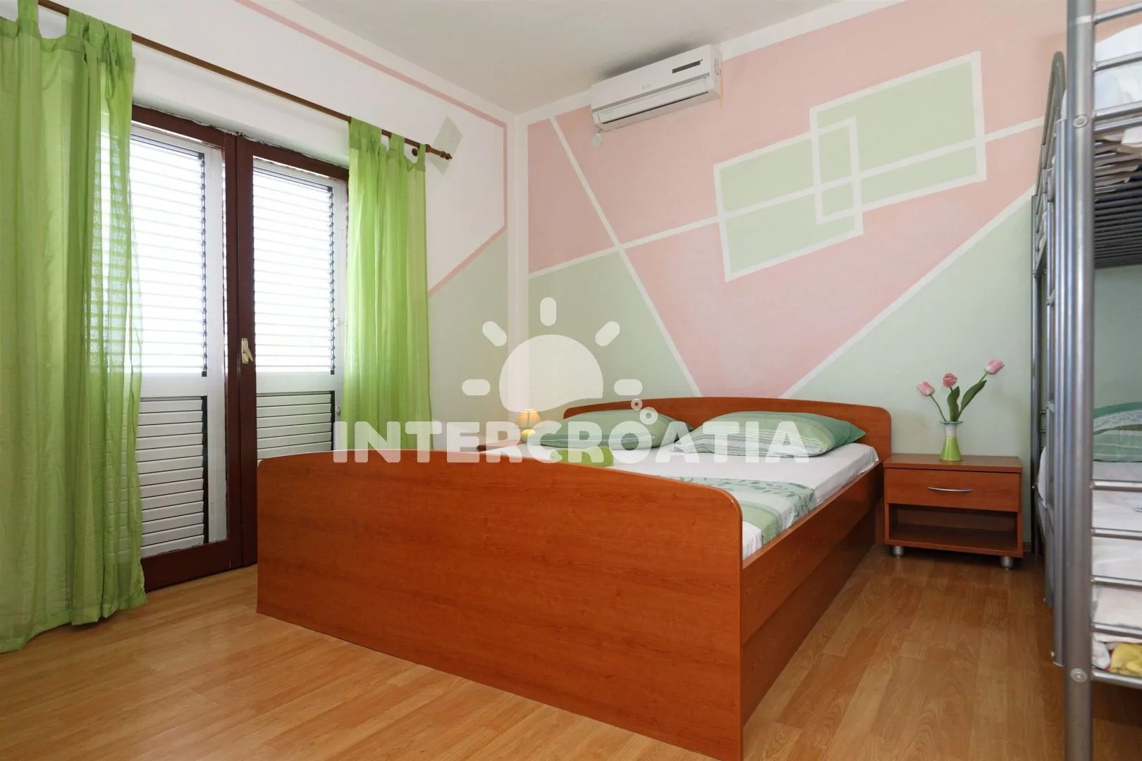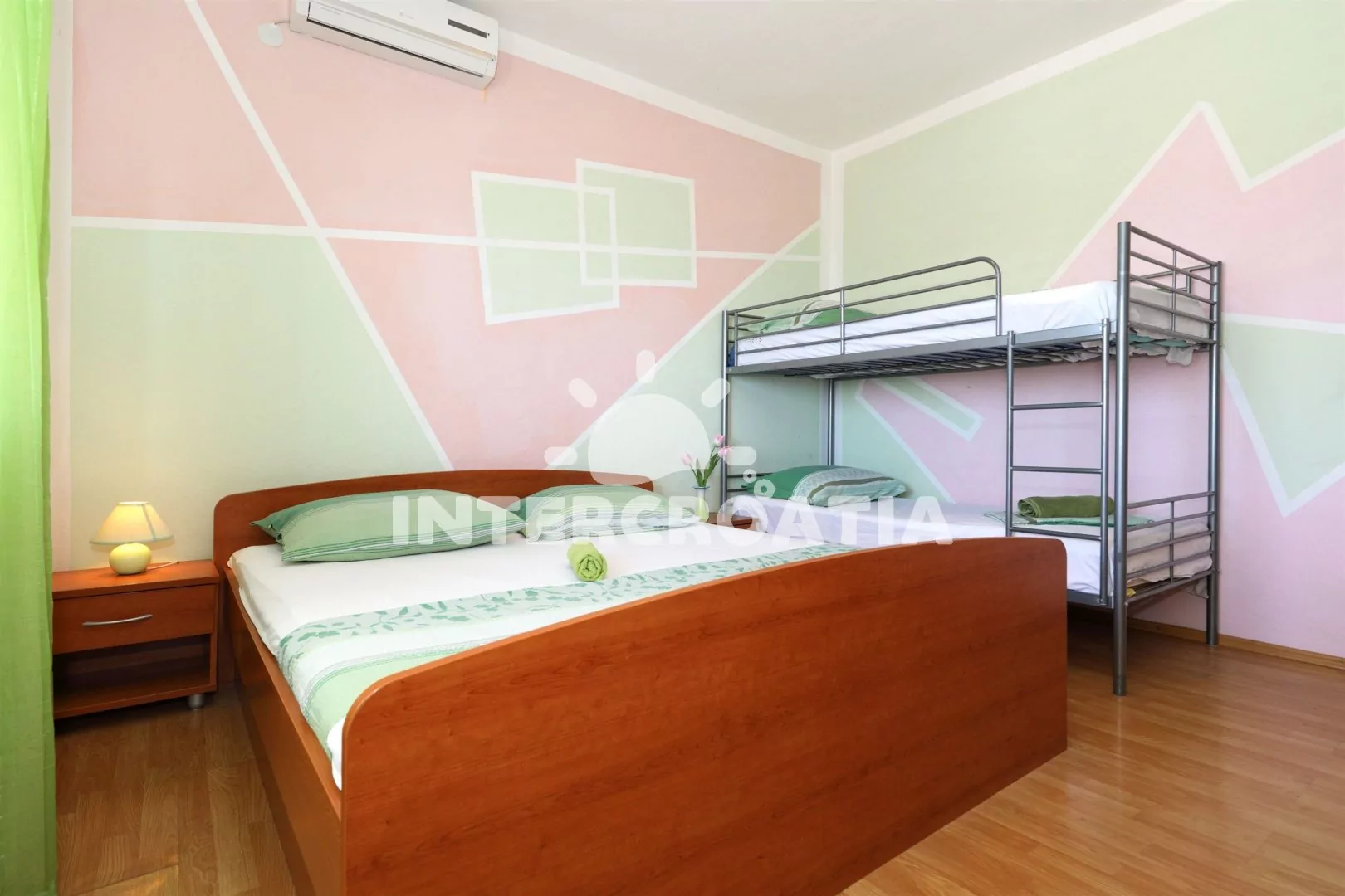 Apartmán (110 m2) v prvním patře s výhledem na moře je vhodný pro 5 až 7 osob. Kuchyň s jídelním stolem pro 5 osob, televizí se satelitním programem, kuchyňskou linkou se sporákem, digestoří, vestavěnou troubou, rychlovarnou konvicí, toustovačem, nádobím a lednicí s mrazákem. První ložnice s jedním dvoulůžkem, jedním jednolůžkem a klimatizací. Druhá ložnice s dvoulůžkem, patrovou postelí (pro 2 osoby) a klimatizací. Ze všech místností je vstup na terasu, nebo balkon. Dvě koupelny, vždy s jedním sprchovým koutem, umyvadlem a wc. Hostům je k dispozici parkování u objektu zdarma.