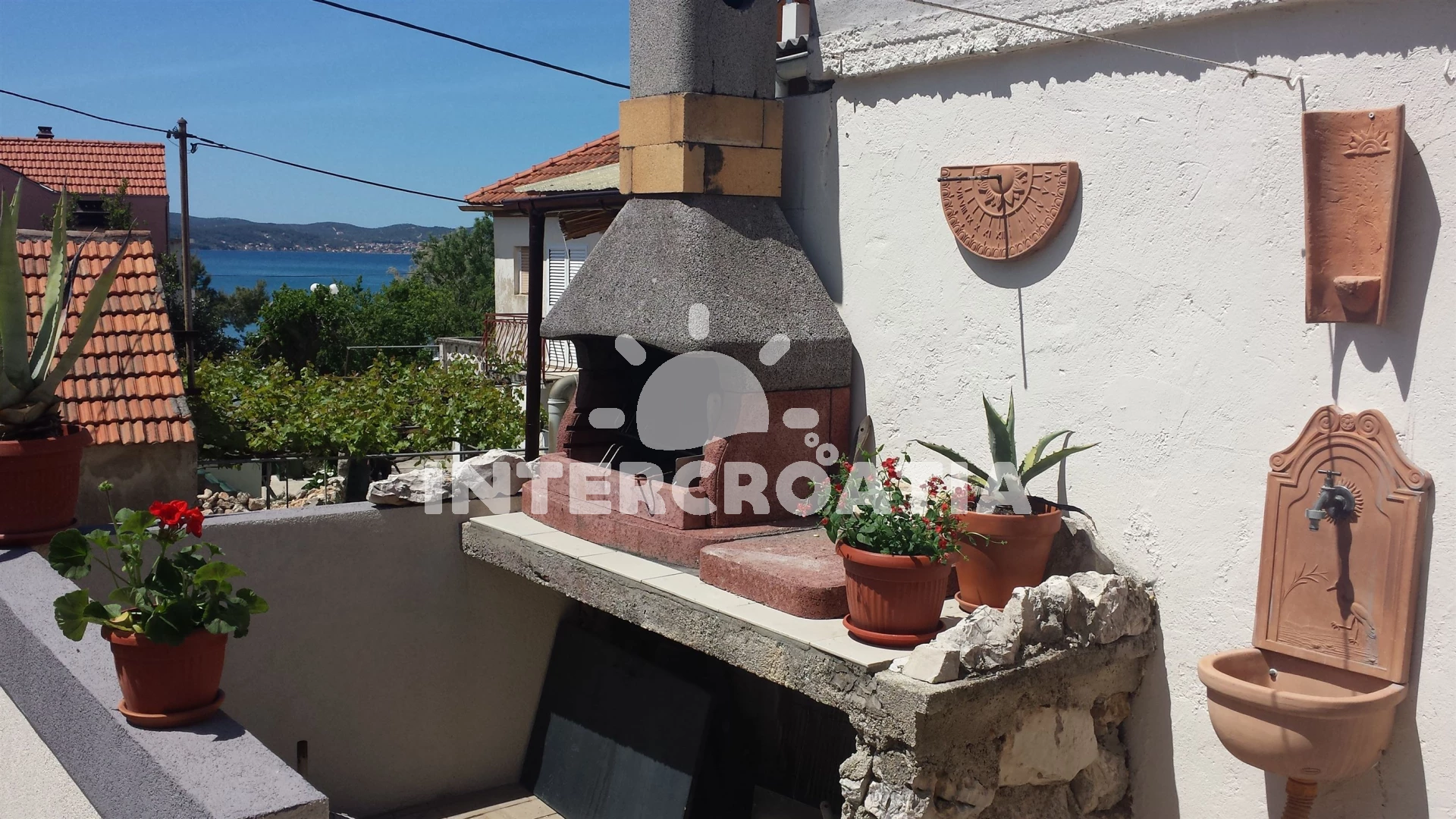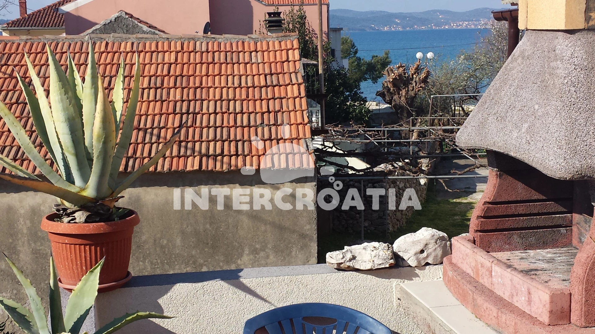 Apartmán se nachází 50 m od moře a pláže. Pláž je oblázková a betonové desky. Apartmán disponuje bazénem s lehátky pro ubytované hosty. U objektu je k dispozici společná zahrada s posezením a grilem. Parkování je před domem.