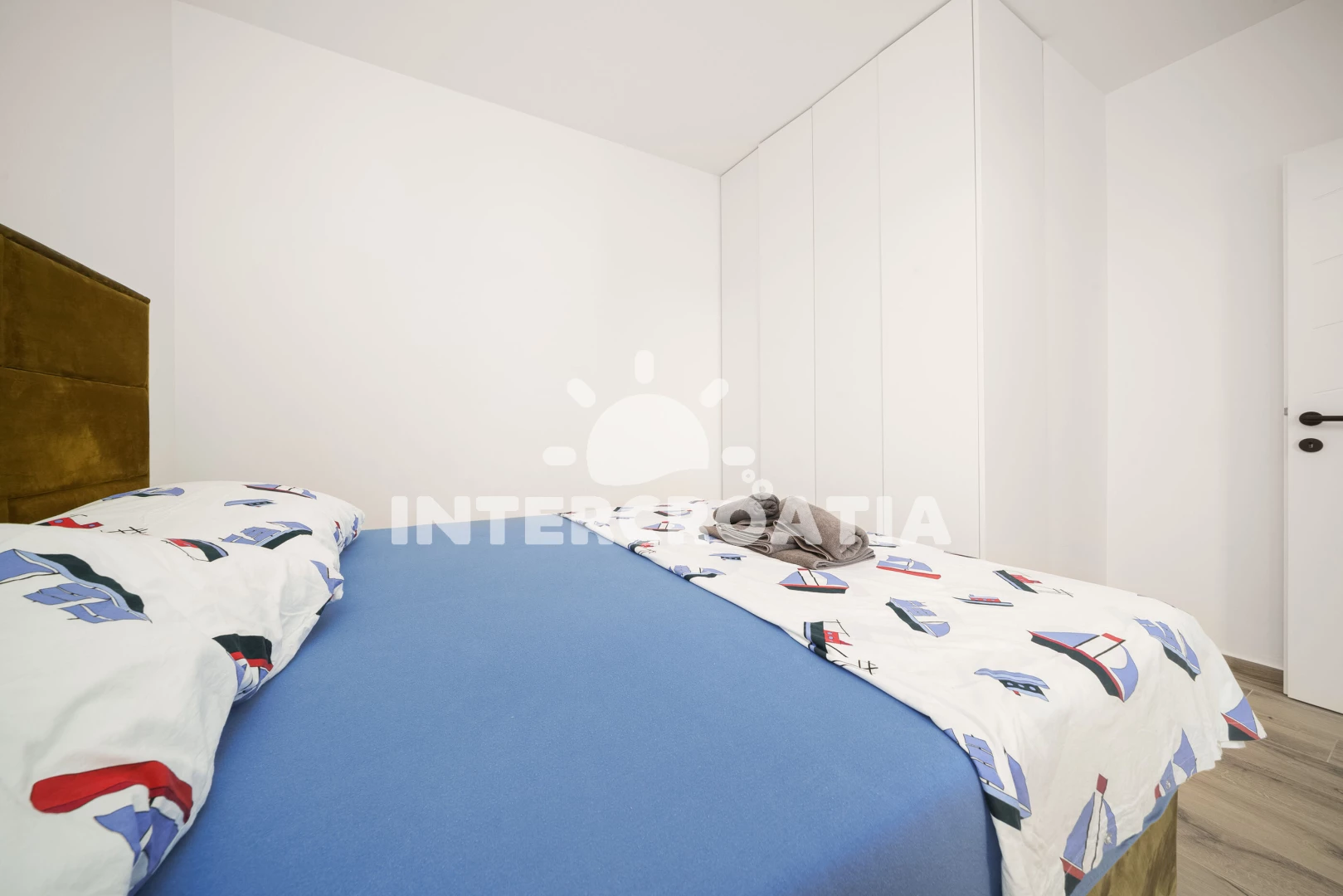 Apartmán (38 m2) s balkonem, a výhledem na moře. Nachází se v přízemí objektu. Apartmán má 1 ložnici a je vhodný pro až 4 osoby. Kuchyňská linka je vybavena varnou deskou, troubou, myčkou na nádobí, rychlovarnou konvicí, nádobím, lednicí, mrazákem. V obývací místnosti je rozložitelná pohovka (extra lůžko pro 2 osoby). K dispozici televize, žehlička. Ložnice s dvoulůžkem. Koupelna se sprchovým koutem, umyvadlem, fénem a WC.