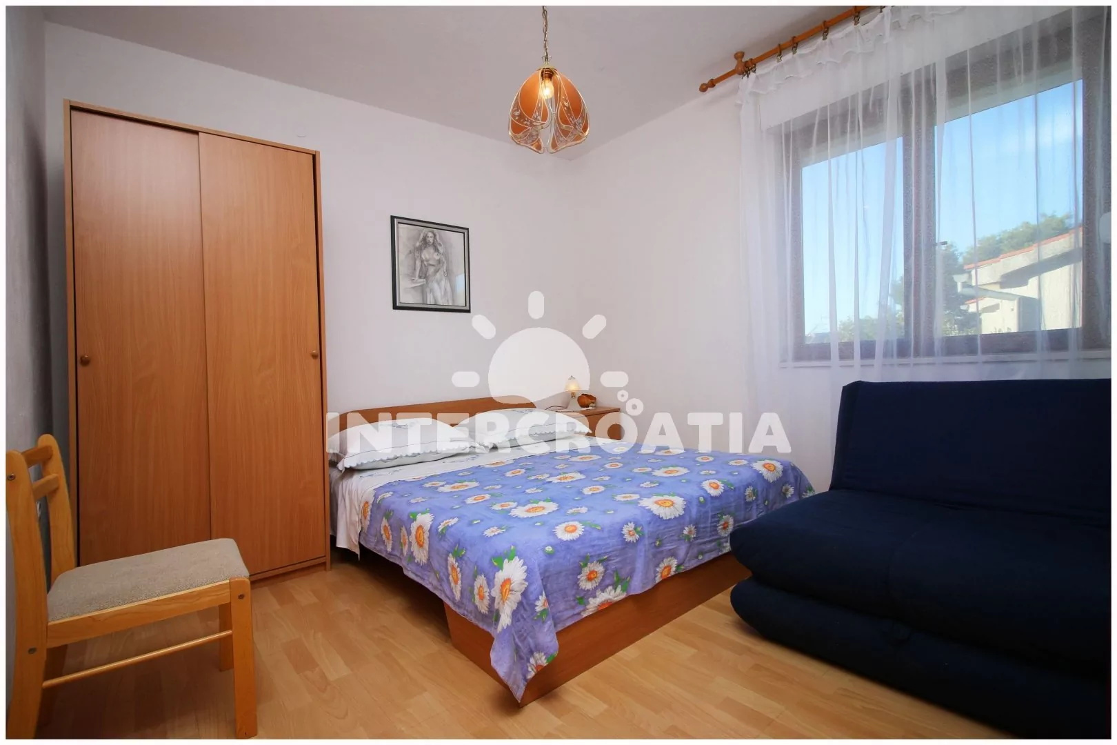 Apartmán (28 m2) s balkonem a venkovním posezením se nachází v 1. patře domu. Apartmán má 1 ložnici a je vhodný pro 2 až 3 osoby. Obývací místnost je spojena s kuchyní. Kuchyňská linka je vybavena sporákem s troubou, rychlovarnou konvicí, kávovarem, nádobím a lednicí s mrazákem. Obývací místnost s jídelním stolem, televizí se satelitním programem, rádiem, klimatizací a vstupem na balkon. Ložnice s dvoulůžkem a pohovkou (rozložitelná na extra lůžko pro 1 osobu). Koupelna se sprchovým koutem, umyvadlem a wc. Dále samostatné wc s umyvadlem. Hostům je k dispozici parkování u objektu zdarma.